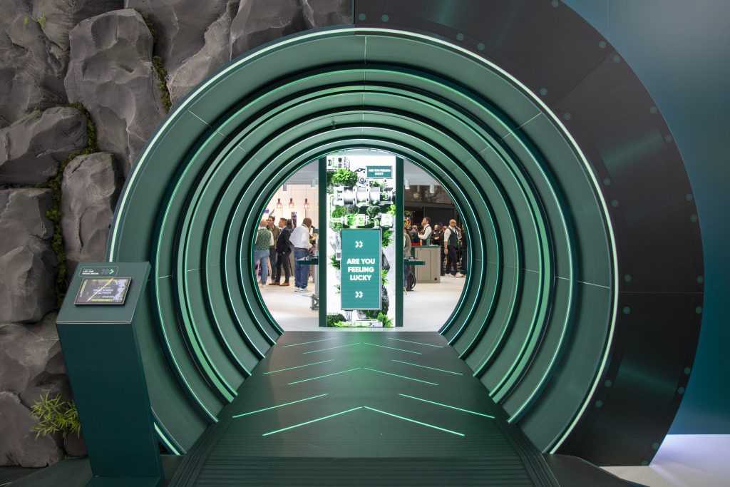 The stand introduced visitors to a series of modular environments where bematrix frame systems were used to construct display areas combining LED surfaces, lighting, and sound elements.