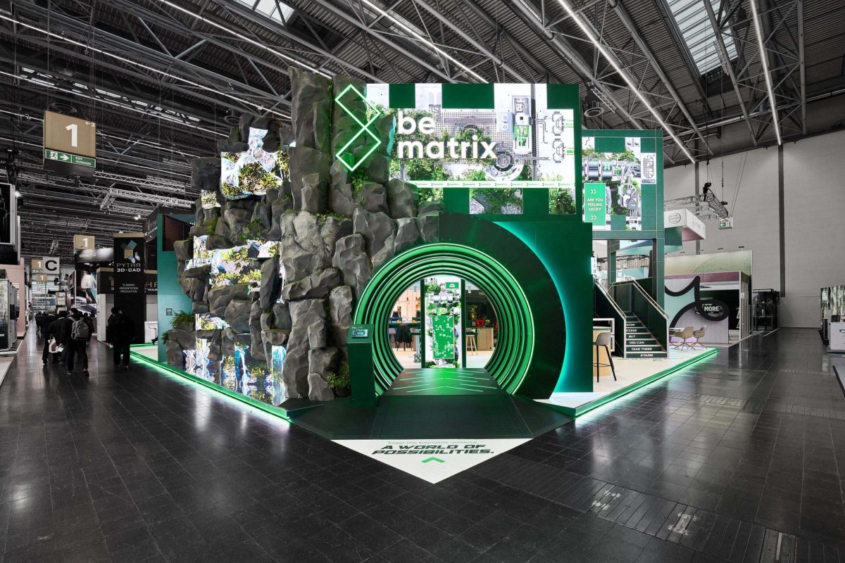 The stand introduced visitors to a series of modular environments where bematrix frame systems were used to construct display areas combining LED surfaces, lighting, and sound elements.