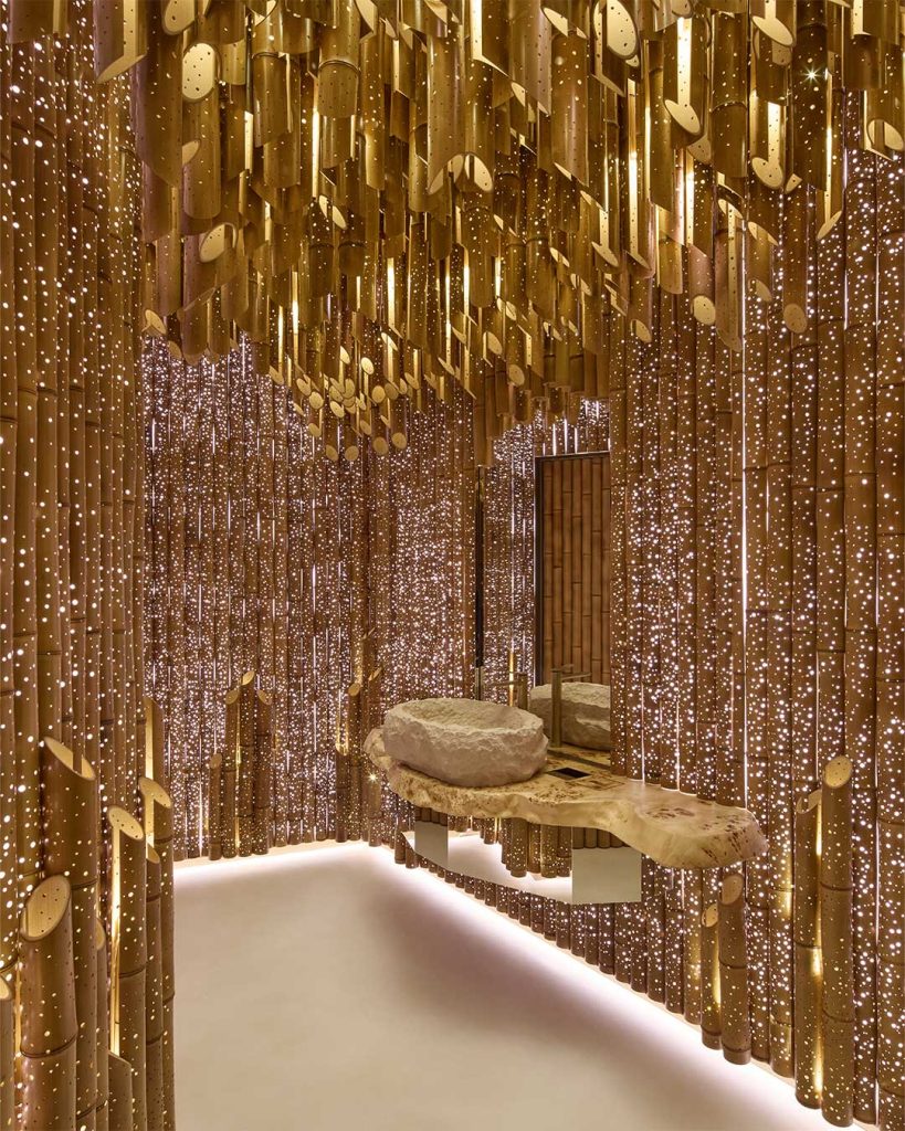 Bamboo—long revered in Japan as a symbol of resilience, purity, and harmony—becomes both material and metaphor. Gold-dipped vertical elements echo the rhythms of bamboo forests while subtly recalling the grandeur of French decorative traditions. Inside, Versailles parquet flooring meets washi-paper walls and lanterns crafted by Kojima Shoten, creating a layered dialogue between French savoir-faire and Japanese craftsmanship.