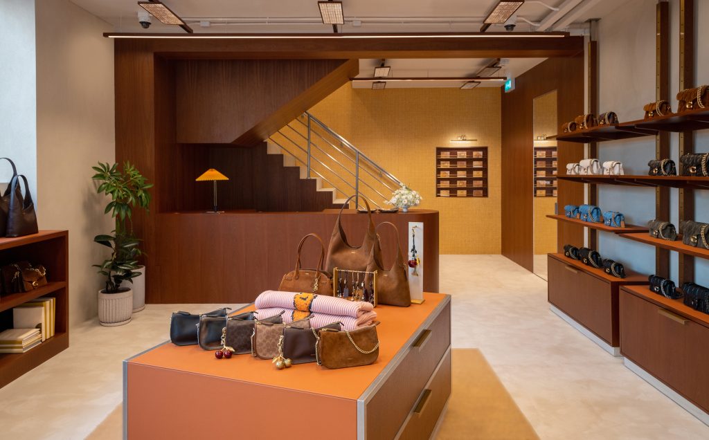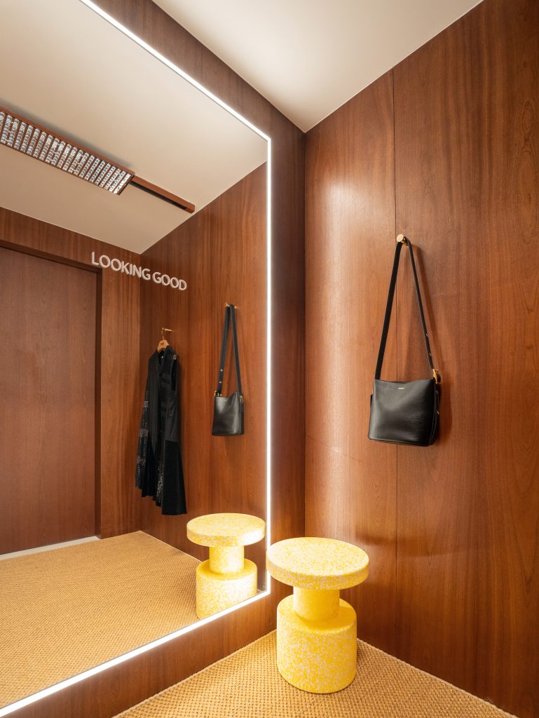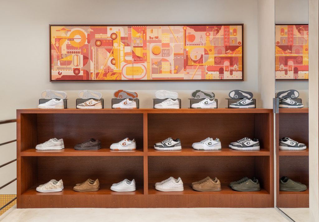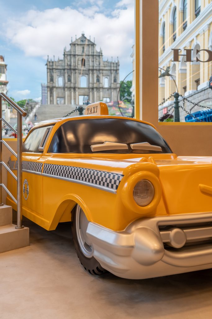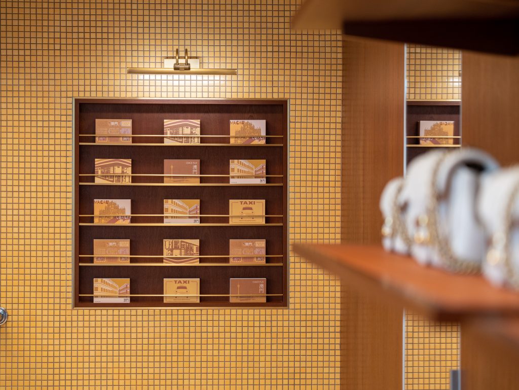 Located in Pátio Fu Van, the space celebrates the rich cultural texture of Macau with a playful Coach twist, reimagining 1970s Milanese architecture through oversized objects, vibrant colors, and experiential activations. Industrial and avant-garde styles come together to create a functional yet artistic environment featuring textured wooden screens, contrasting materials, and locally inspired tilework reflecting Macau’s unique Portuguese influence. A playful nod to the house’s city roots, visitors can find an iconic New York taxi is displayed across both floors, The space’s bright yellow palette—echoed throughout Macau’s architecture—is balanced with natural wood tones for a dynamic atmosphere.