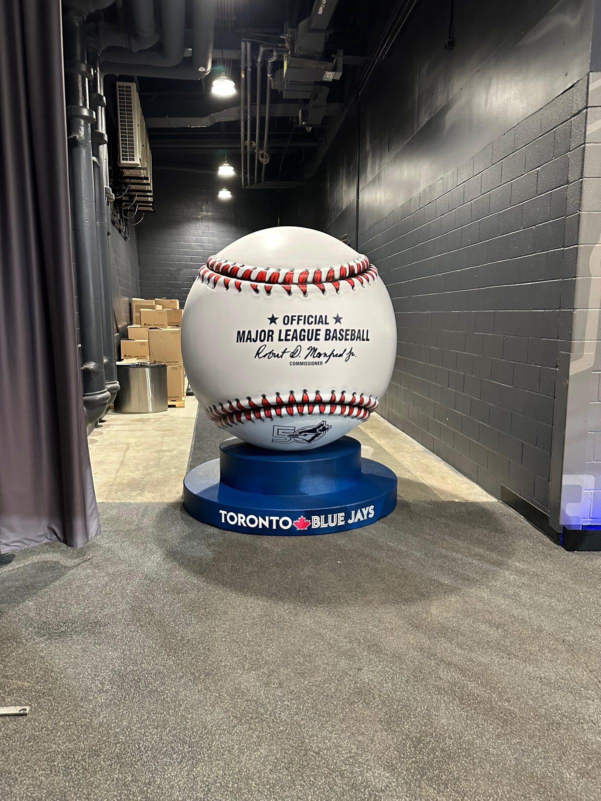 At the heart of the experience stands a monumental 6-foot diameter baseball — a custom-engineered sculptural centerpiece with a specially textured surface designed for immersive interaction. This oversized baseball isn’t just a visual spectacle; it invites visitors to step into a larger-than-life moment, blending tactile design with experiential storytelling to honor 50 years of Blue Jays history.