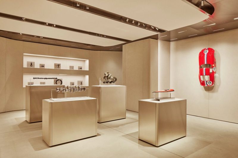 - Leather accents and sculptural installations reference the interiors of its iconic cars
