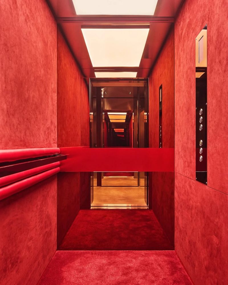 The result is an immersive environment where industrial materials—steel, aluminum, and concrete—collide with polished luxury details and the unmistakable pulse of Ferrari red. The historic Queen Anne-style façade remains intact, creating a striking contrast between heritage architecture and a future-facing interior.