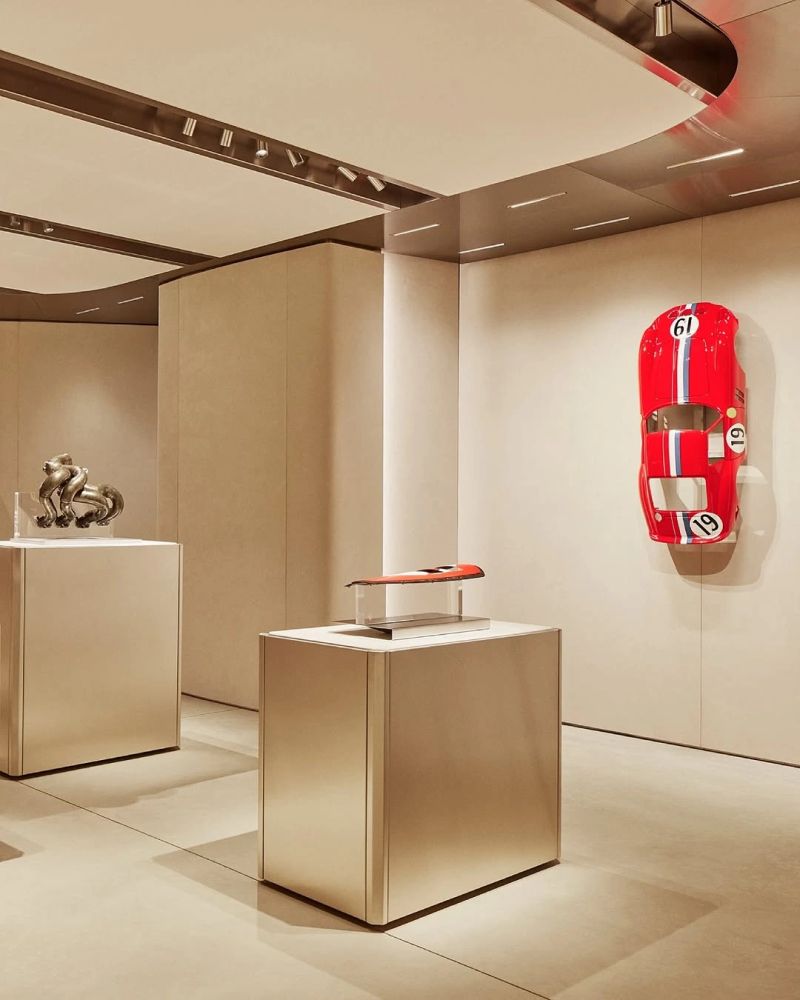 - Glass and aluminum vitrines echo the technical precision of Ferrari engineering