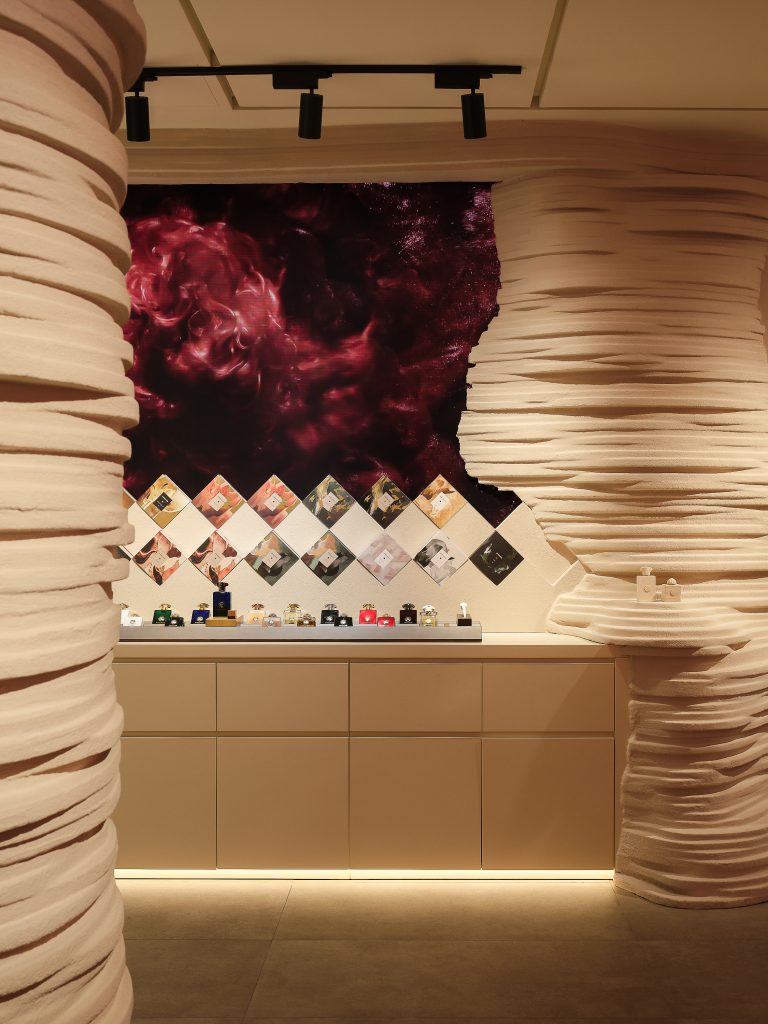 Rather than a typical high-density retail layout, the Seoul interior emphasizes a narrative of exploration and discovery. Drawing on the rugged landscapes and cultural motifs of Oman — the birthplace of the perfume house — the space combines sculptural forms with a warm, earthy palette to create a calming backdrop that feels both refined and culturally resonant. Stone textures, geometric profiles, and soft, flowing lines evoke mountain ridges and traditional falaj watercourses, guiding visitors through an environment that feels more like a sanctuary than a boutique.