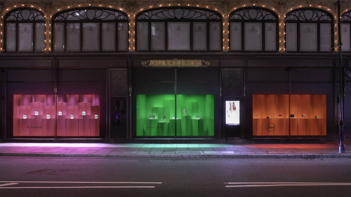 Harrods has unveiled a striking series of technology-themed windows designed by Harlequin Design, transforming the iconic Knightsbridge façade into a vibrant showcase of innovation and luxury. Each window is bathed in a bold gradient of color—radiant pink, vivid green, and deep red—creating a visually rhythmic display that draws attention even from afar. The installation highlights a curated selection of premium tech brands, including Therabody, Bang & Olufsen, and Leica, each presented in its own immersive monochromatic world.