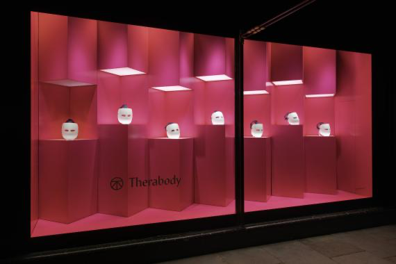 Harlequin Design’s approach is minimalist yet dramatically theatrical. Products are displayed on tiered plinths within sculptural backdrops, allowing each item to appear as a collectible object of desire rather than just a functional device. The lighting is essential to the narrative—soft diffused glows and uplighting enhance depth and shadow, while the saturated color palettes create strong moods for each brand: wellness and recovery in pink for Therabody, innovation and clarity in green for Bang & Olufsen, and precision craftsmanship in passionate red for Leica.