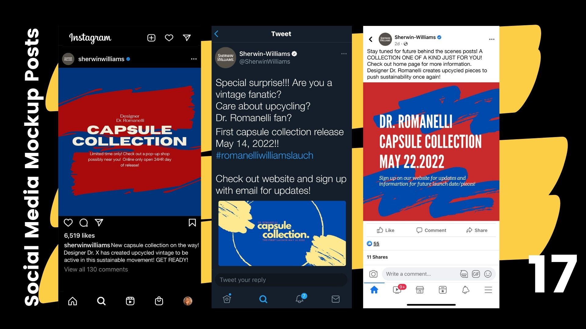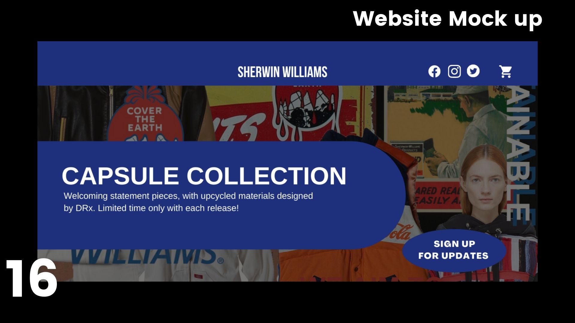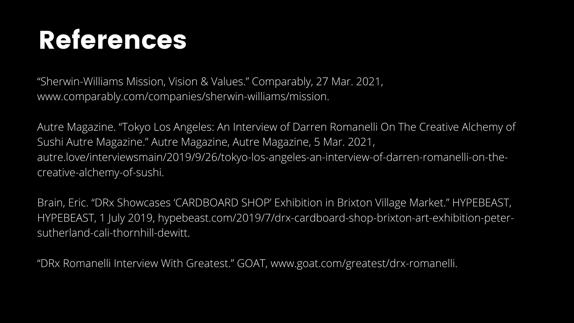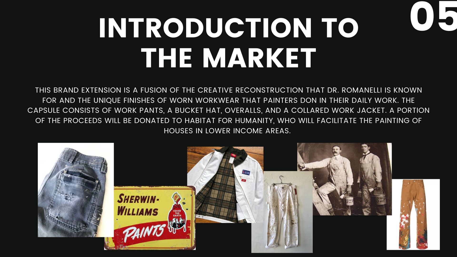 Created a brand extension for Sherwin-Williams with designer Darren Romanelli in a 4 person group. Combined an established fashion designer with an unconventional brand to create a collection of sustainable designs for a capsule collection. Explored how we would introduce a paint company to three different markets: Detroit, LA, and Tokyo, and analyzed why it would work.