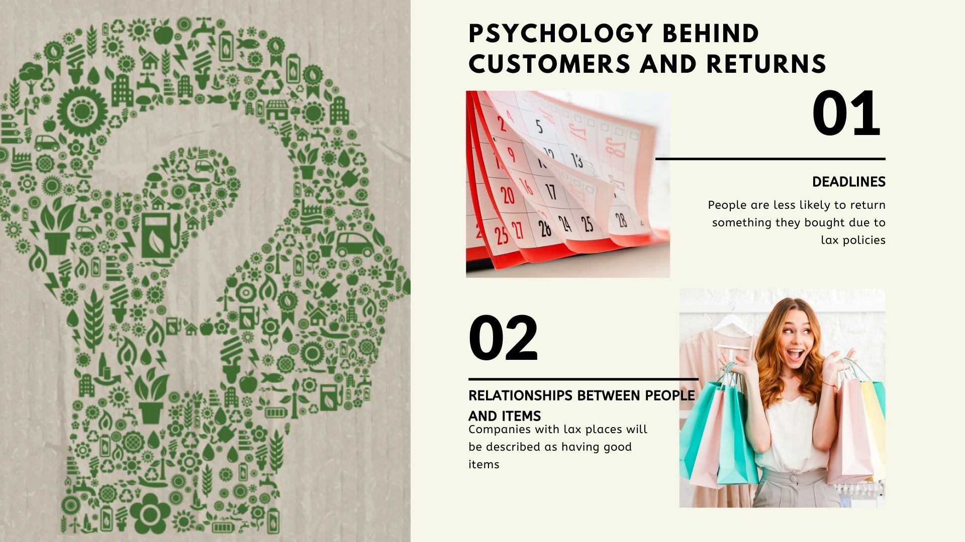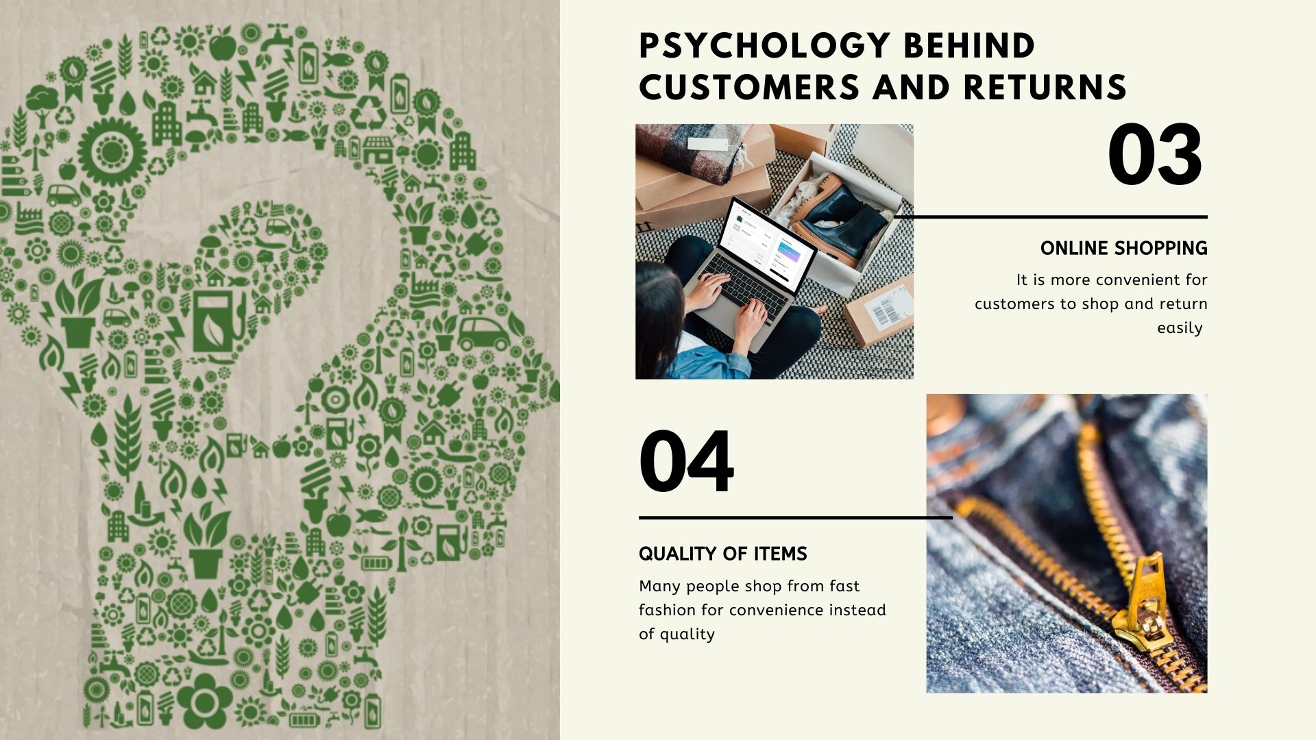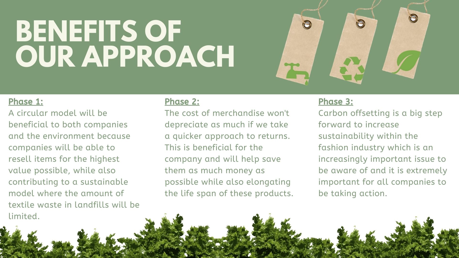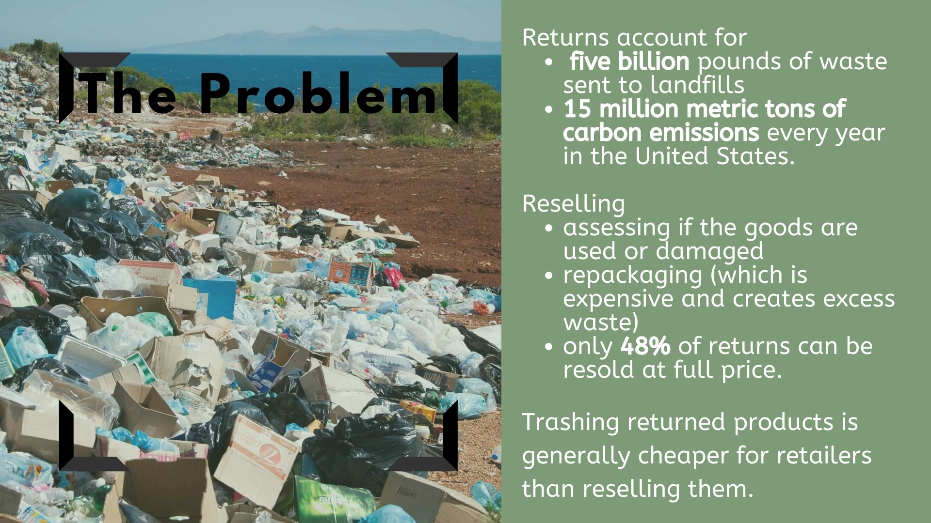 Our project pitches the implementation of an eco-friendly return system that brands can partner with to cut down on CO2e. The returns system accounts for a large amount of waste and pollution. We found that corporations will not rework their current return systems to be more sustainable unless they see financial gain. Our project looks at the reverse supply chain system holistically to find solutions for environmental and economic losses. We outline the stages of our eco-friendly approach, partnerships that align with our mission, and give implementation strategy examples of potential clients. With Chloe Barker, Sadira Hayes, Lauren Peruta, Jocelyn Harrison, Elisabeth Bracco.