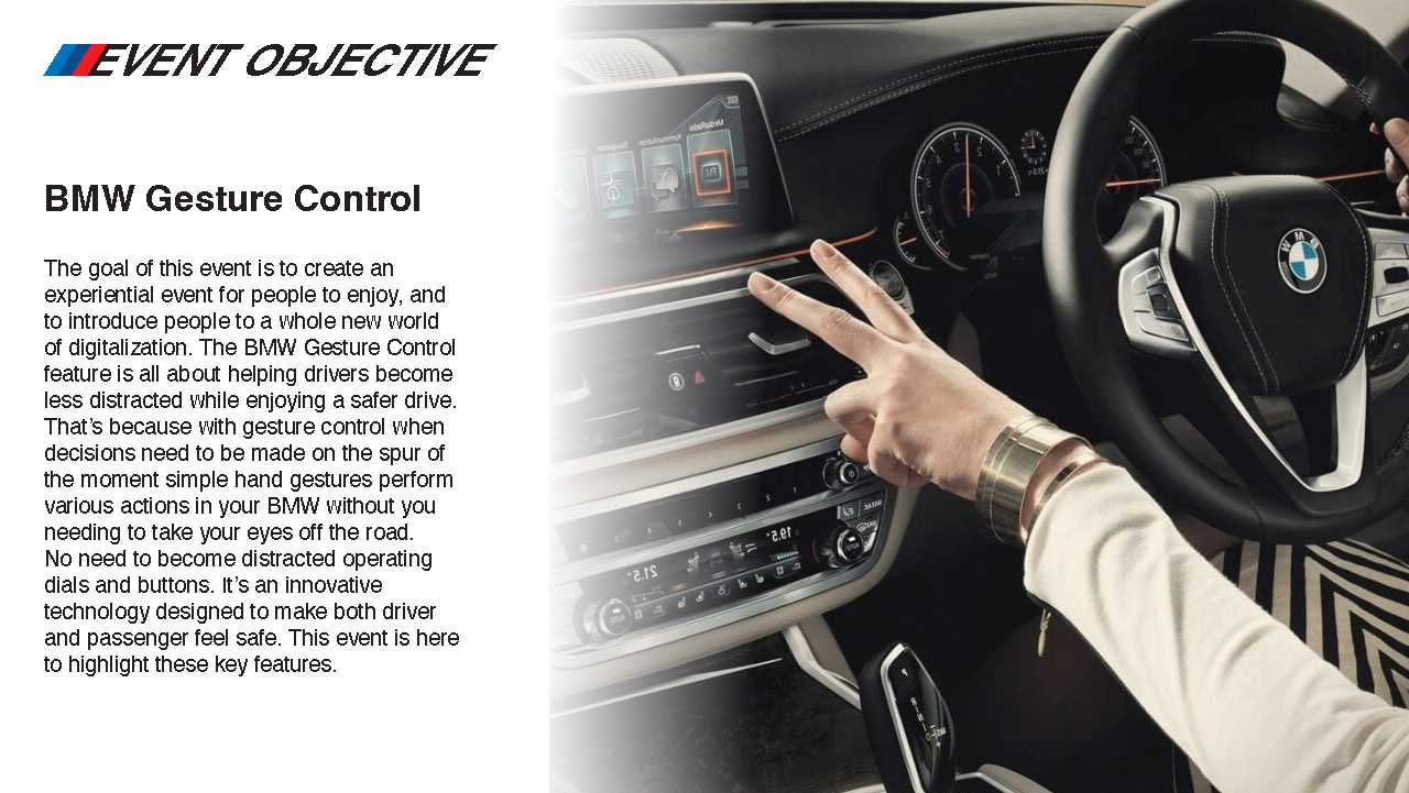 The goal of this event is to create an experiential event for people to enjoy, and to introduce people to a whole new world of digitalization. The BMW Gesture Control feature is all about helping drivers become less distracted while enjoying a safer drive. That’s because with gesture control when decisions need to be made on the spur of the moment simple hand gestures perform various actions in your BMW without you needing to take your eyes off the road. No need to become distracted operating dials and buttons. It’s an innovative technology designed to make both driver and passenger feel safe. This event is here to highlight these key features.