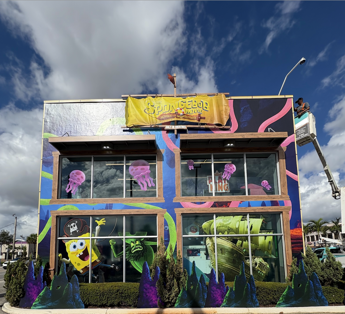 Duggal produced and installed more than 10,000 square feet of large-format printed graphics, including a full exterior building wrap, immersive interior visuals, and the engineering and fabrication of a 24-foot-tall SpongeBob structure. The installation also featured a sculptural wooden sailing ship and oversized flying SpongeBob character elements, precision-cut from steel and finished with dimensional detailing and wrapped with real rope for added texture and realism.
