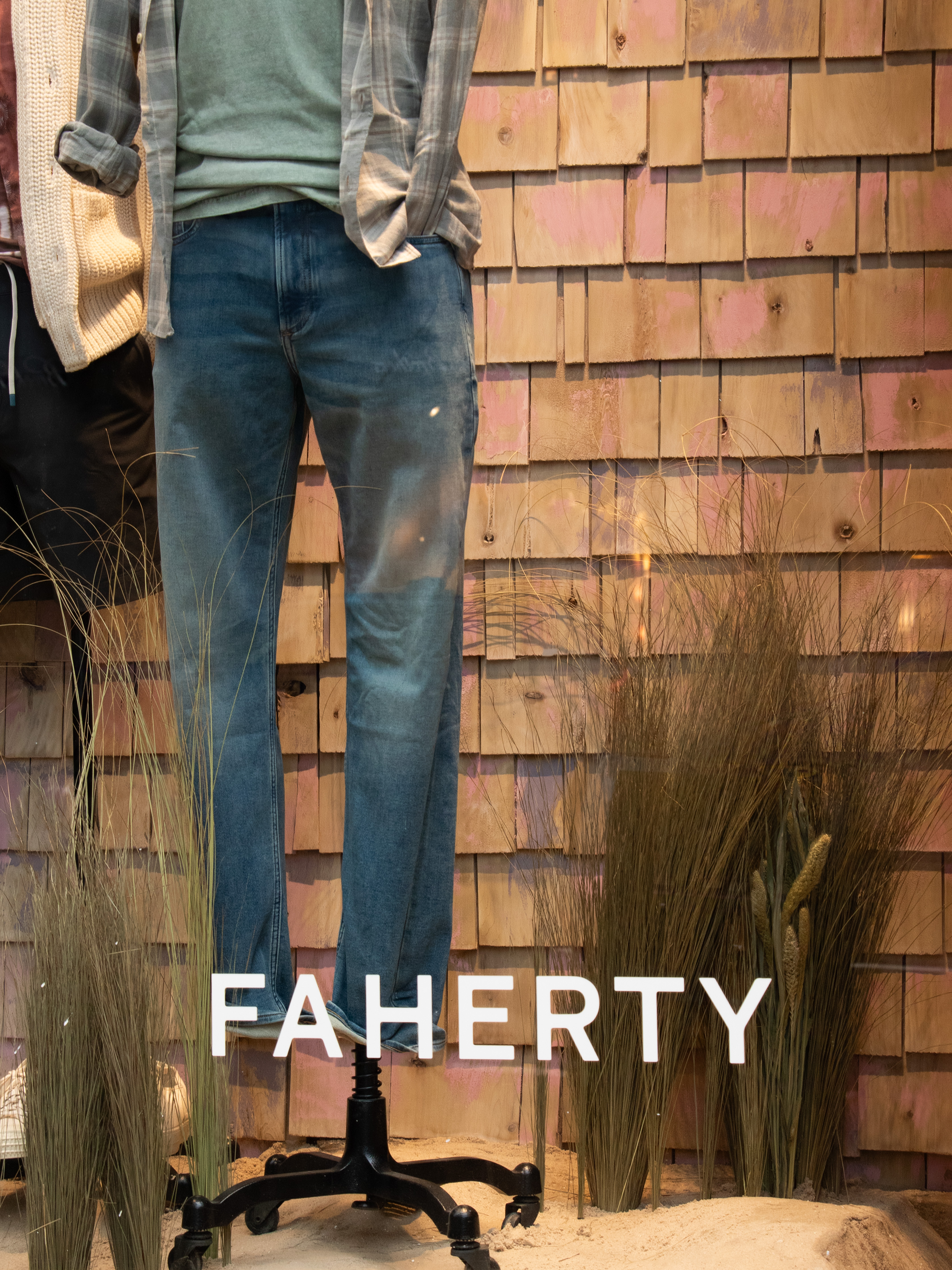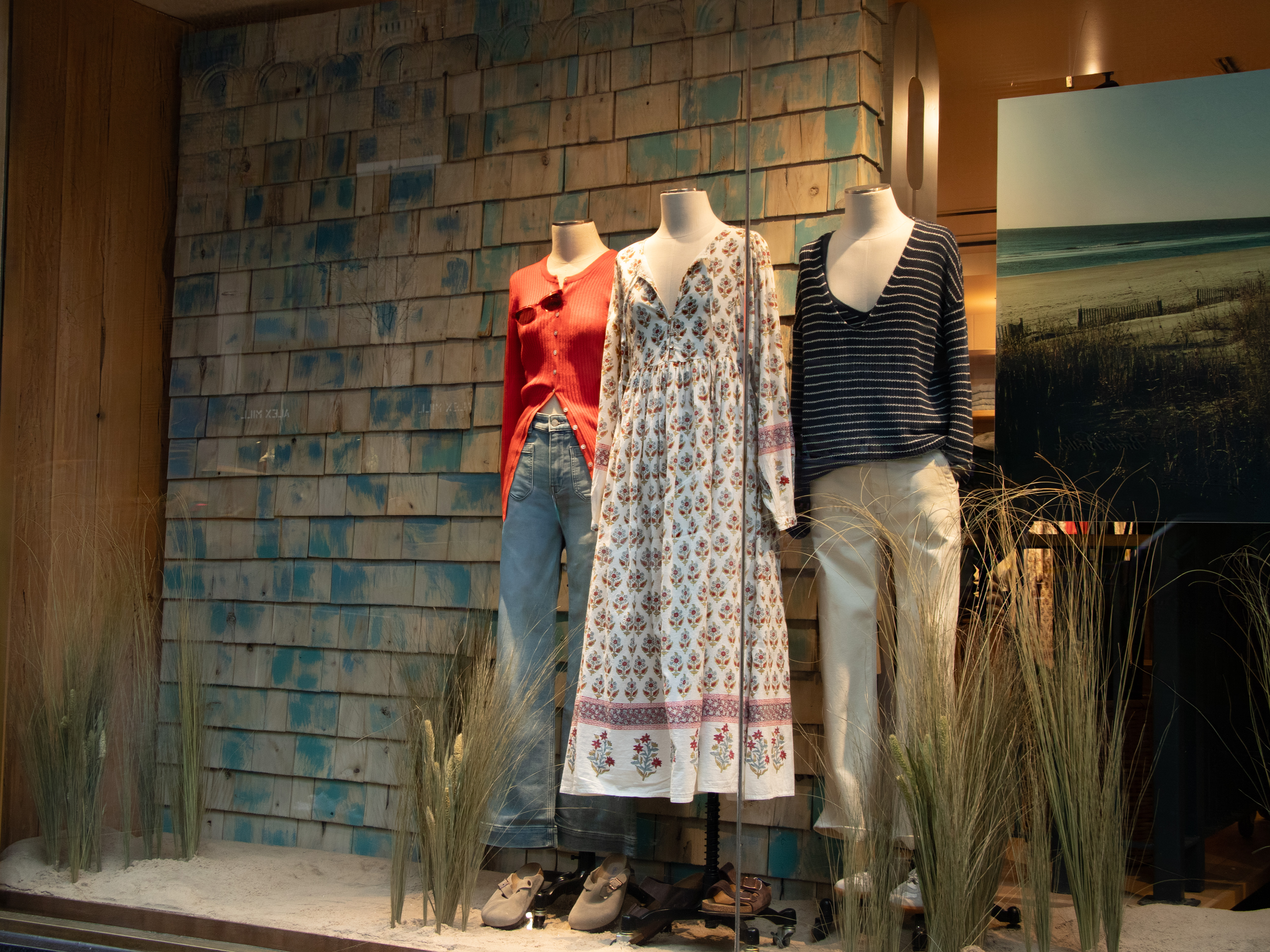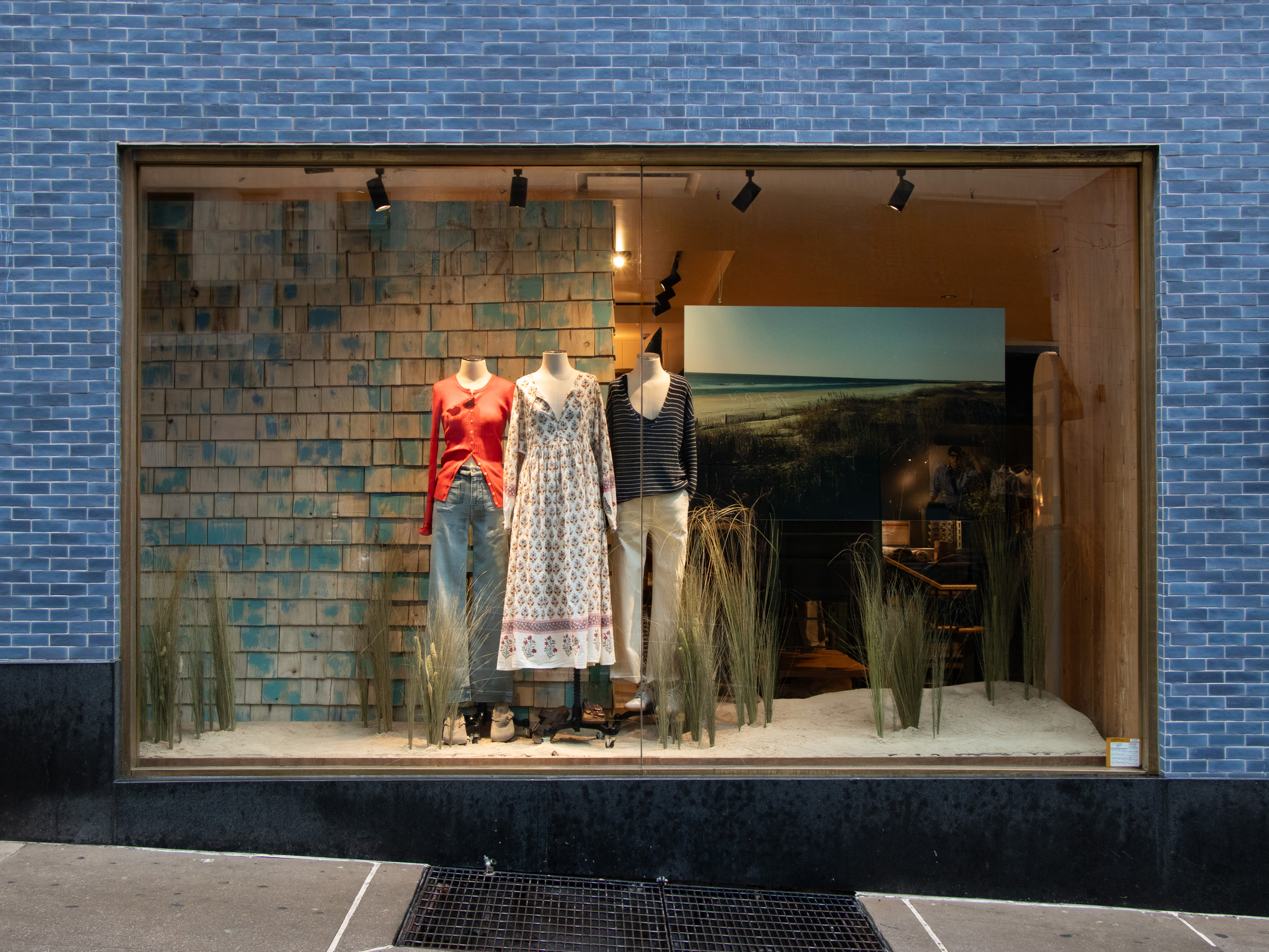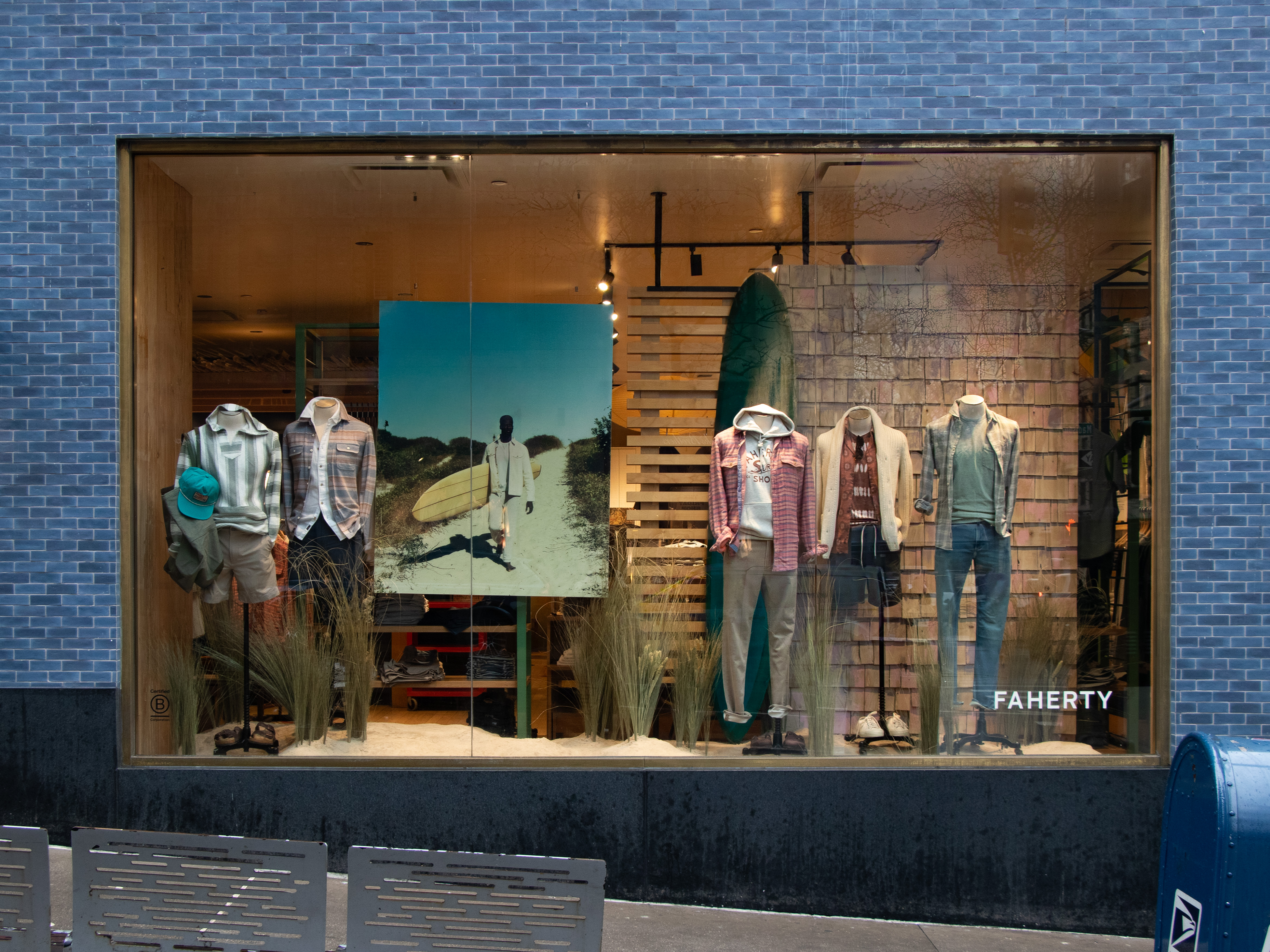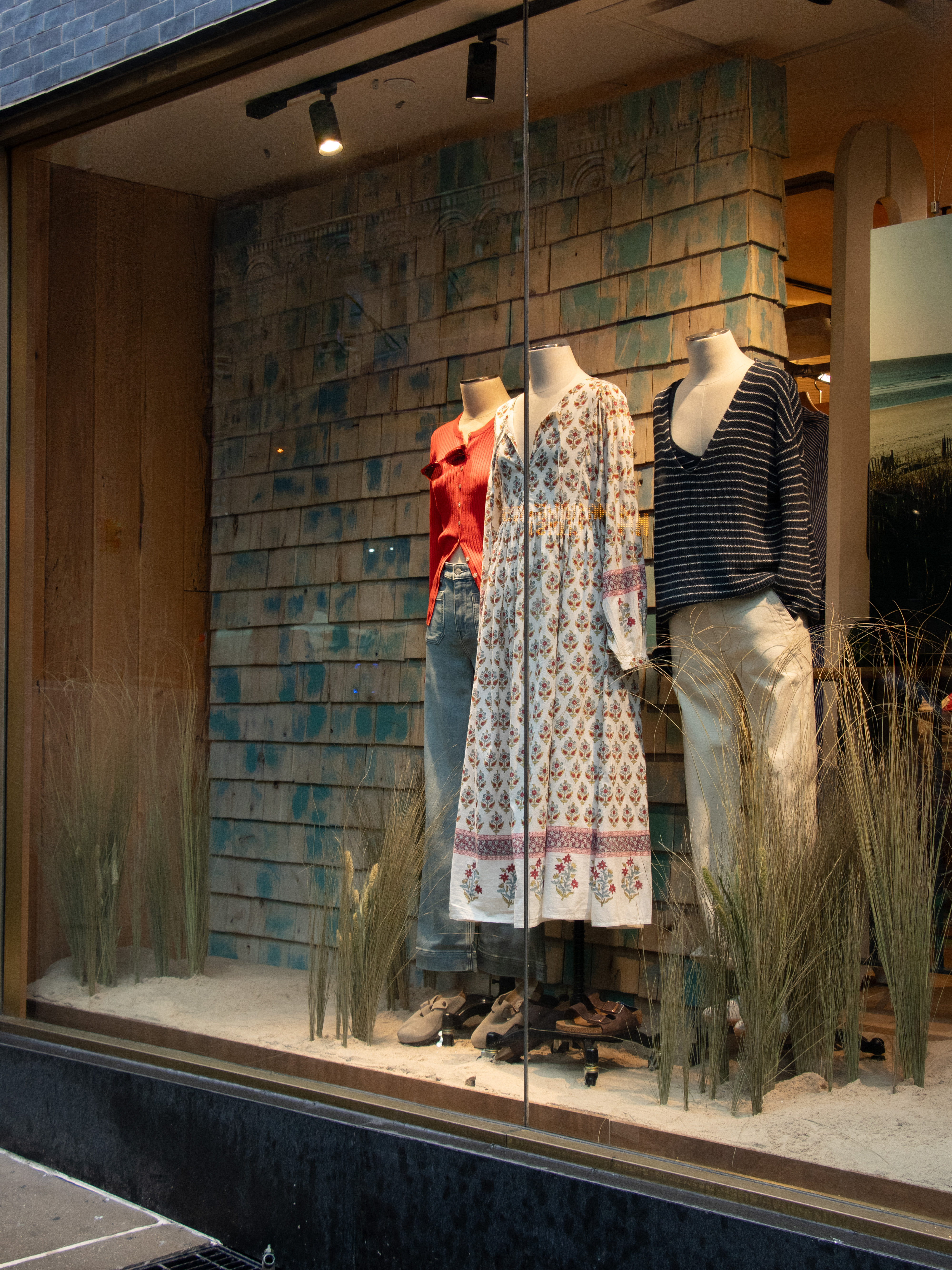 Inspired by the surf culture of the Carolinas, this window captures Faherty’s signature sense of coastal ease through sun-faded shingles, dune grasses, and soft sand textures. Rooted in craftsmanship and a laid-back lifestyle, the installation reflec... See More
