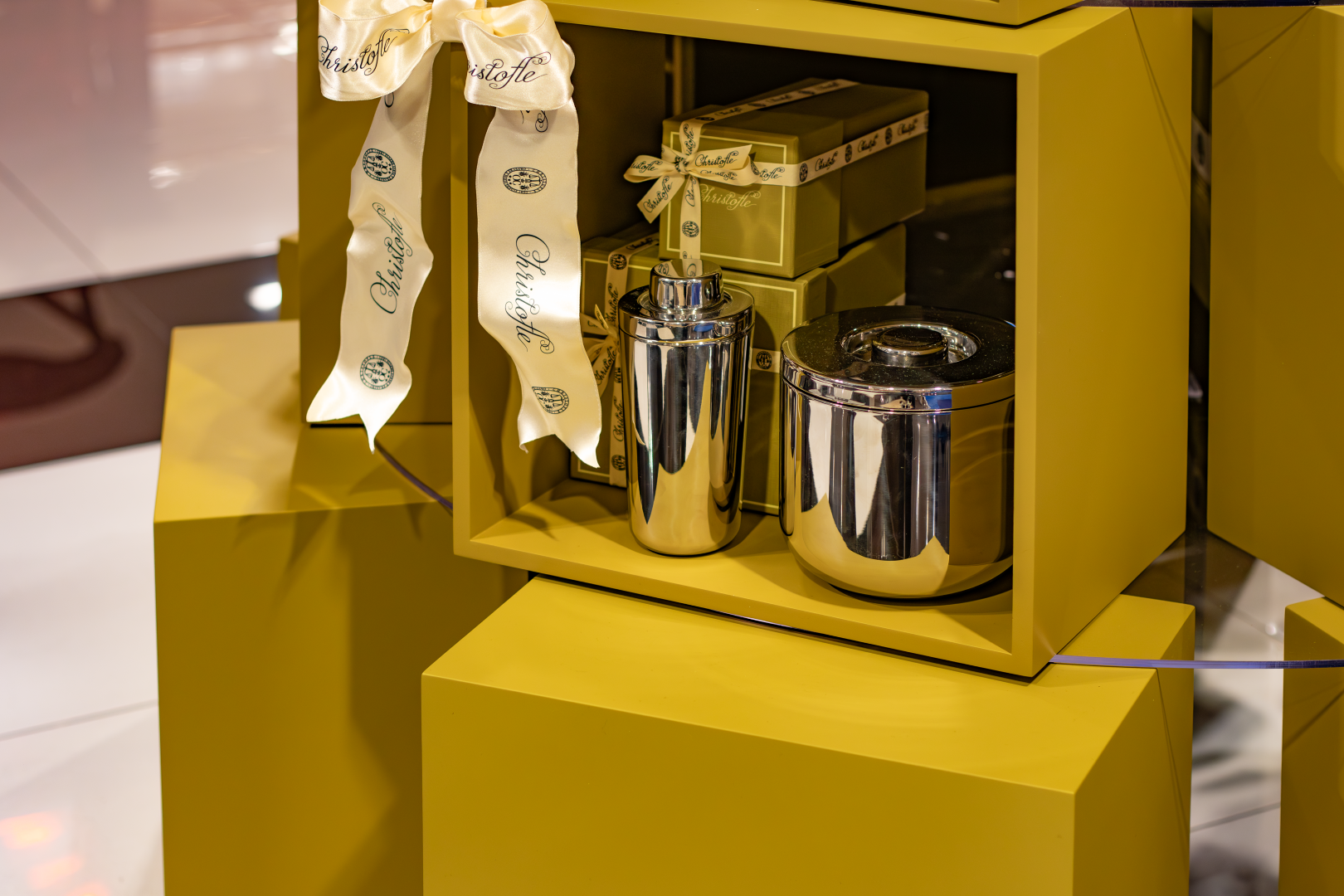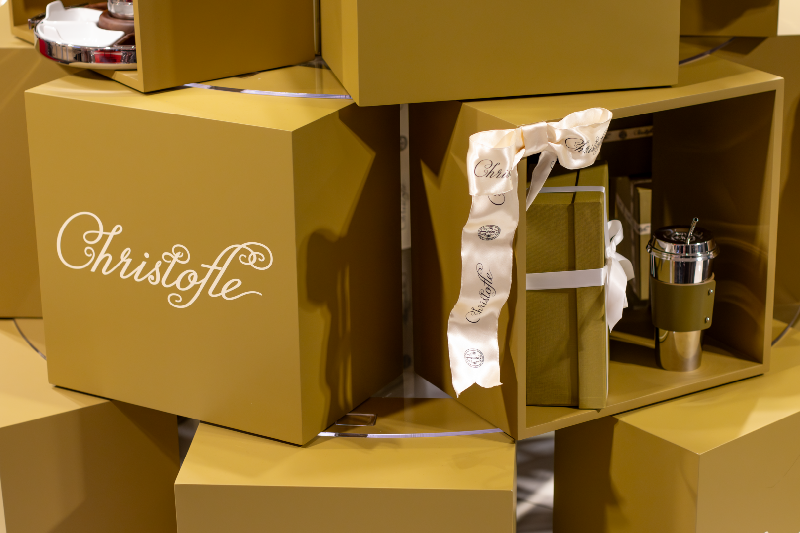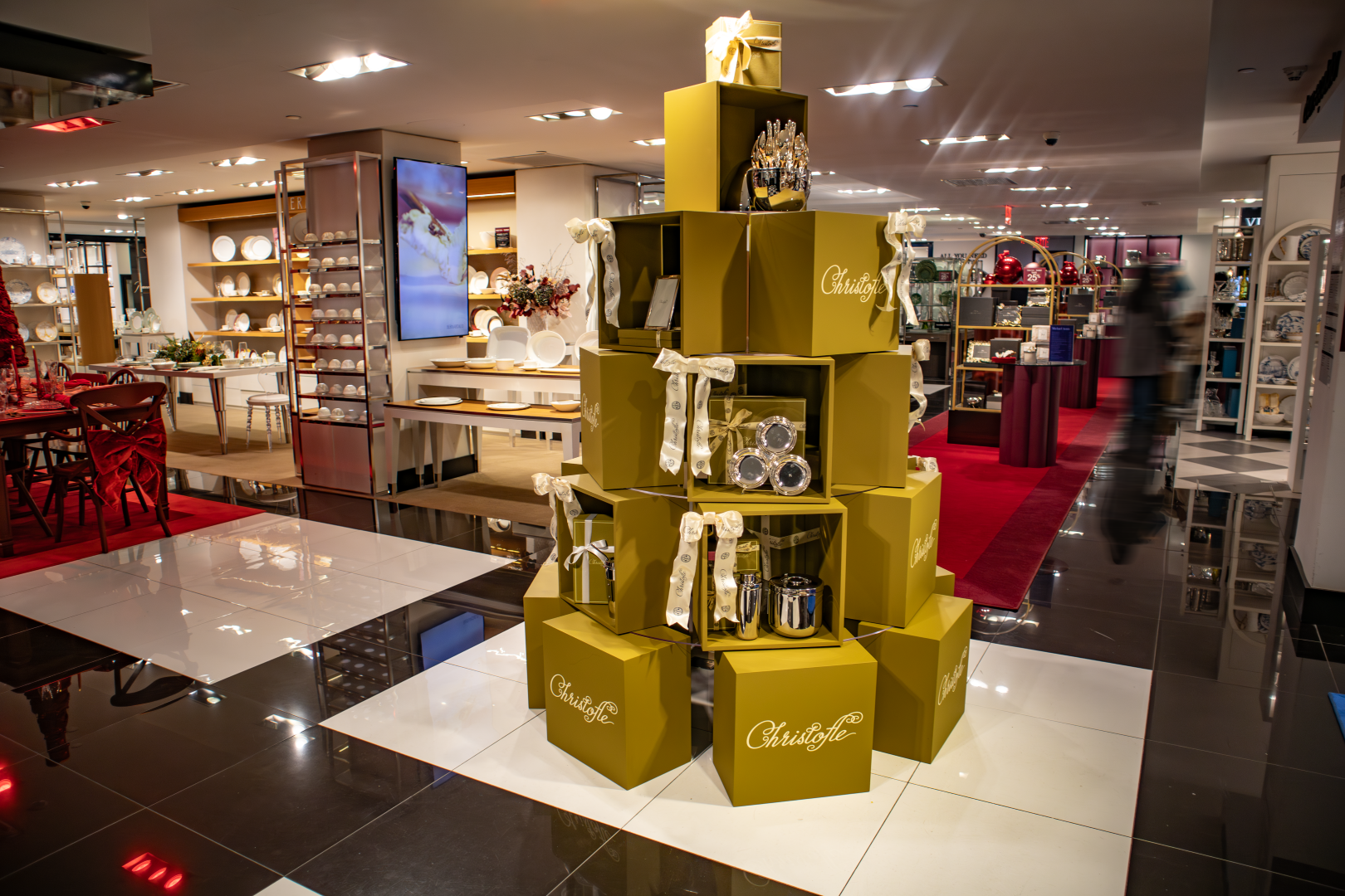 At Visual Citi, we bring luxury concepts to life with precision and creativity — including this holiday Pop‑Up for Christofle at Bloomingdale’s, the renowned French house celebrated for its exceptional dining pieces. For the installation, our team engineered a custom wooden structure designed to resemble a Christmas tree built entirely from stacked gift boxes. Some faces were intentionally left open, creating depth, negative space, and the playful illusion of a tree made of presents — a perfect nod to the holiday season and Christofle tradition of gifting elegance. The entire piece was finished in a distinctive yellow‑green tone, chosen to feel festive yet refined, complementing the brand’s luxury aesthetic. Every detail — from the precision‑cut wooden components to the clean, sculptural geometry — was crafted to highlight iconic Christofle tableware in a warm, celebratory environment.