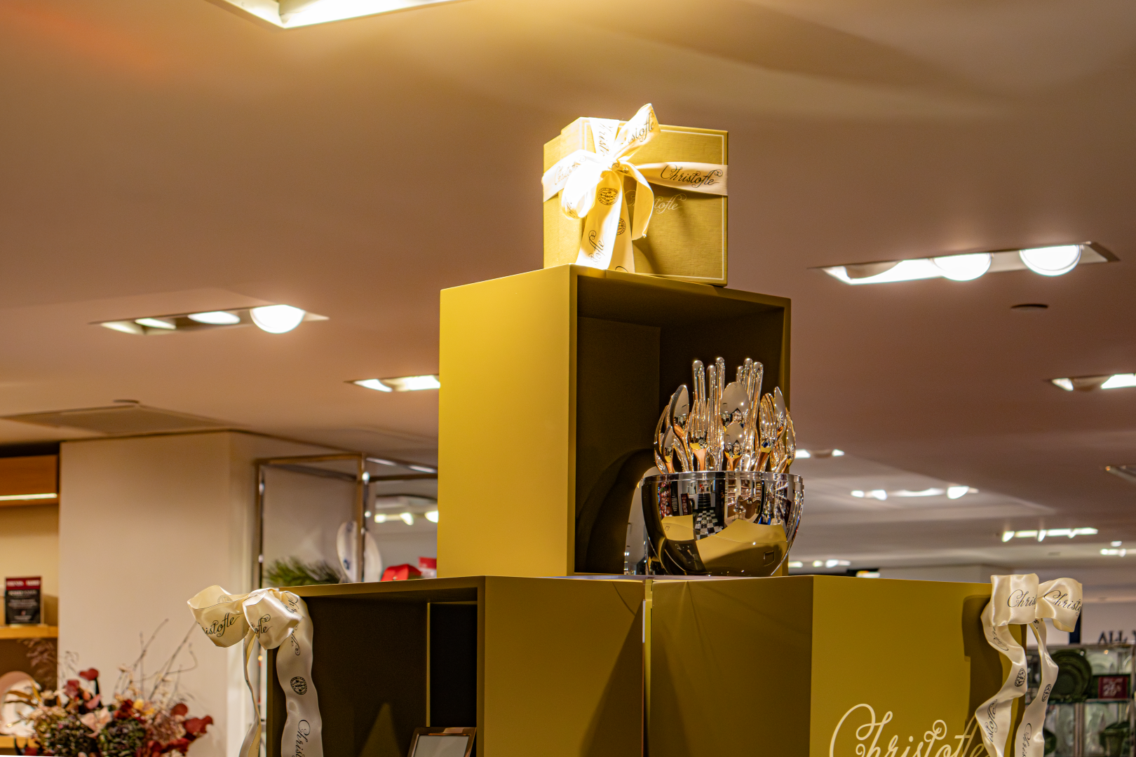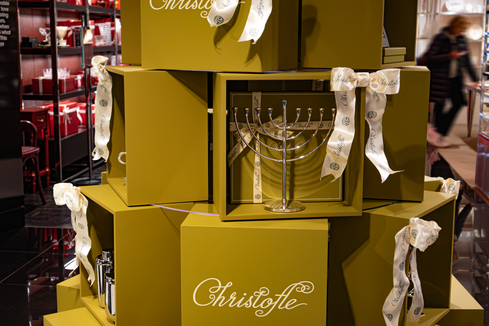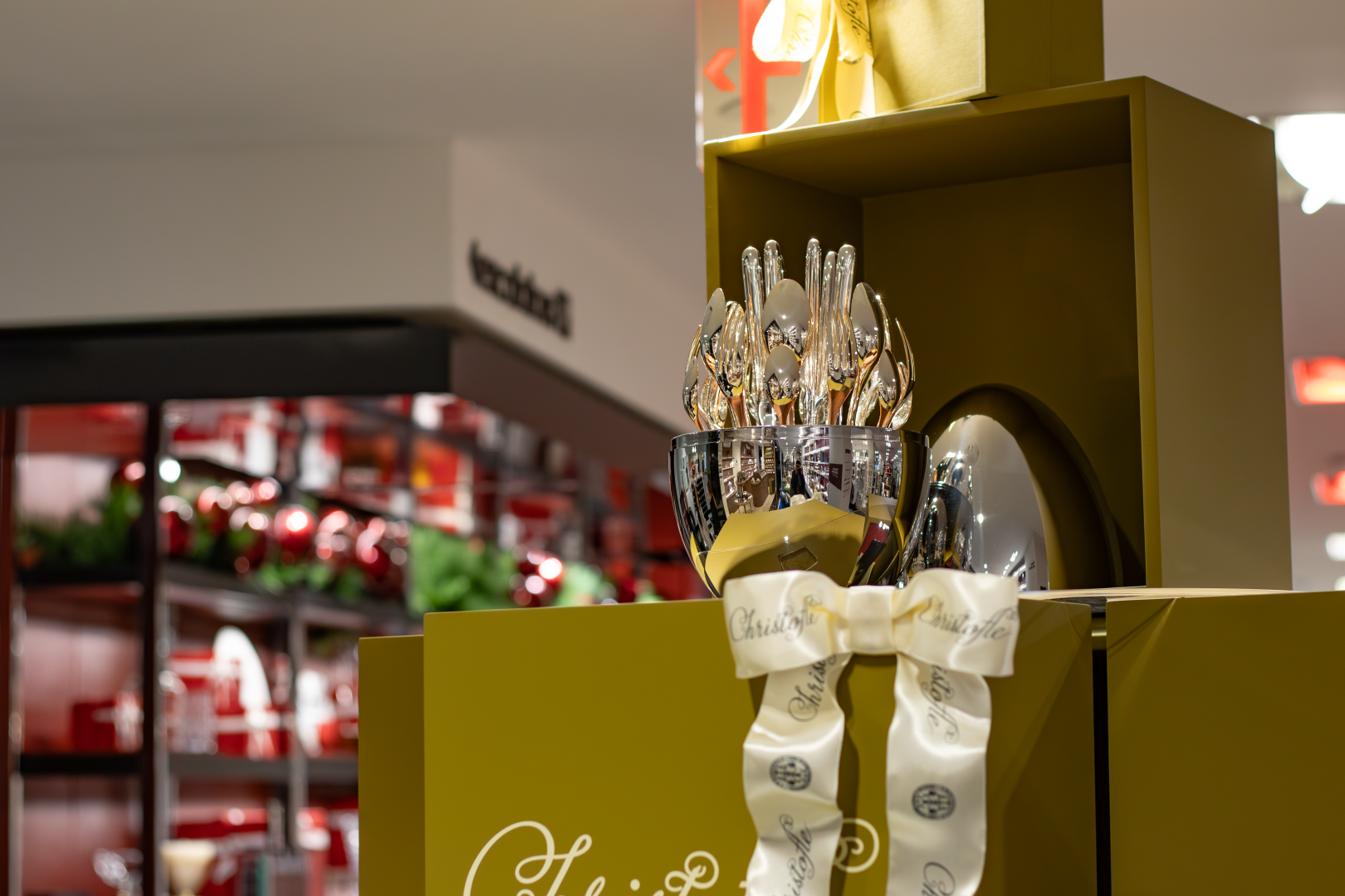 At Visual Citi, we bring luxury concepts to life with precision and creativity — including this holiday Pop‑Up for Christofle at Bloomingdale’s, the renowned French house celebrated for its exceptional dining pieces. For the installation, our team engineered a custom wooden structure designed to resemble a Christmas tree built entirely from stacked gift boxes. Some faces were intentionally left open, creating depth, negative space, and the playful illusion of a tree made of presents — a perfect nod to the holiday season and Christofle tradition of gifting elegance. The entire piece was finished in a distinctive yellow‑green tone, chosen to feel festive yet refined, complementing the brand’s luxury aesthetic. Every detail — from the precision‑cut wooden components to the clean, sculptural geometry — was crafted to highlight iconic Christofle tableware in a warm, celebratory environment.
