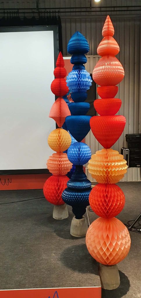 The decorations are produced as flat-folded structures, allowing them to be shipped compactly and then opened quickly on site. Once unfolded, the honeycomb construction creates lightweight three-dimensional forms that can be used individually or combined to build larger installations.