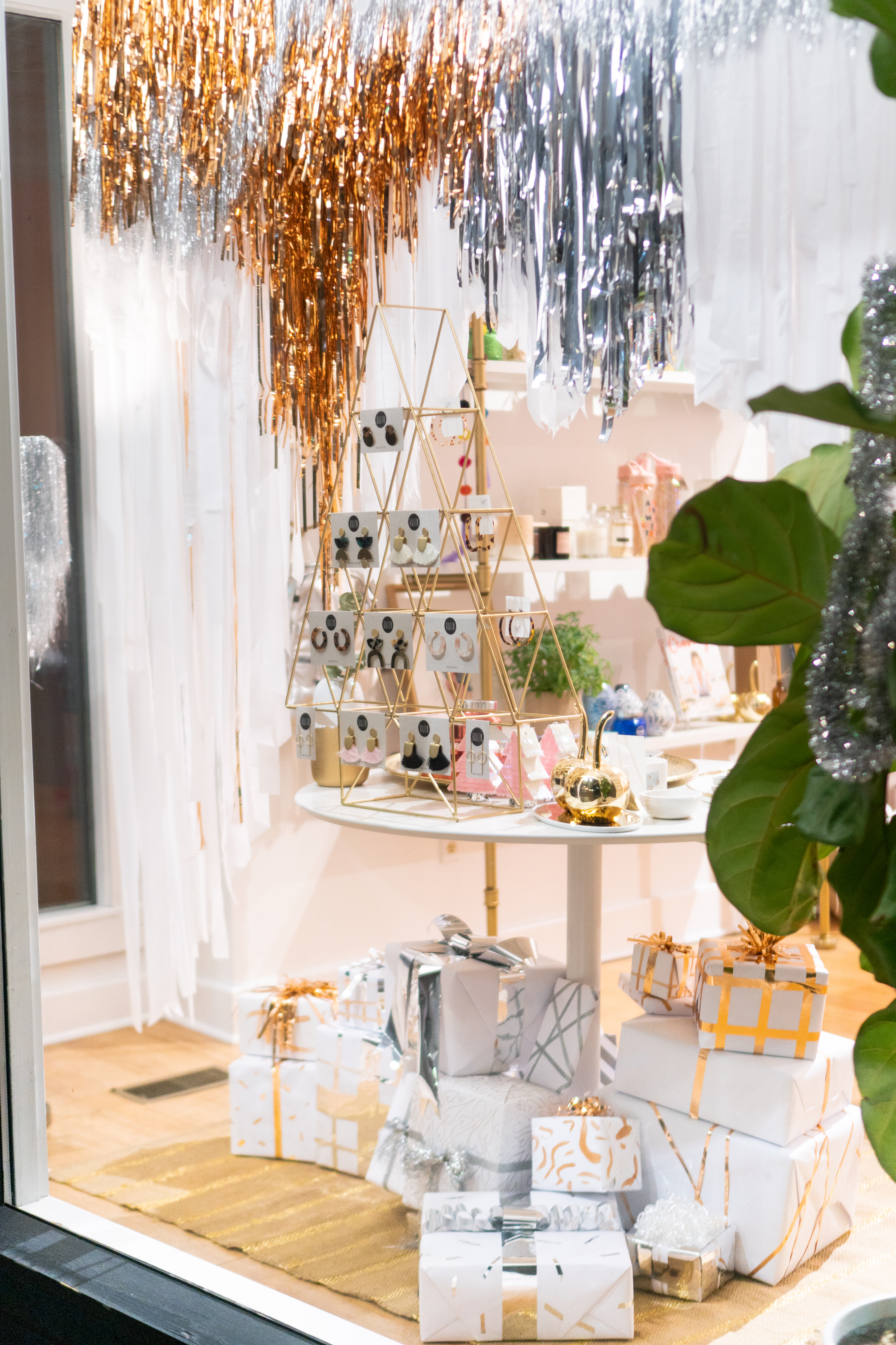 A modern Christmas window inspired by the holiday classic, A Christmas Story. Featuring a hand tinseled lamp shade with metallic thigh high boot base, and a handmade window hanging made from crepe paper, tinsel and bronze foil.