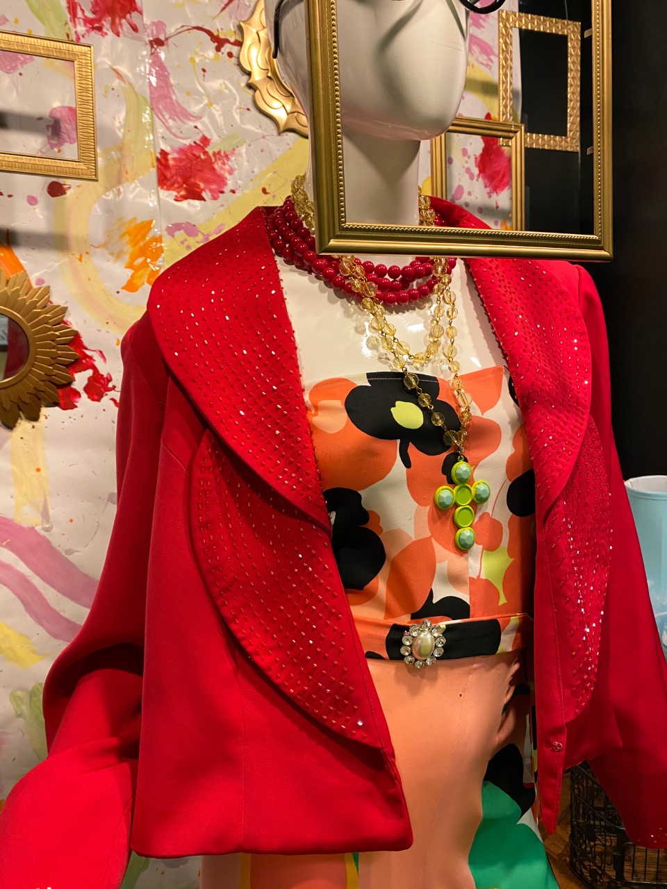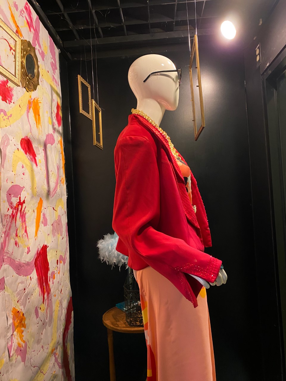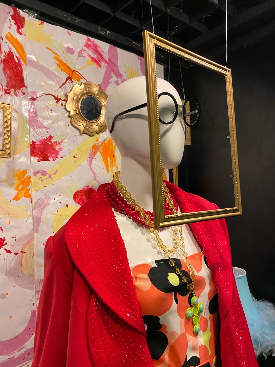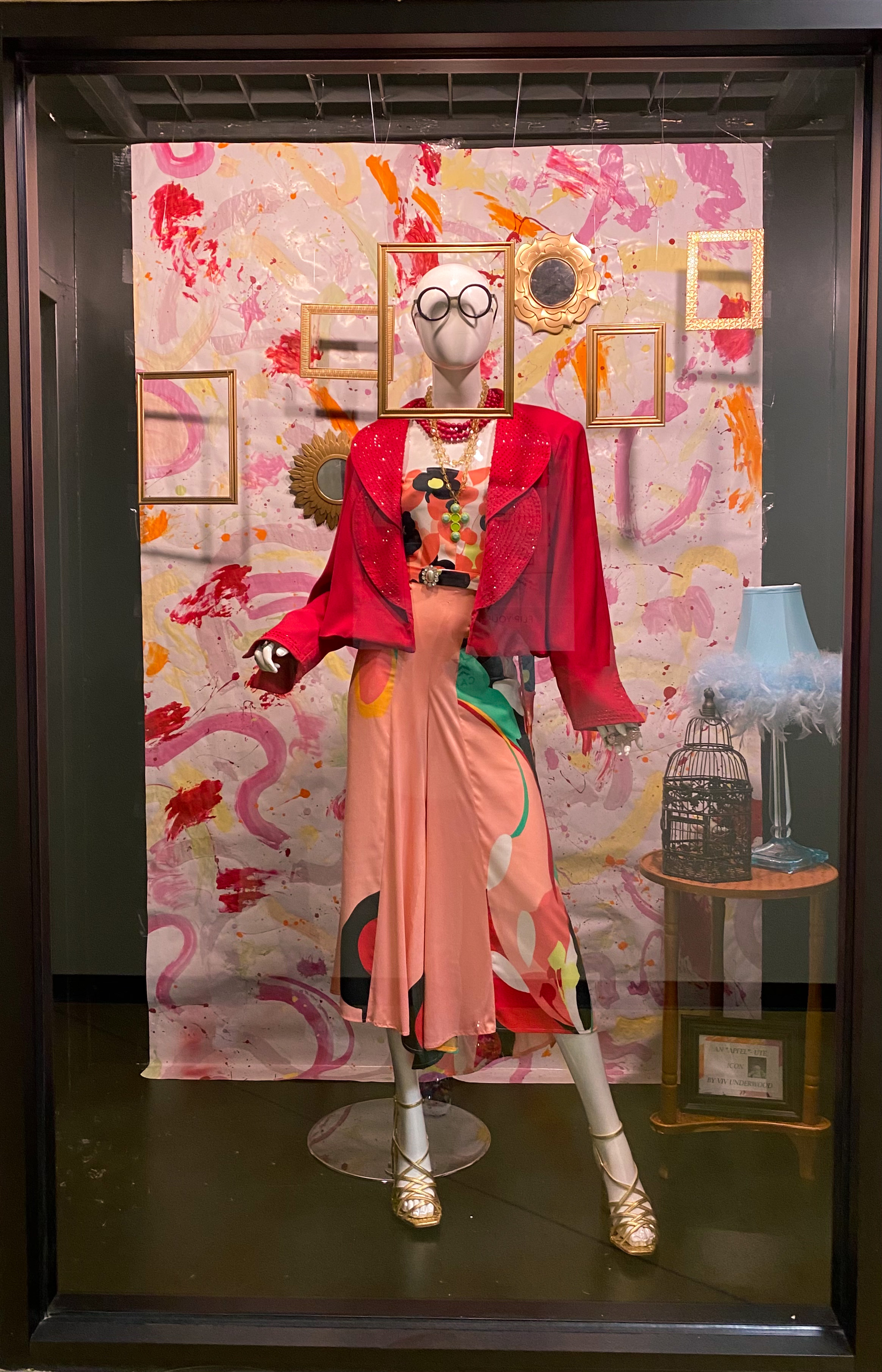 A window display inspired by Iris Apfel and her eccentricity for continuing to play dress up like when we were kids.
