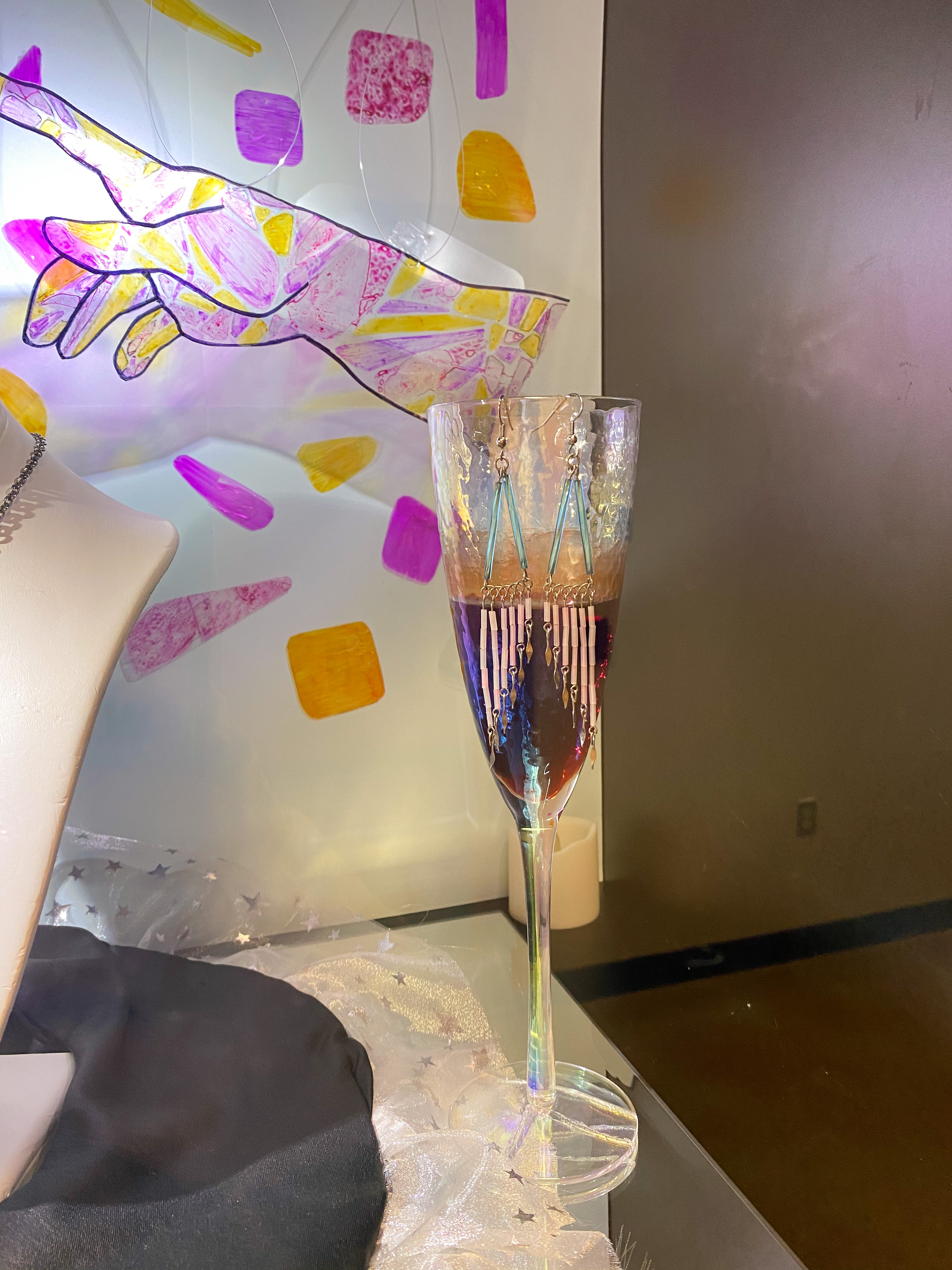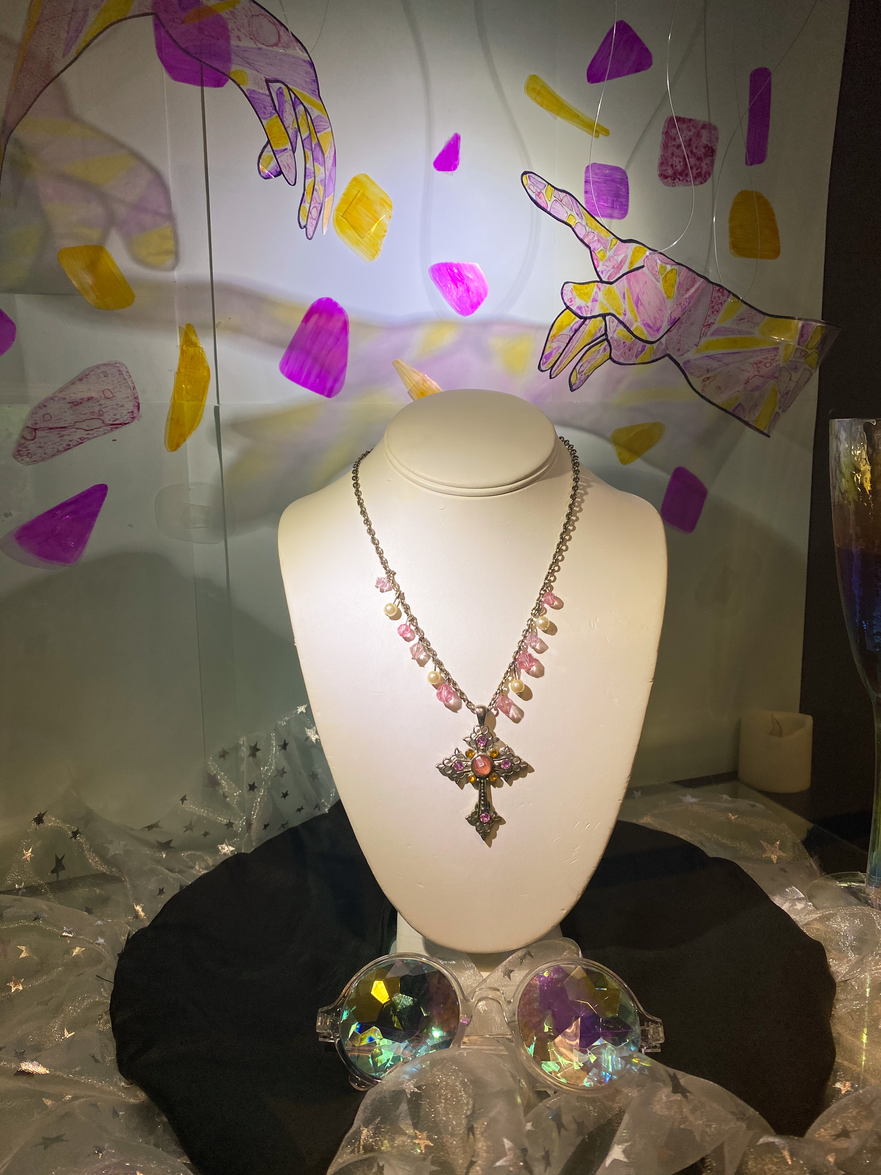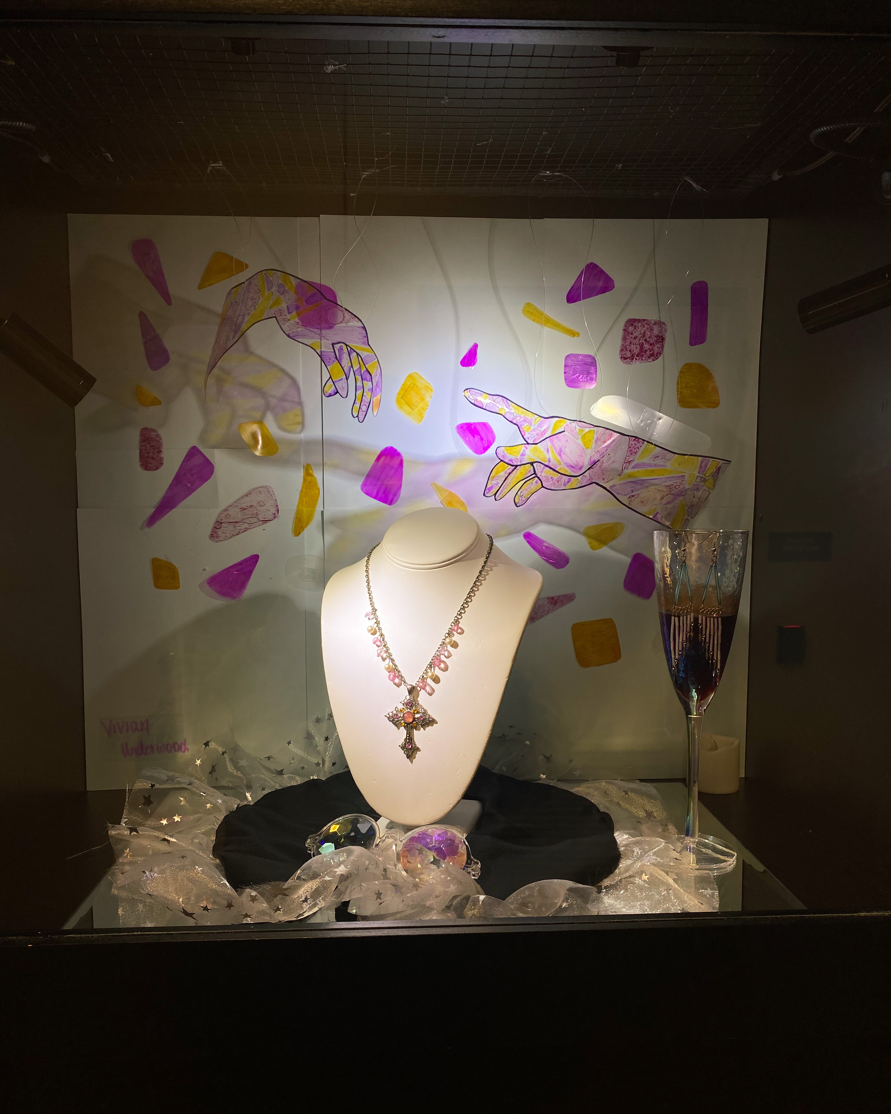 An accessories window inspired by the "Hand of Adam" artwork and the idea of broken glass being pieced together to create a mosaic of colors and light.