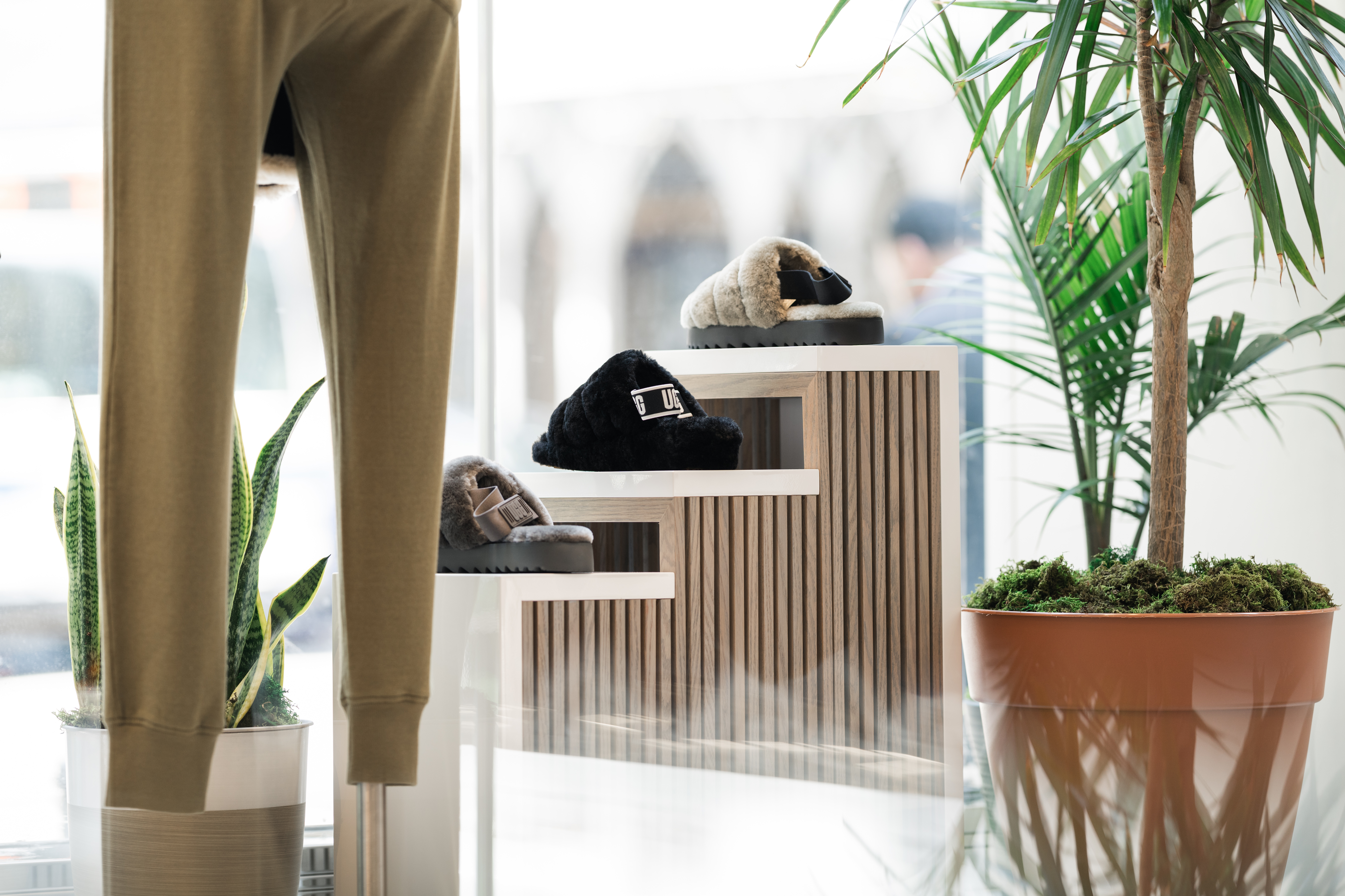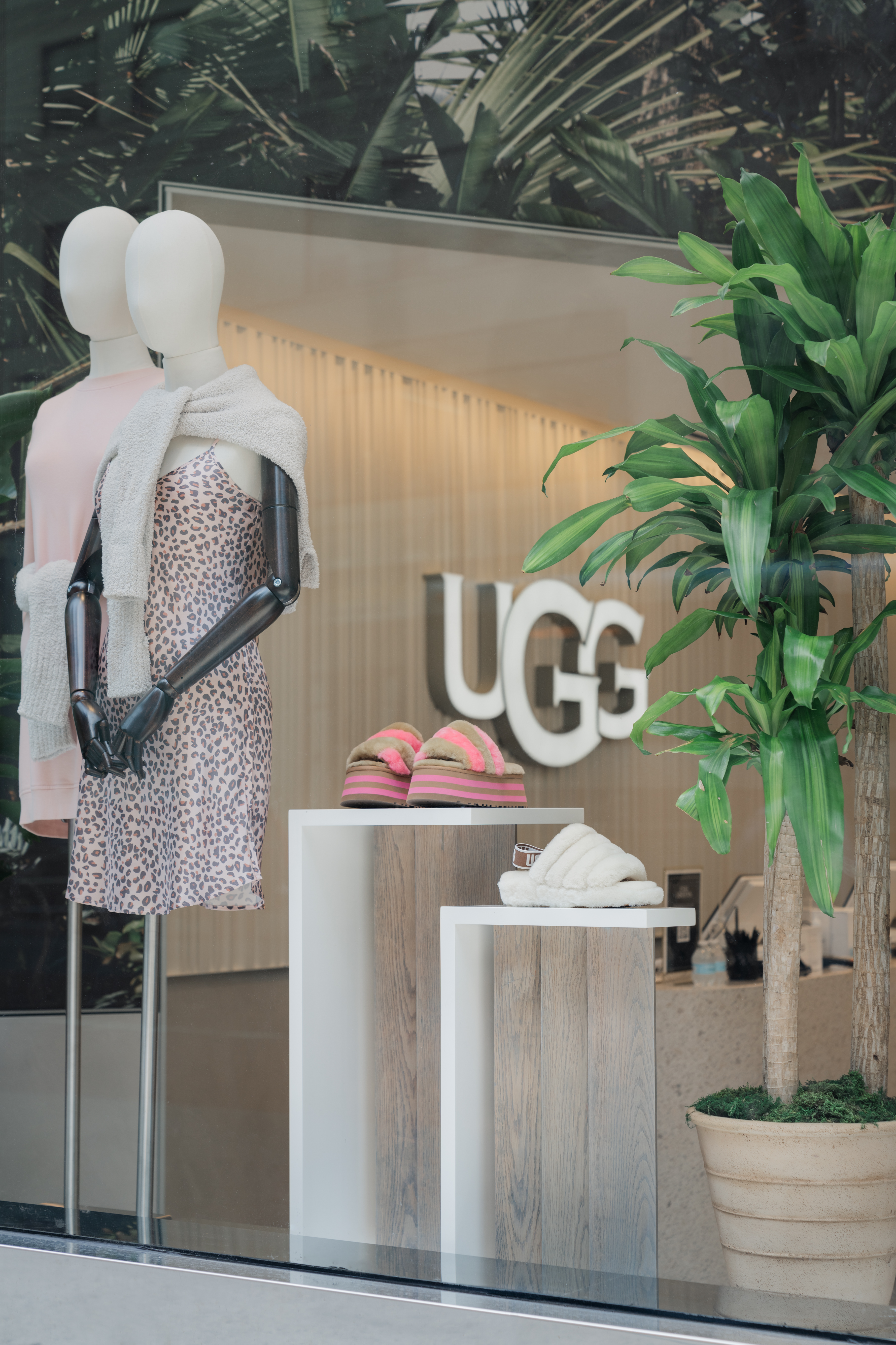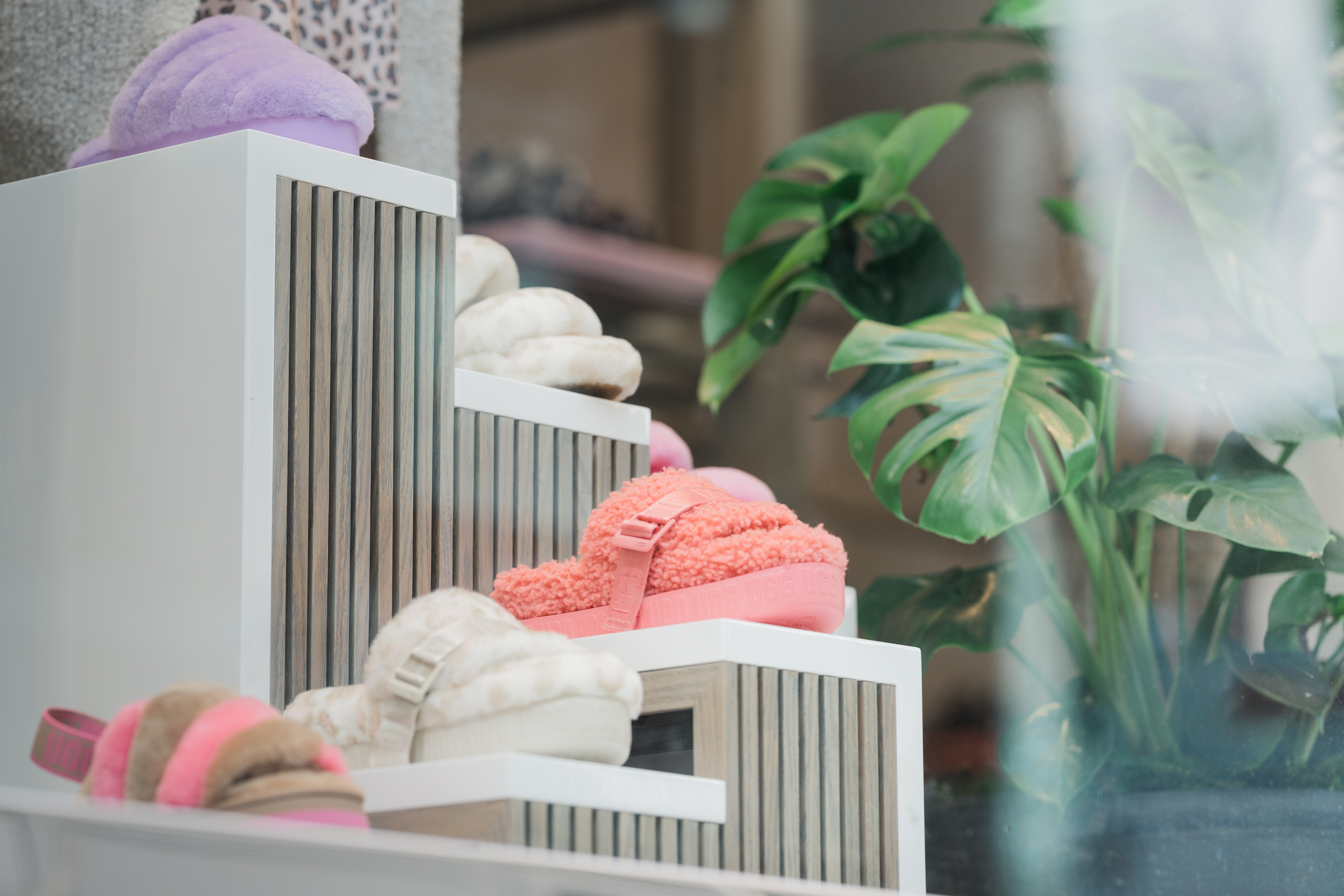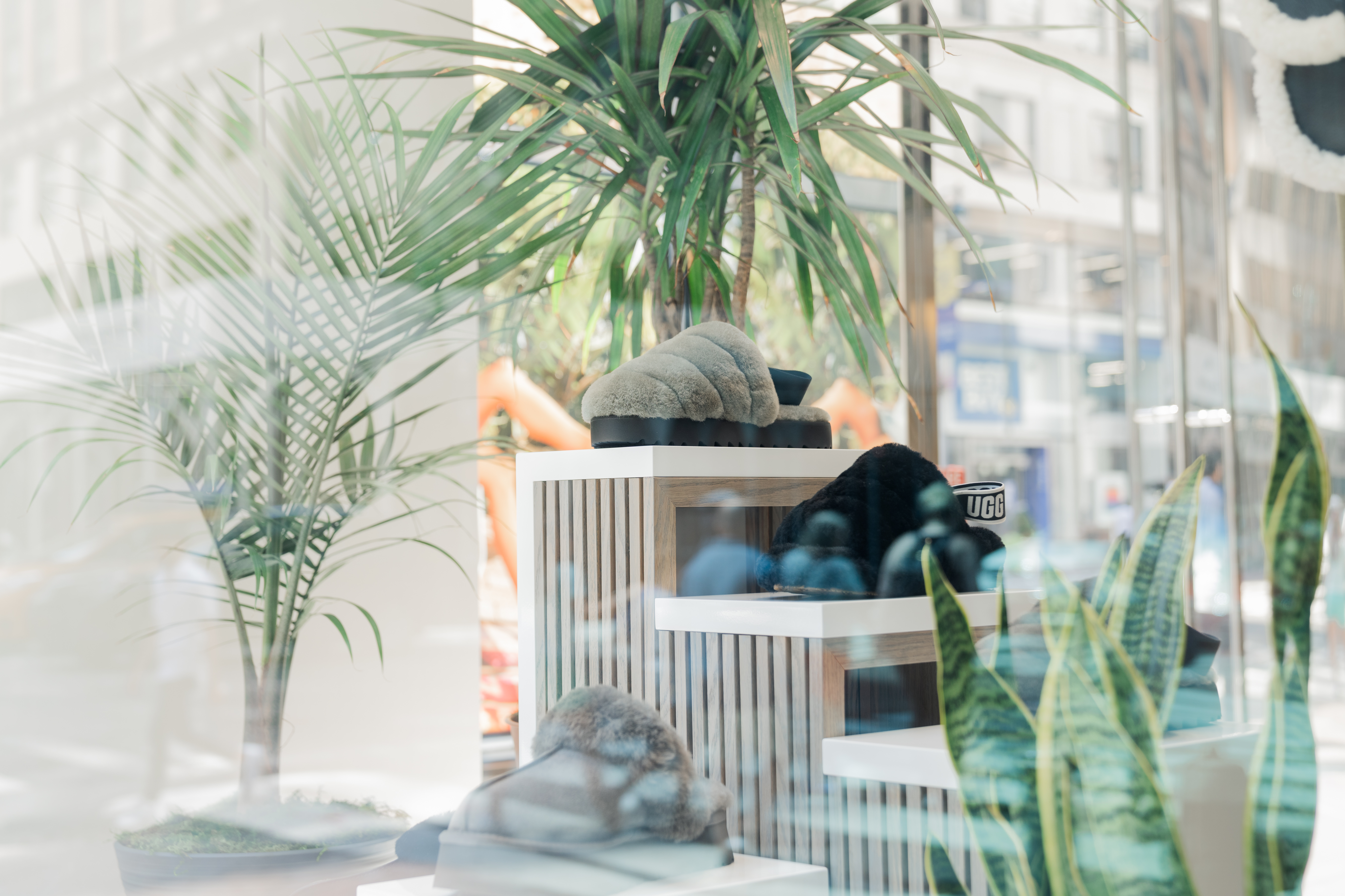 UGG took inspiration from the lush California coast for the summer/fall transition period! Inspired by California beach homes, the podiums are sleek, modern, and let the product shine! The incorporation of vibrant greenery made this presentation feel as effortless as summer should be!