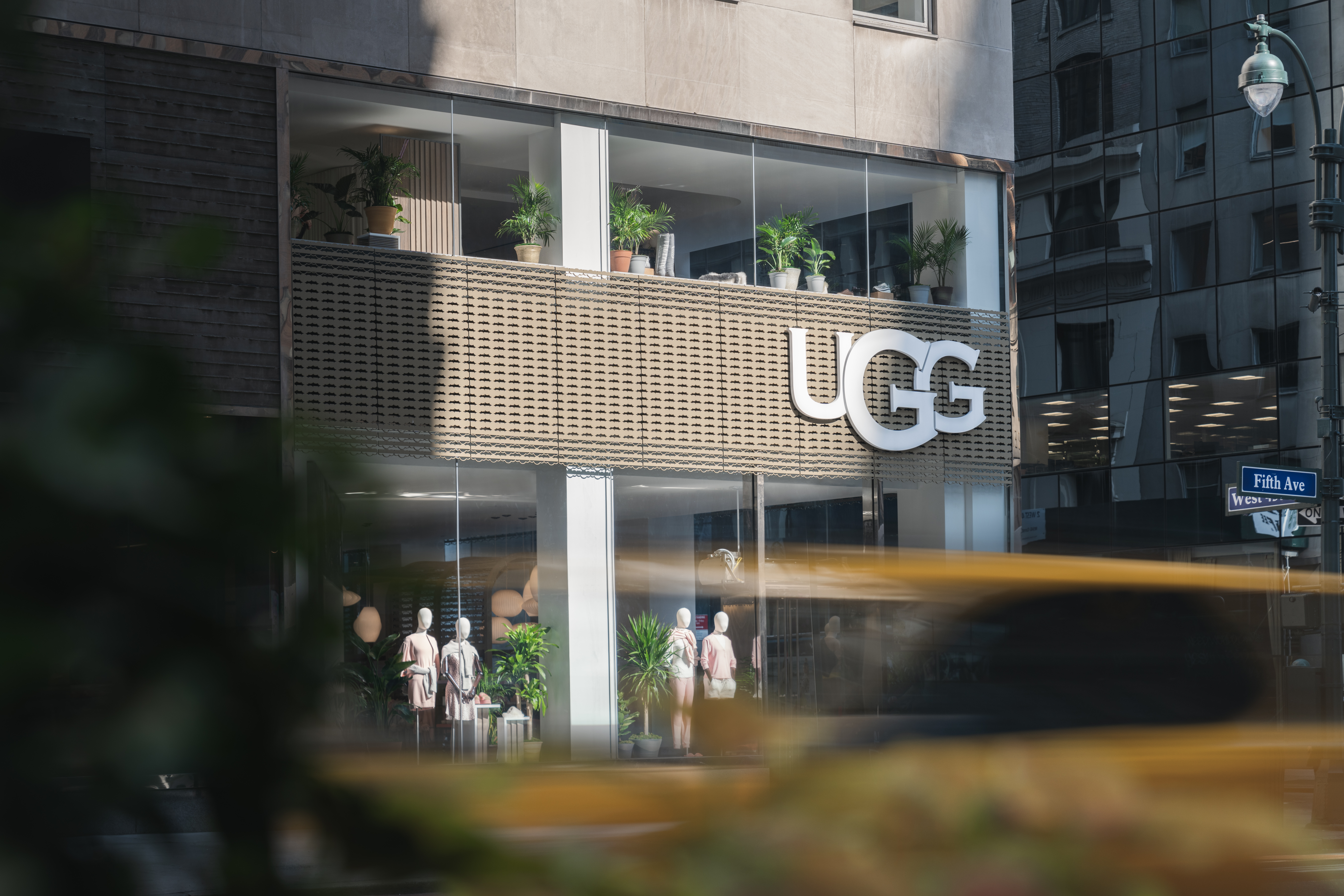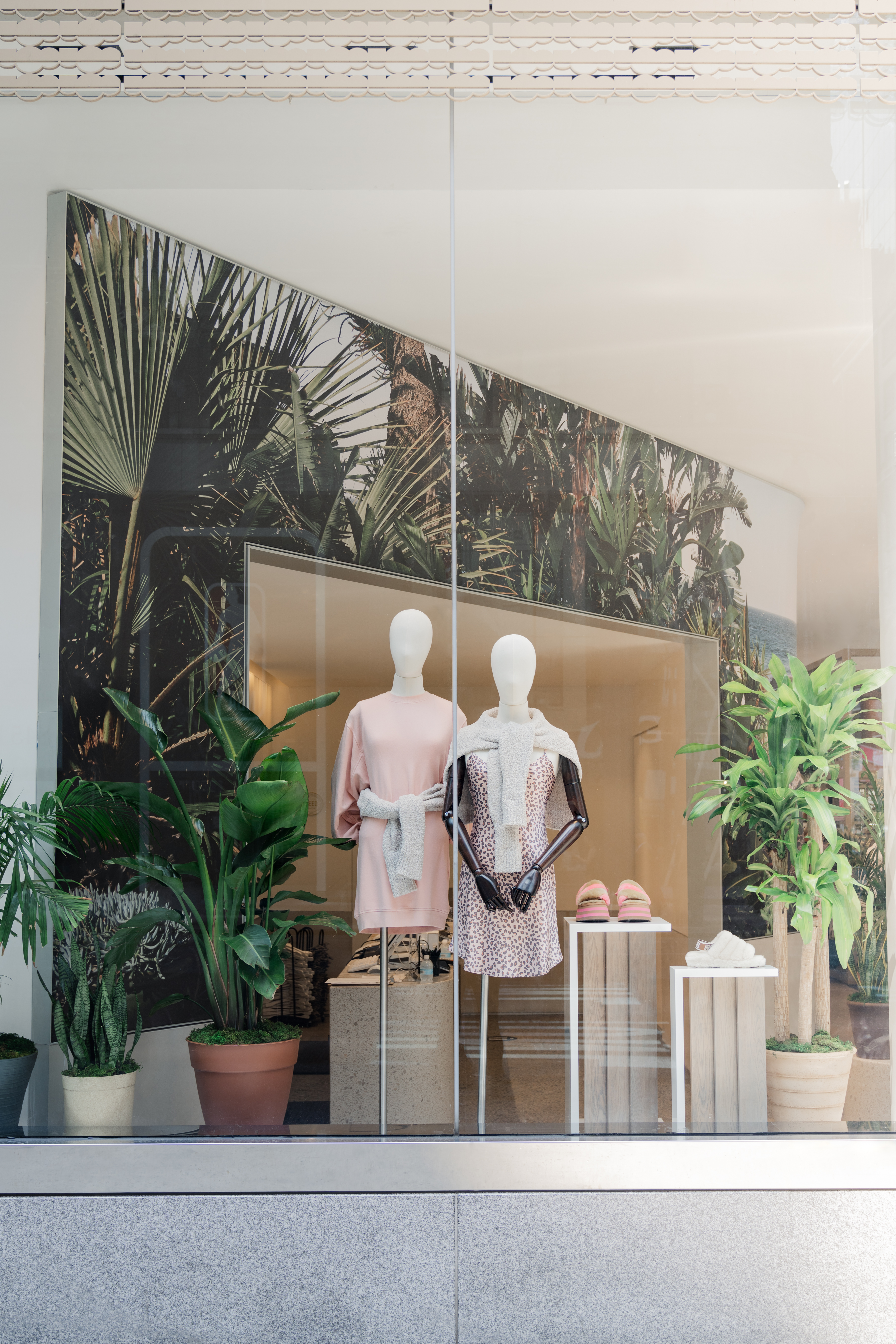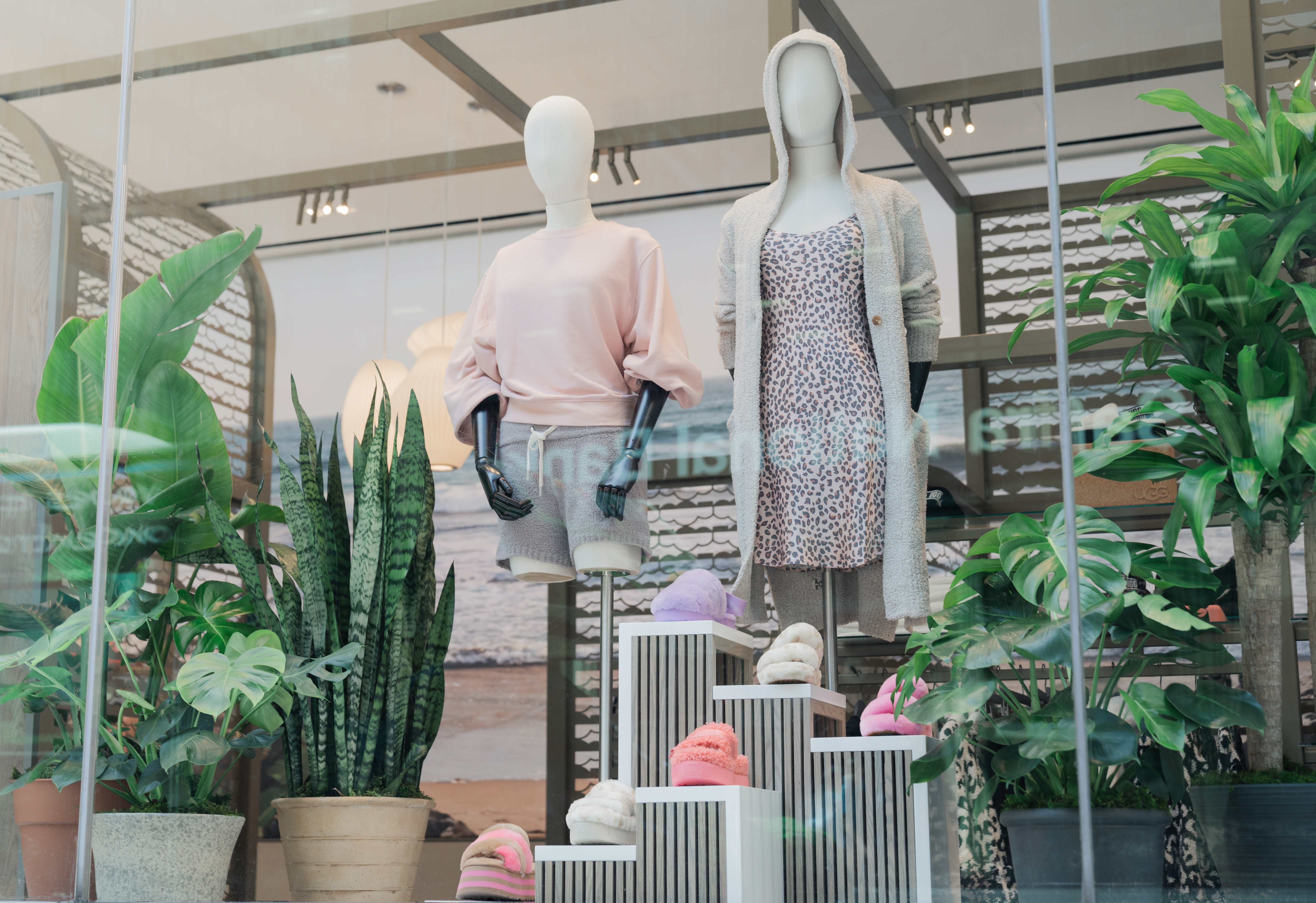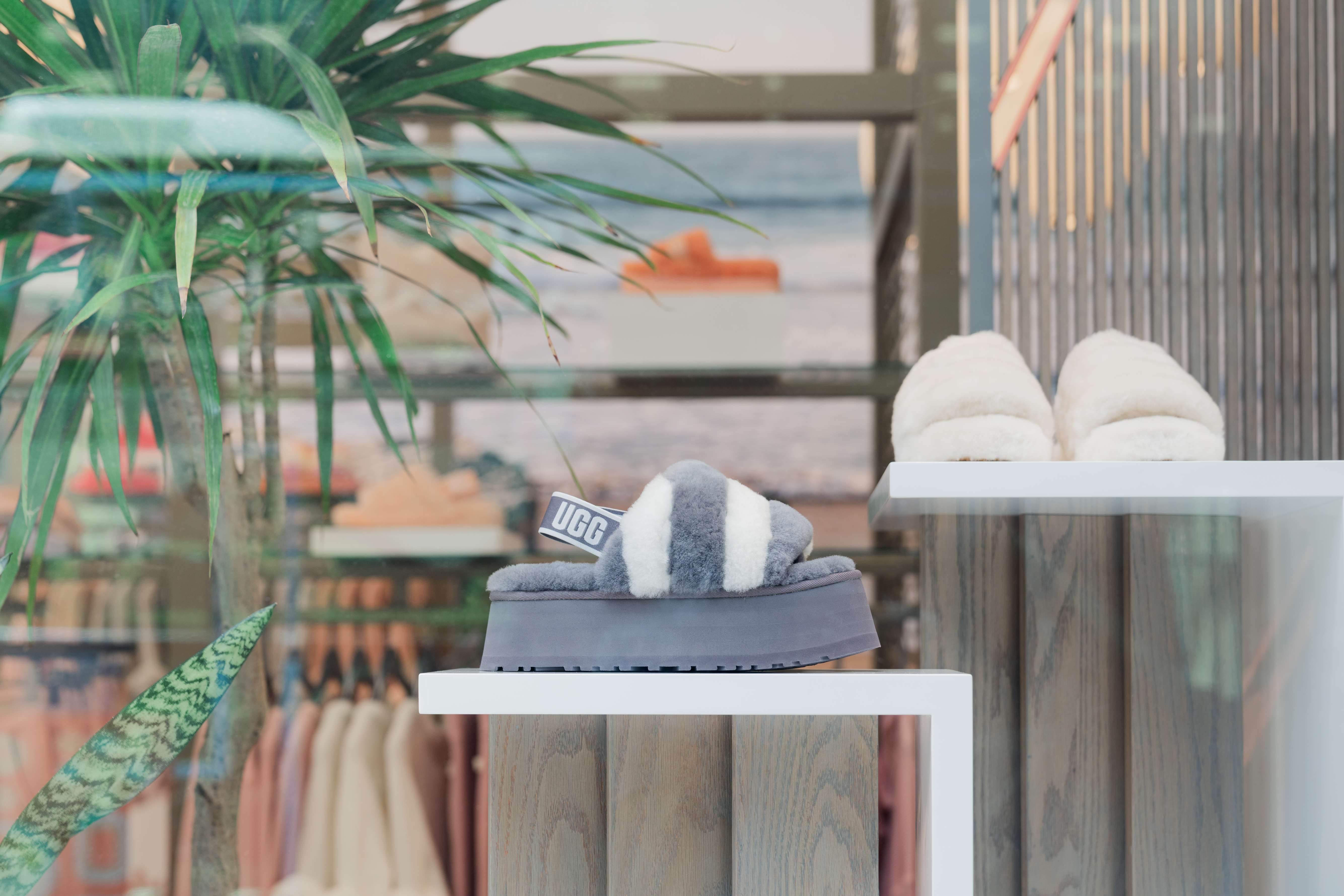UGG took inspiration from the lush California coast for the summer/fall transition period! Inspired by California beach homes, the podiums are sleek, modern, and let the product shine! The incorporation of vibrant greenery made this presentation feel as effortless as summer should be!