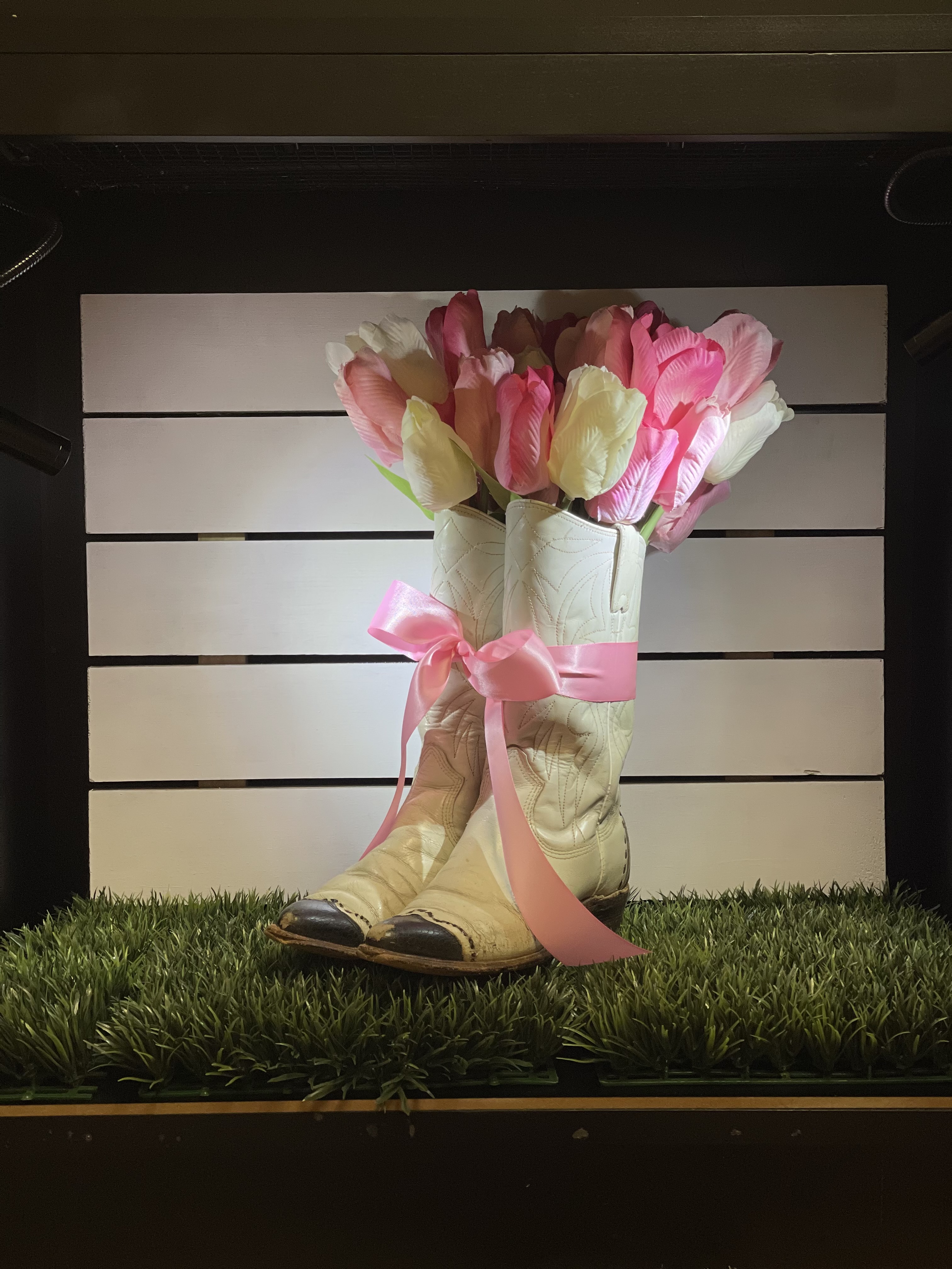 Inspired by Love Shake Fancy's new line and store opening in Nashville, this is my take on Country Chic. Vintage cowboy boots with a touch of pink.