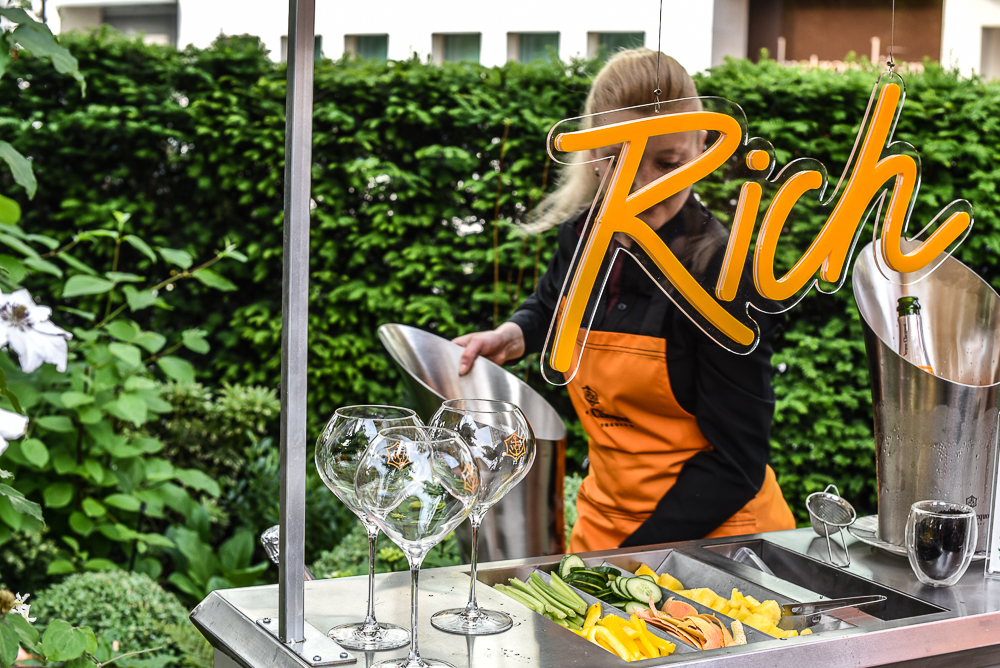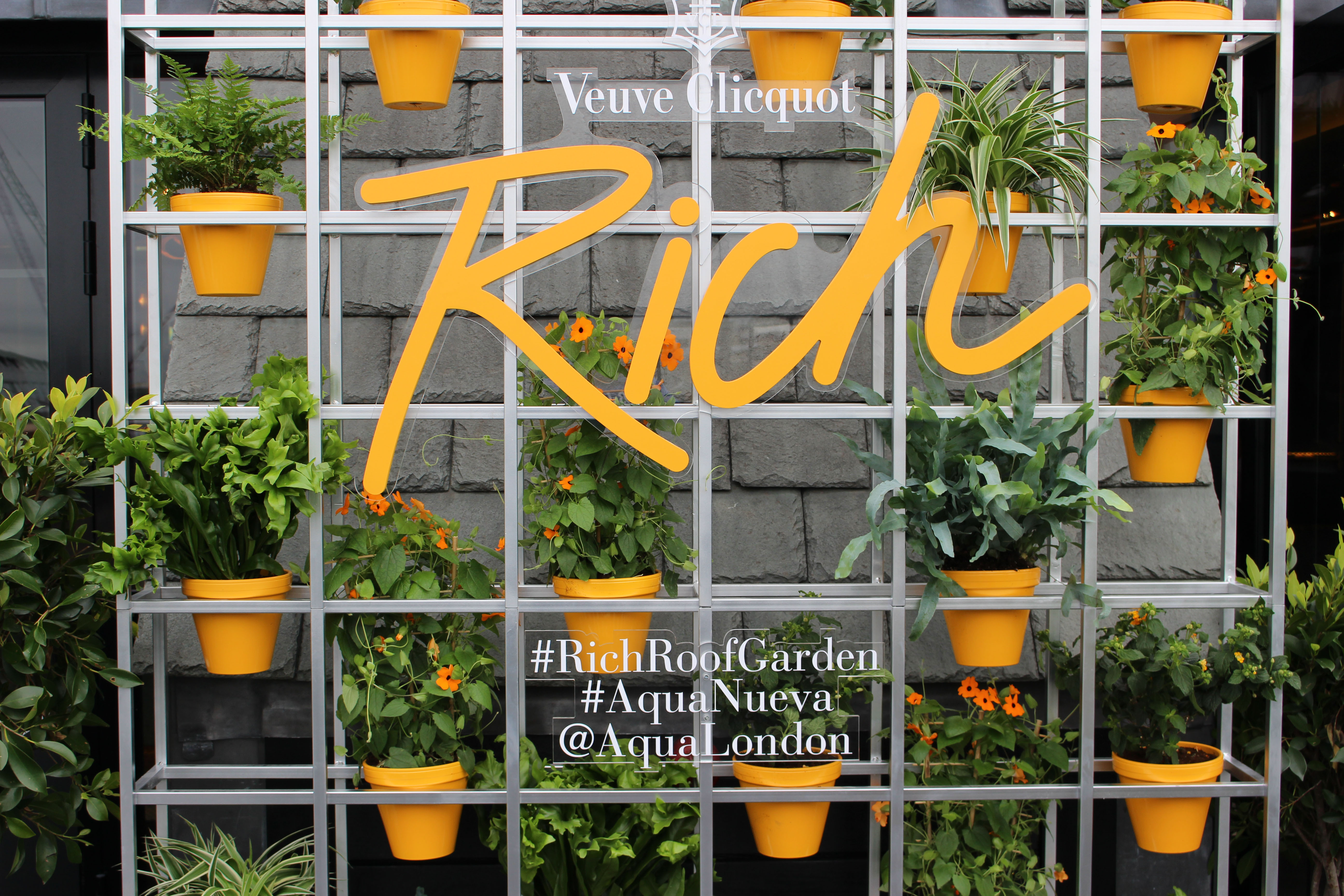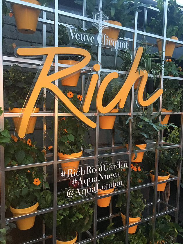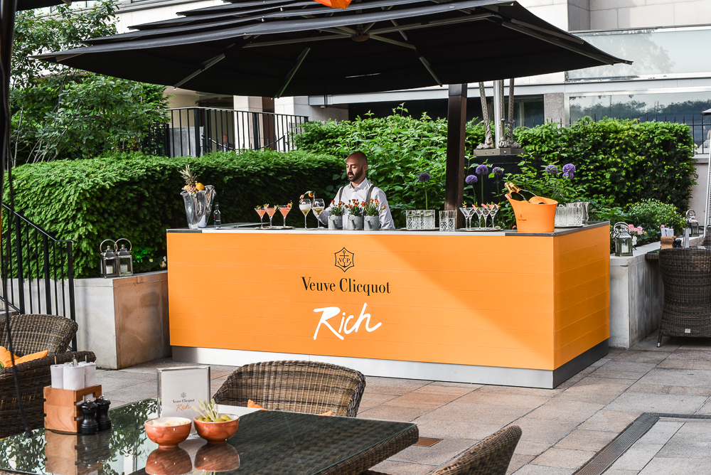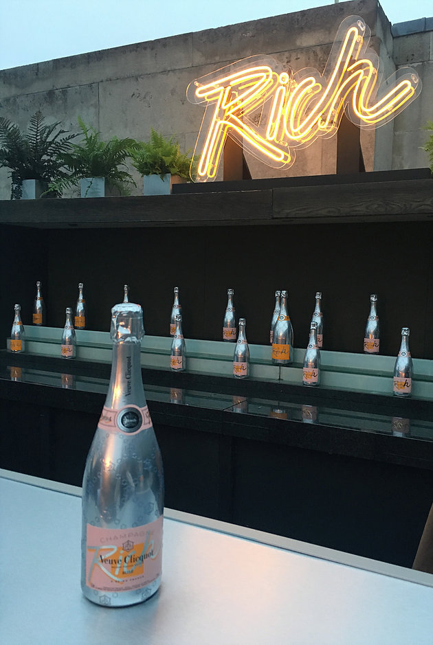 Hello Flamingo was very excited to be approached by the team at Hotel Creative to collaborate in creating an exclusive Veuve Clicquot pop-up rooftop bar at the Aqua Spirit bar on London’s Regent Street, launched in June 2016. The bar is publicizing the newly launched Veuve Clicquot Rich, a champagne created to mix with your favorite ingredients – in their words: ‘Veuve Clicquot propels this tradition (champagne drinking) into the contemporary era with RICH, a champagne dedicated to mixology.’
