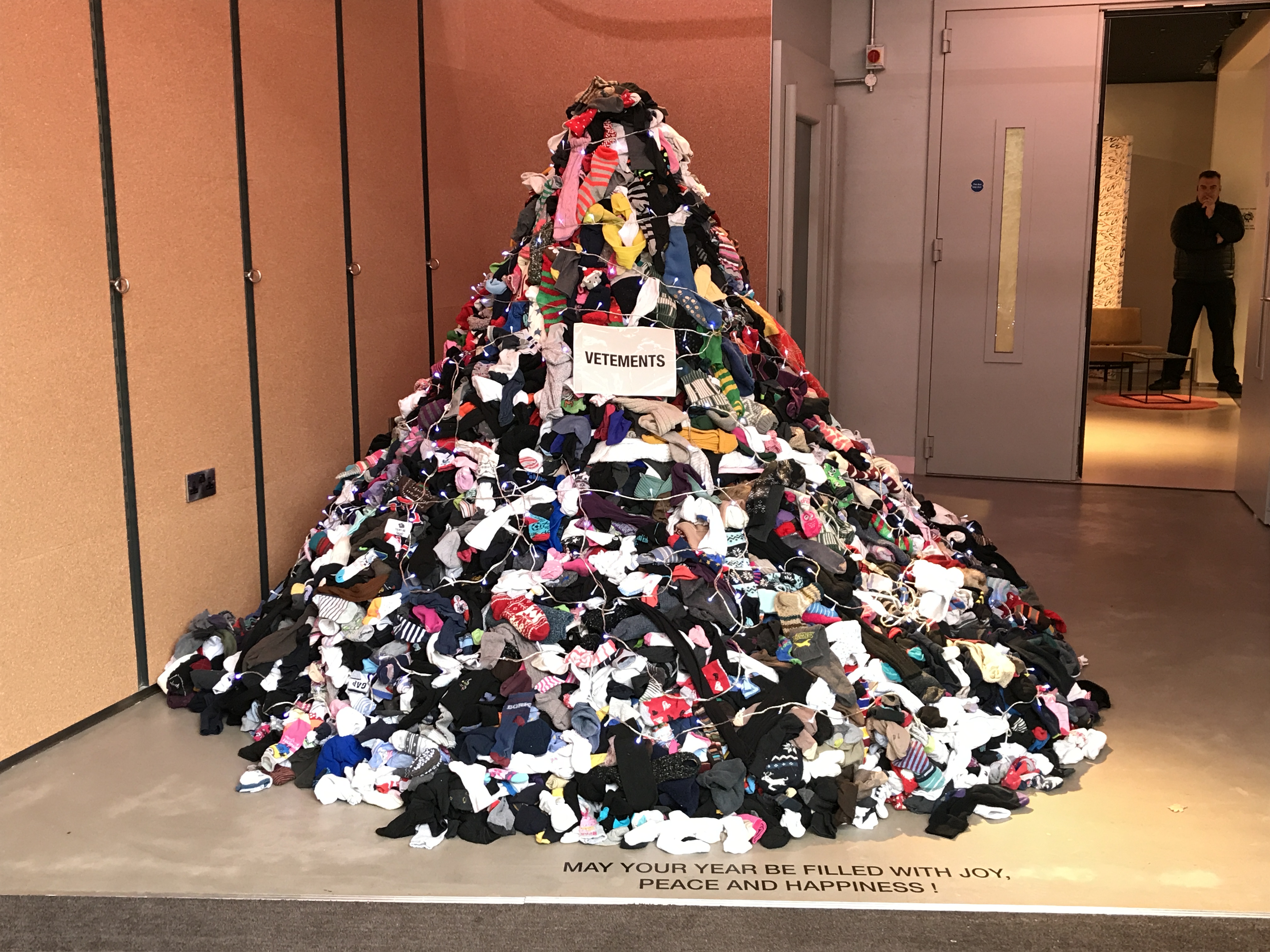 In the Browns East store, in Shoreditch, London, had a window dedicated to, and designed by Vetements – the French clothing and footwear design collective. A giant pile of old socks filled the window. Approx. 25 sacks of socks were pinned to a giant polystyrene mound to give the illusion of the pile.