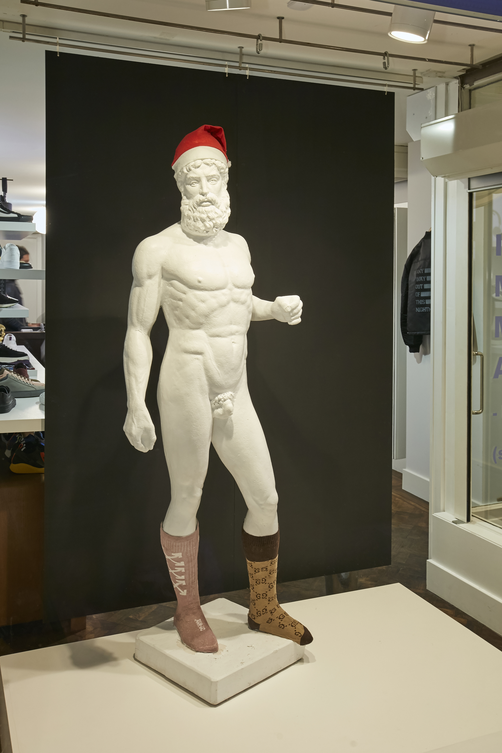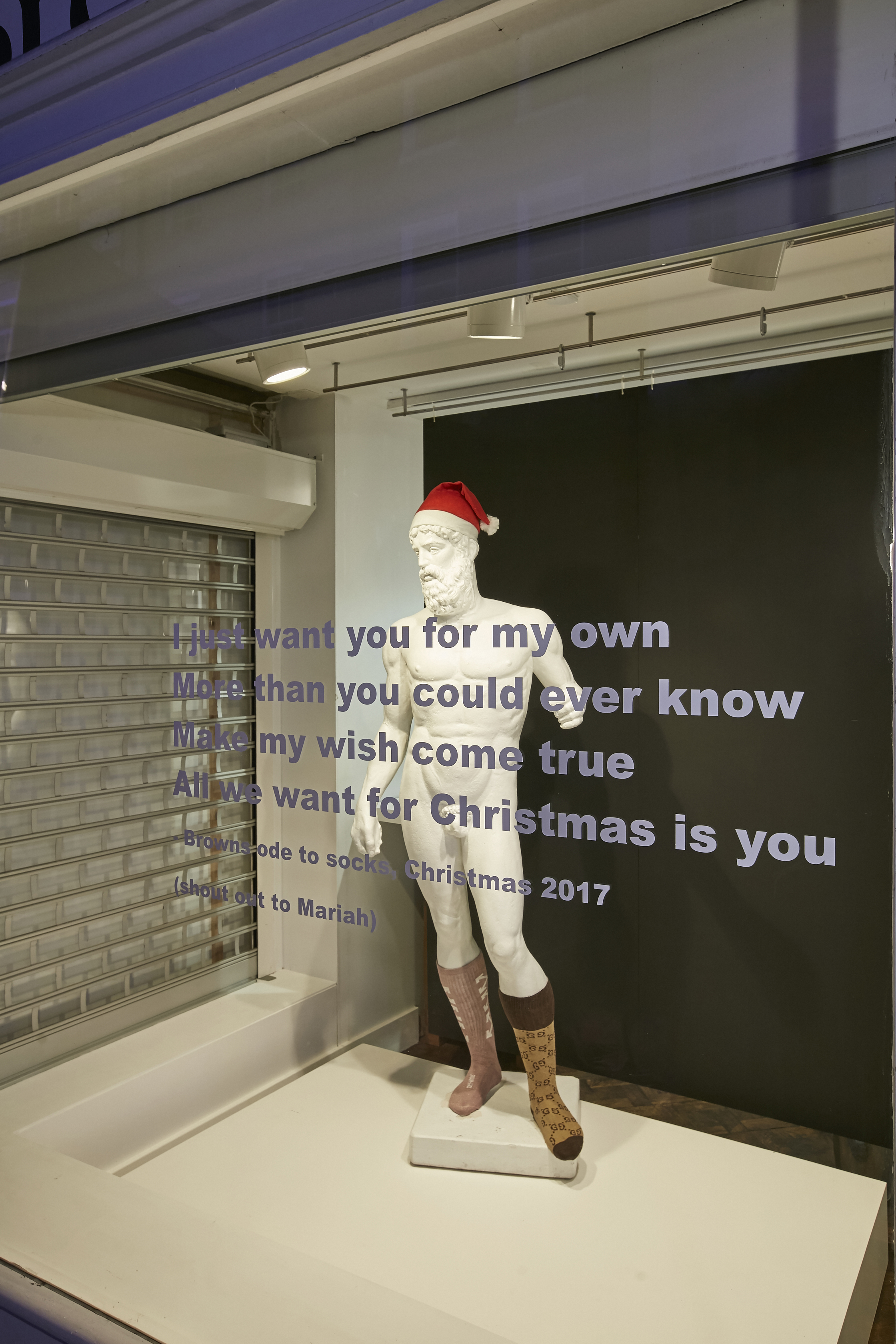 A replica stone statue of Il Giovanne, had a window to himself, wearing only a pair of odd socks and a Santa hat. With the lyrics of the Mariah Carey Christmas hit – All I Want for Christmas – applied to the window, as Browns ode to the sock.