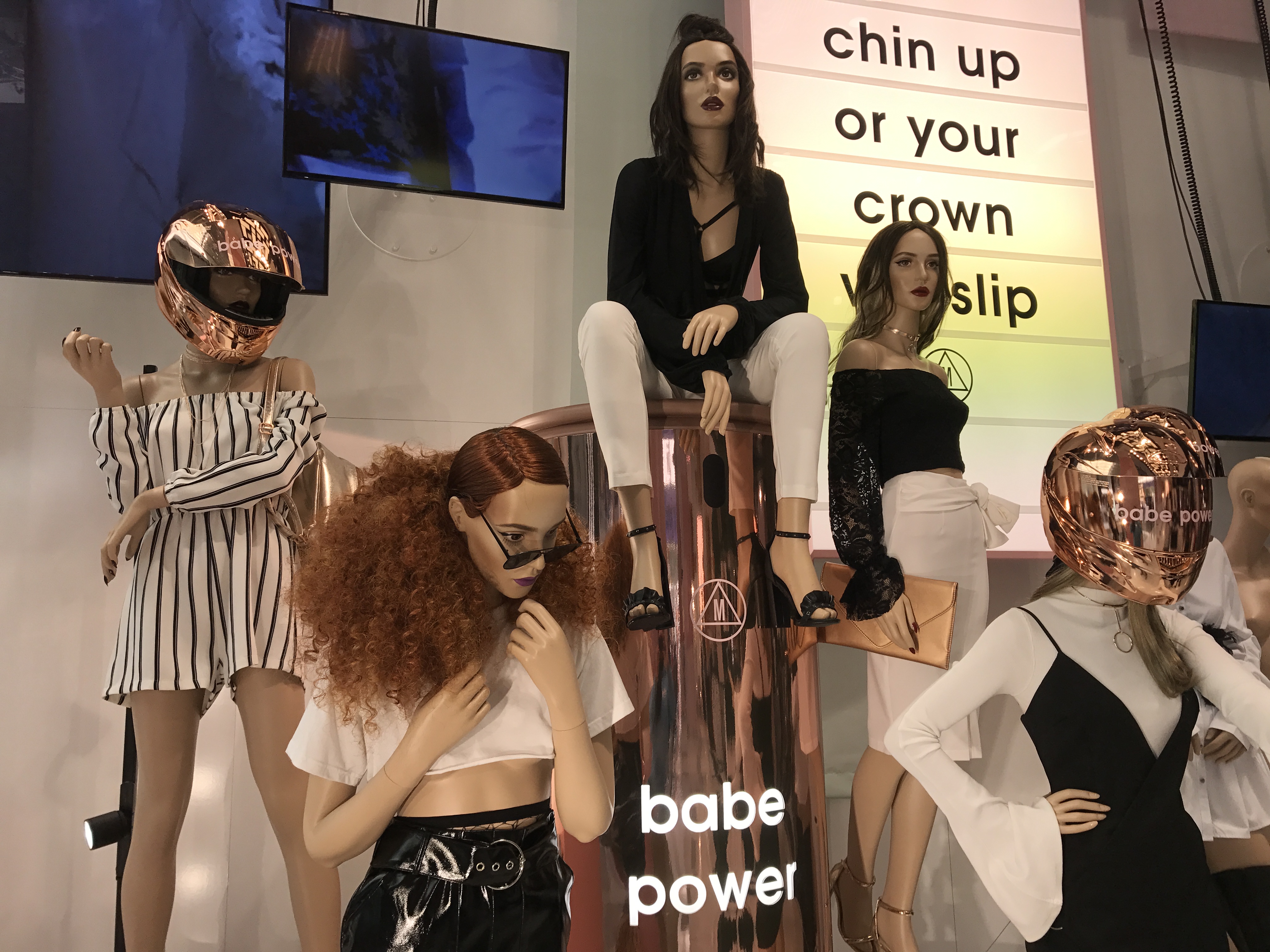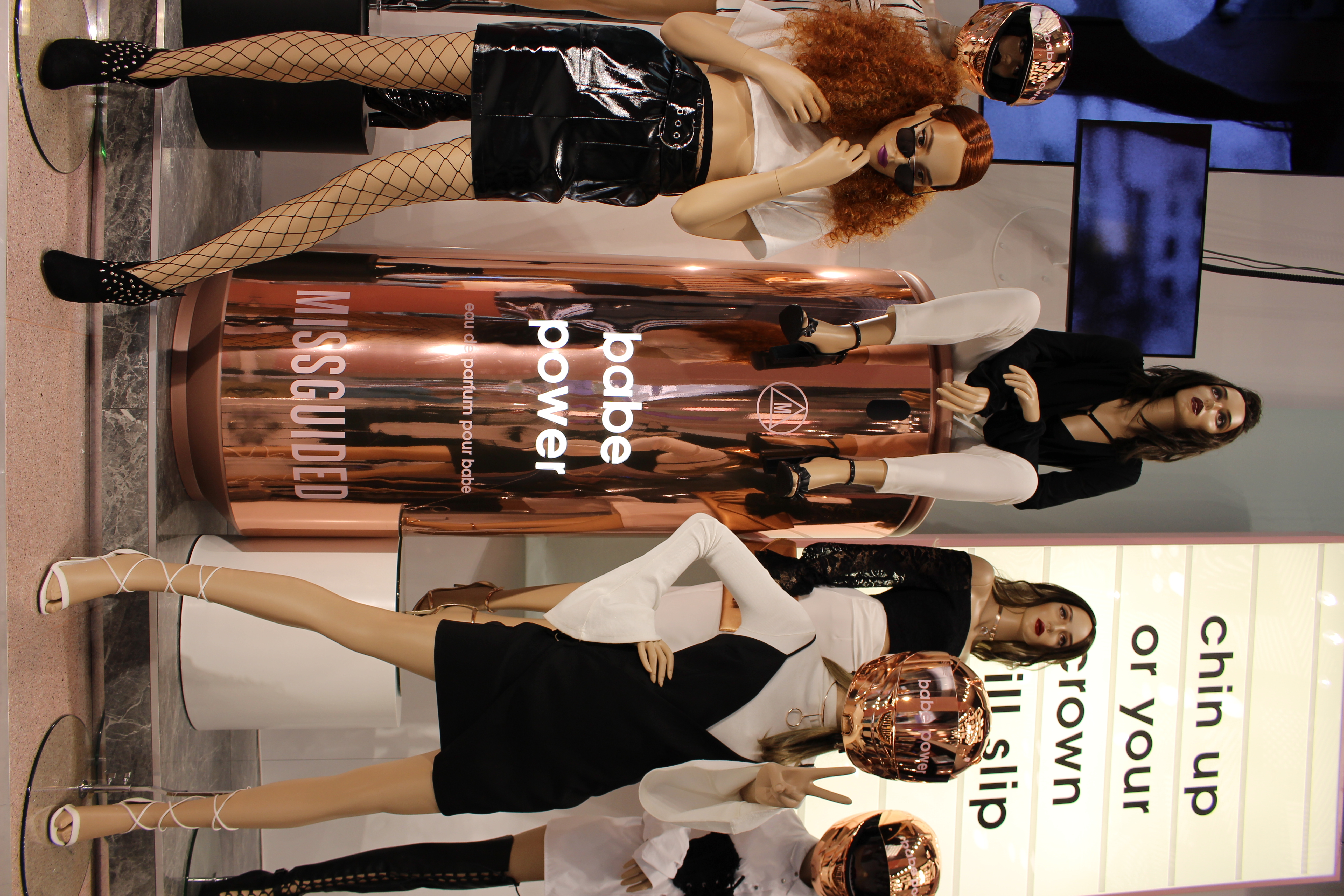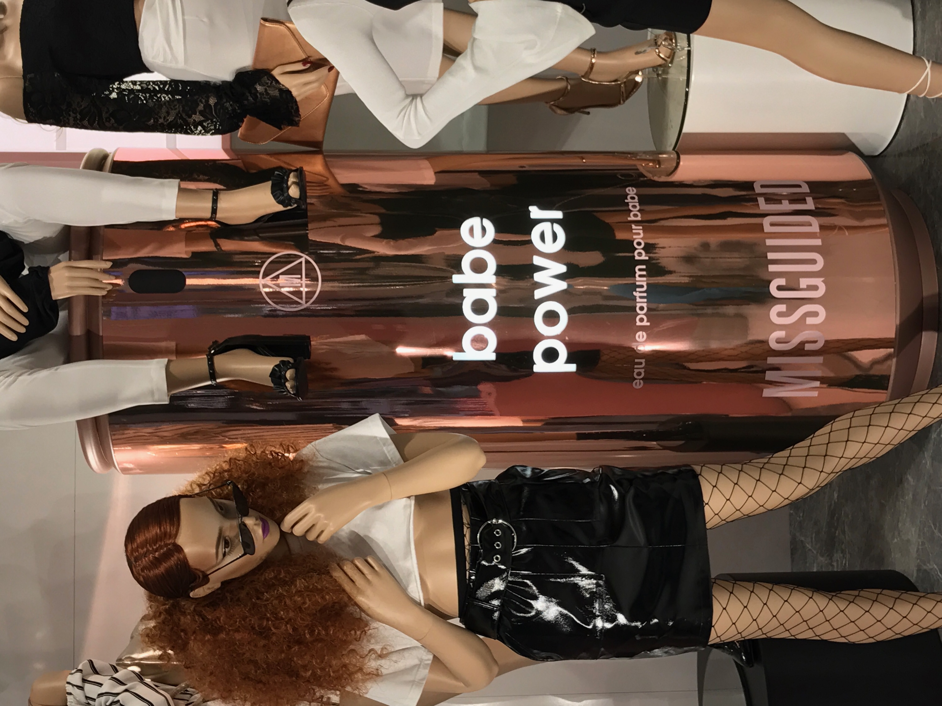 Hello Flamingo were extremely excited to be approached by the creative team of bold fashion brand Missguided to collaborate with them, and fragrance distributor Per Scent, in creating a giant replica perfume bottle for the launch of their new fragrance ‘babe power‘ at Westfield, Stratford. The perfume bottles are the shape of drinks cans and are sold from a Missguided vending machine in the store. Our brief was to create a replica perfume can to perfectly match the original. The in-house production team at Hello Flamingo manufactured the bespoke prop in our workshop. Using internal wooden formers to create the can shape, which was wrapped to give the solid can outer. The can was wrapped in rose gold mirror vinyl. The ‘babe power’ logo was cut out of the can and illuminated to make the branding pop. CNC wood top and bottom parts completed the realistic look, which included a giant ring pull. The can was then installed at the store with an army of mannequins around it – who were beautifully styled by the Missguided team. Some of the mannequins wore chromed rose gold motorcycle helmets, with the ‘babe power’ logo on the visor, which were also supplied by Hello Flamingo. The whole display looked amazing, we are really pleased with the outcome and very proud to work with this exciting brand!