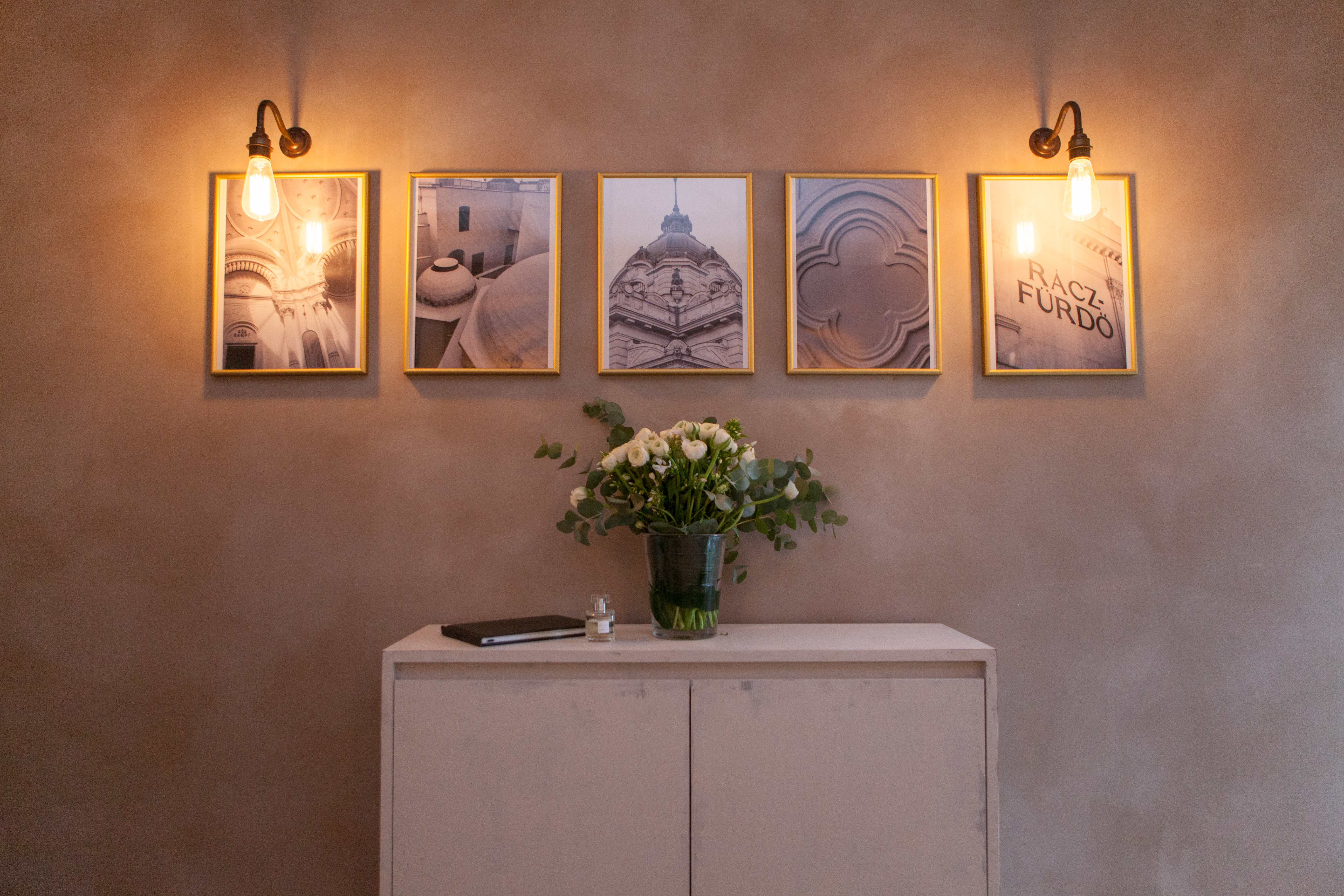 Sumptuous curtains cover the windows and a vinyl of the company logo adorns one wall, which faces a wall of brass picture frames filled with black and white imagery of Hungarian architecture.