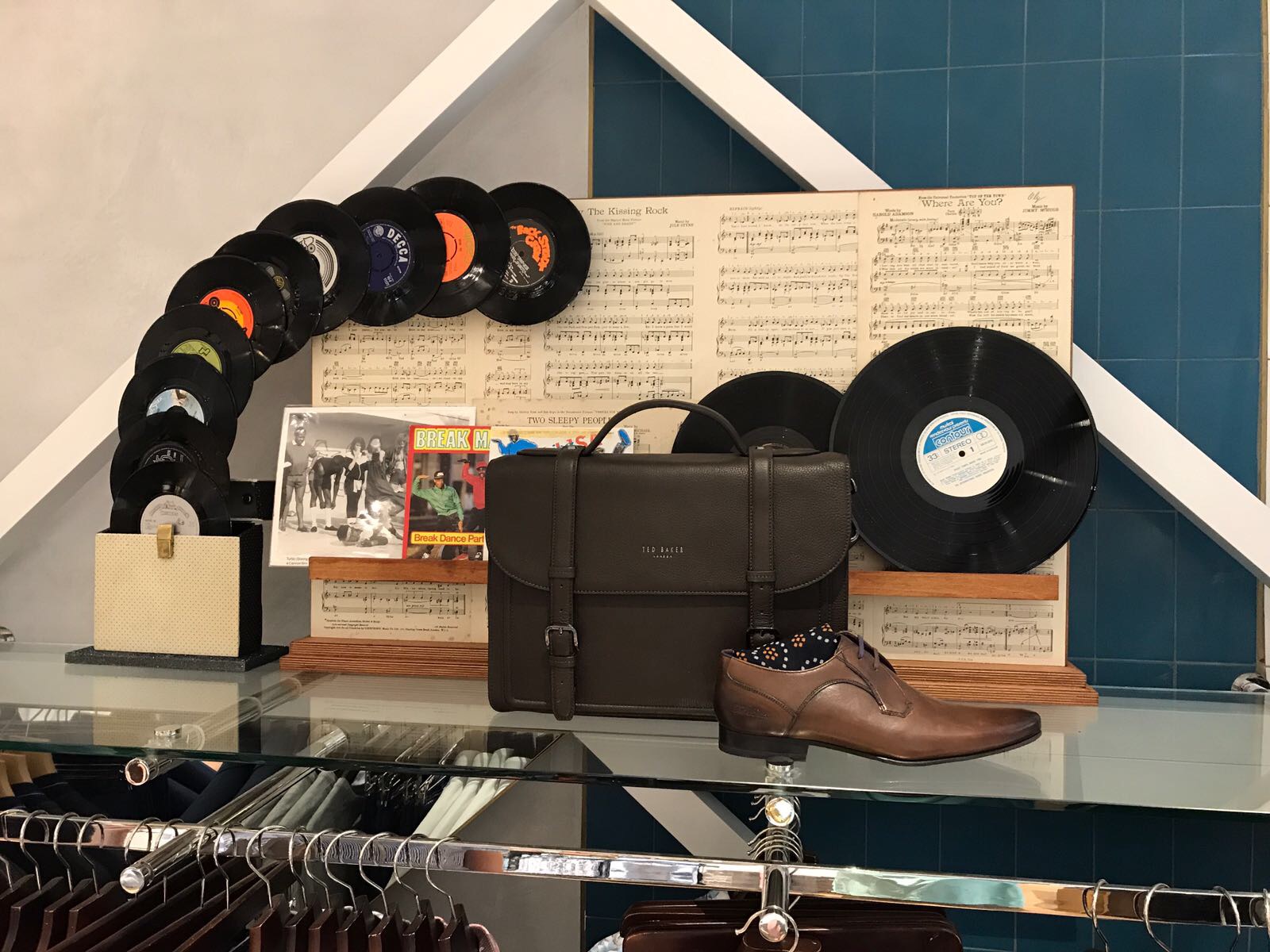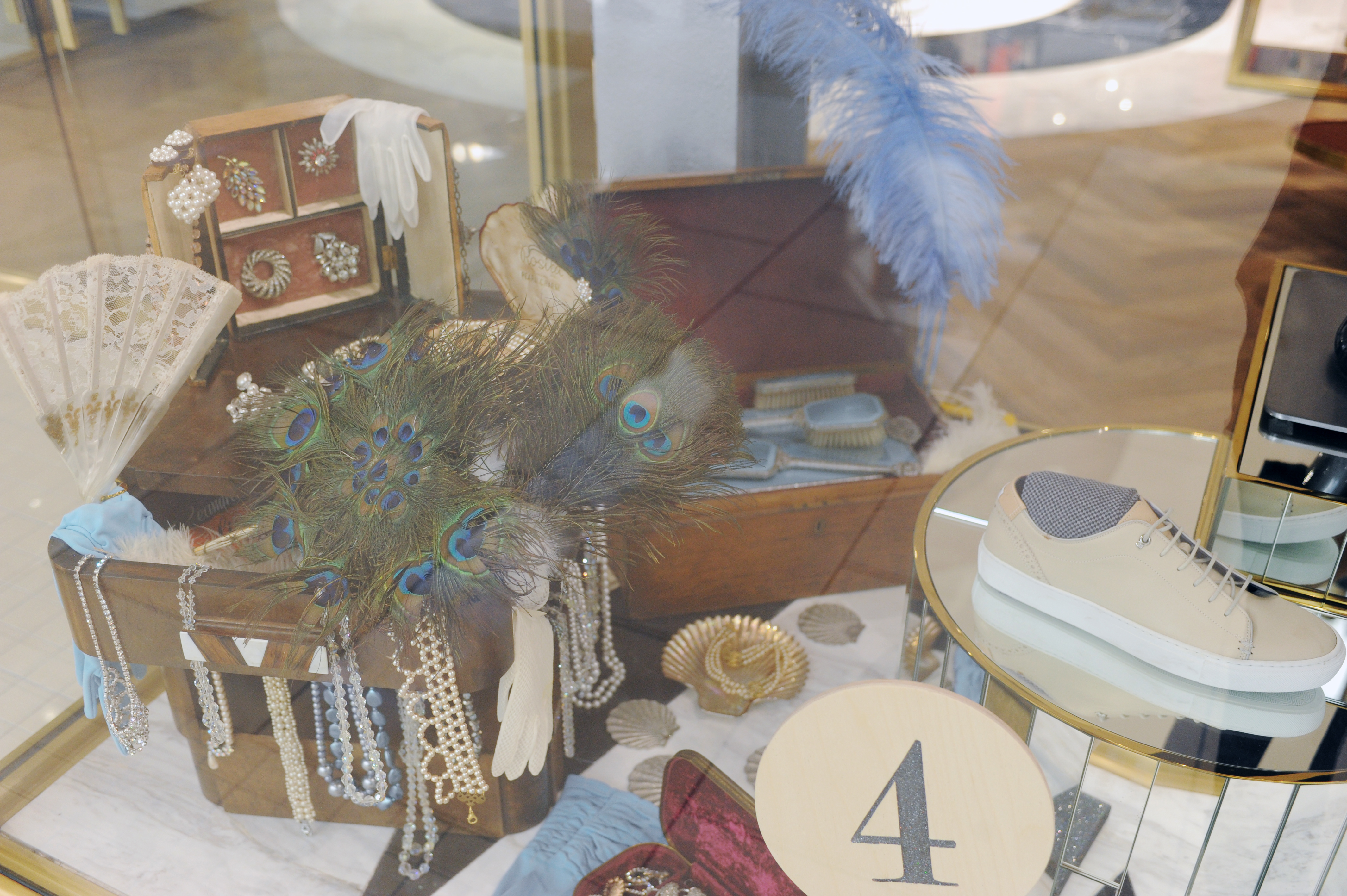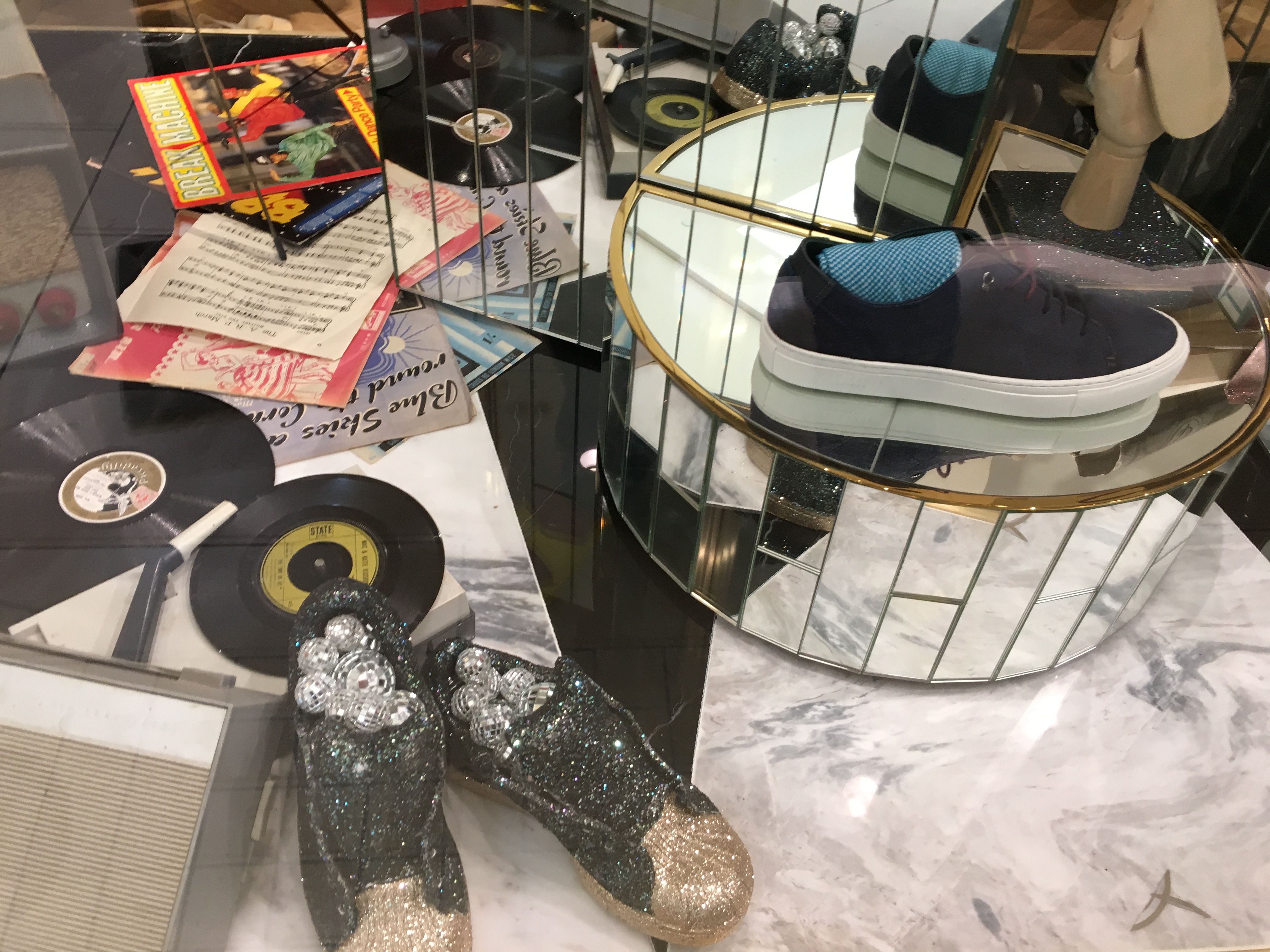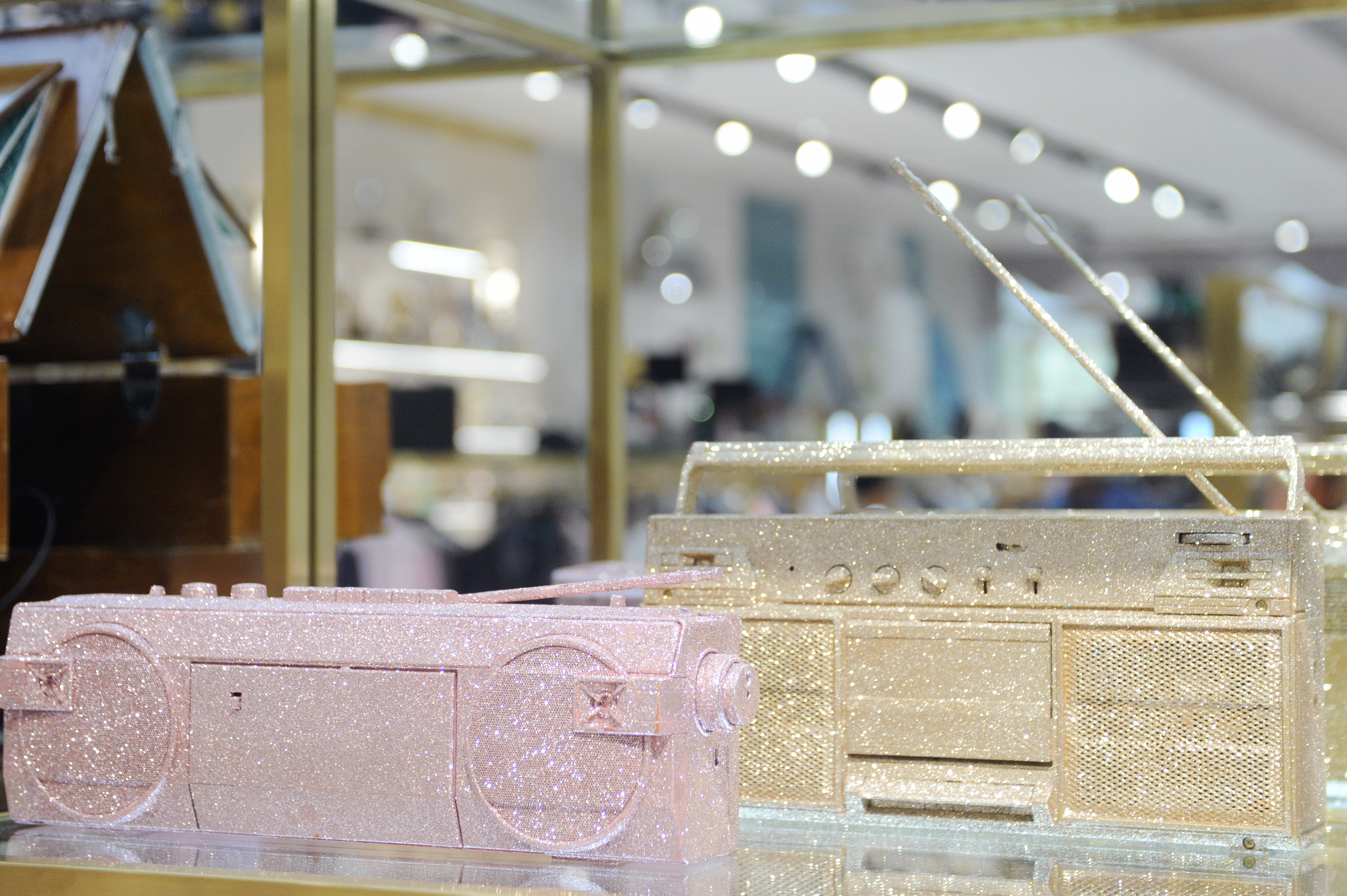 From old dancing trophies to ghetto blasters, ballroom dancing shoes to retro trainers. Some of the items had special treatments – ghetto blasters were glittered, gramophones were covered in mirror tiles, adding the glitz to the era and a fun twist on the items which were displayed through the store and the windows.