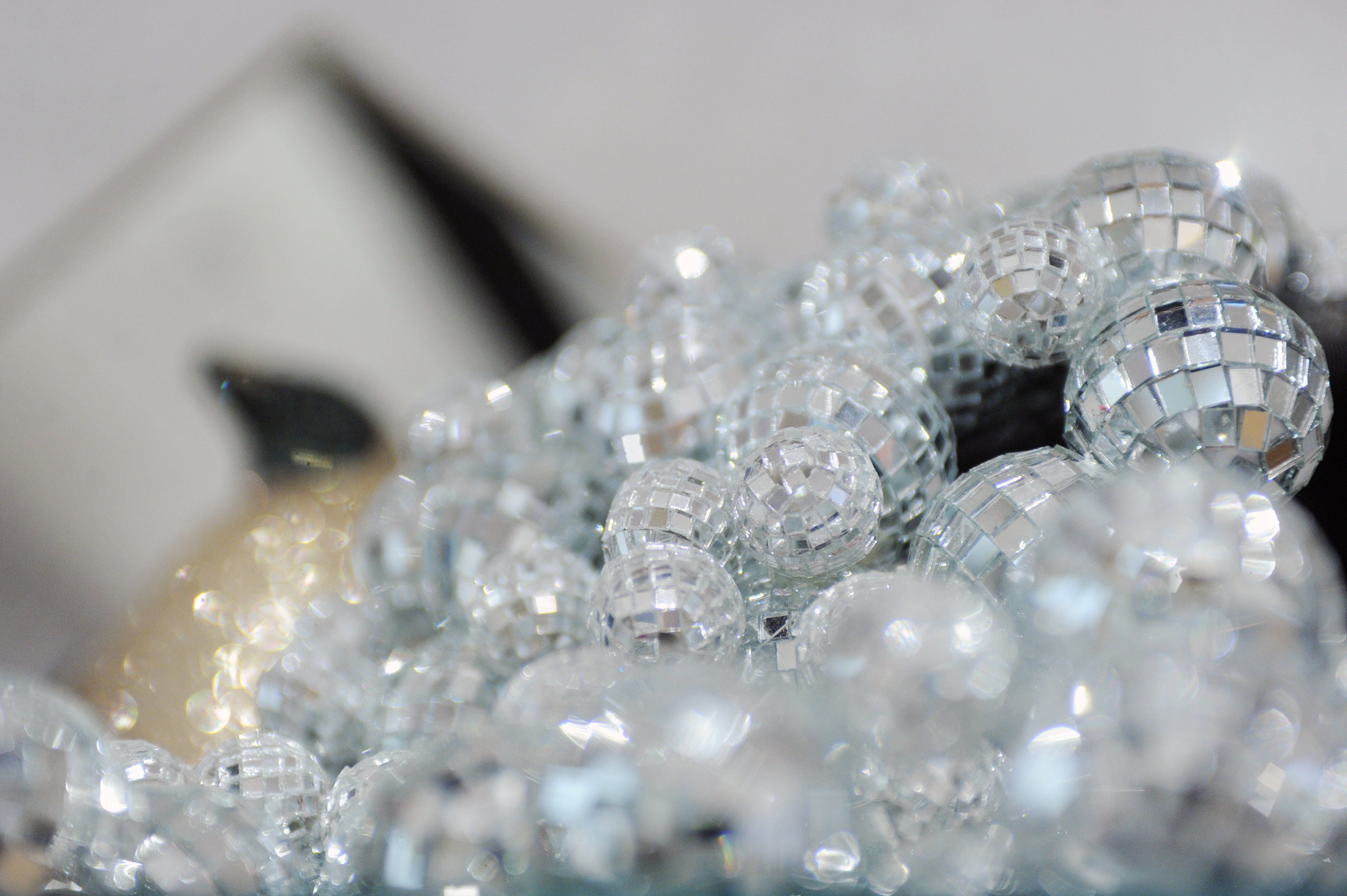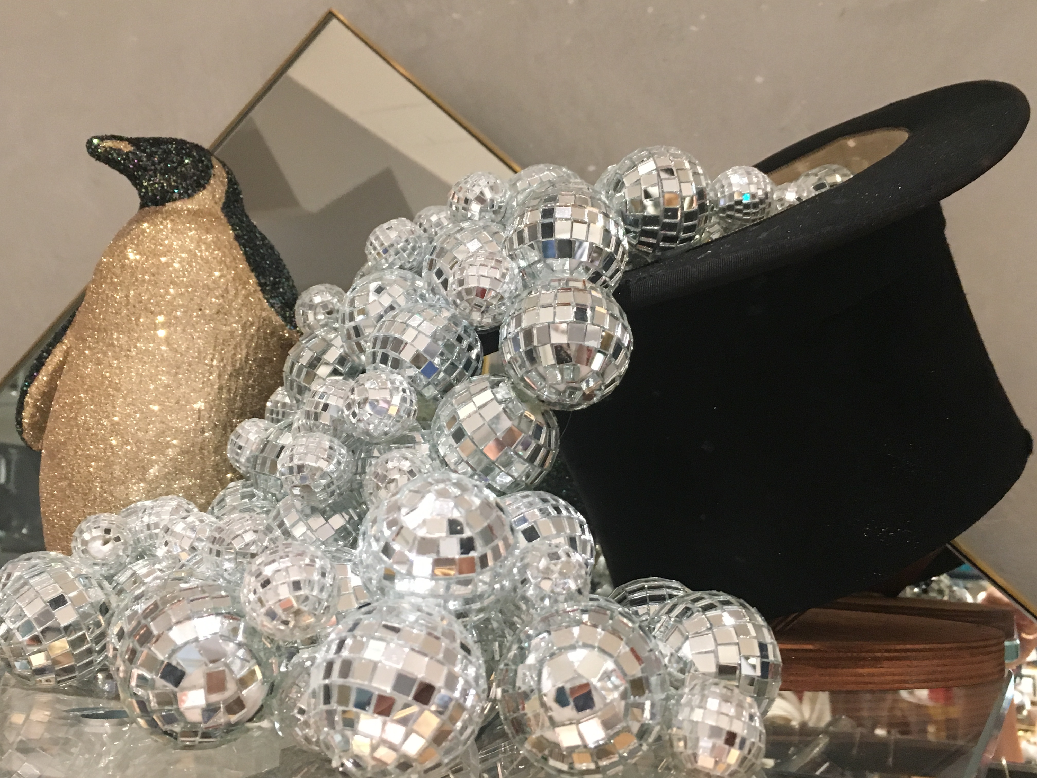 Champagne bottles had mini disco balls bursting from them, vintage top hats had the glitter balls tumbling out from them. Vintage bow ties looked to be tying themselves in a beautiful glass cabinet.