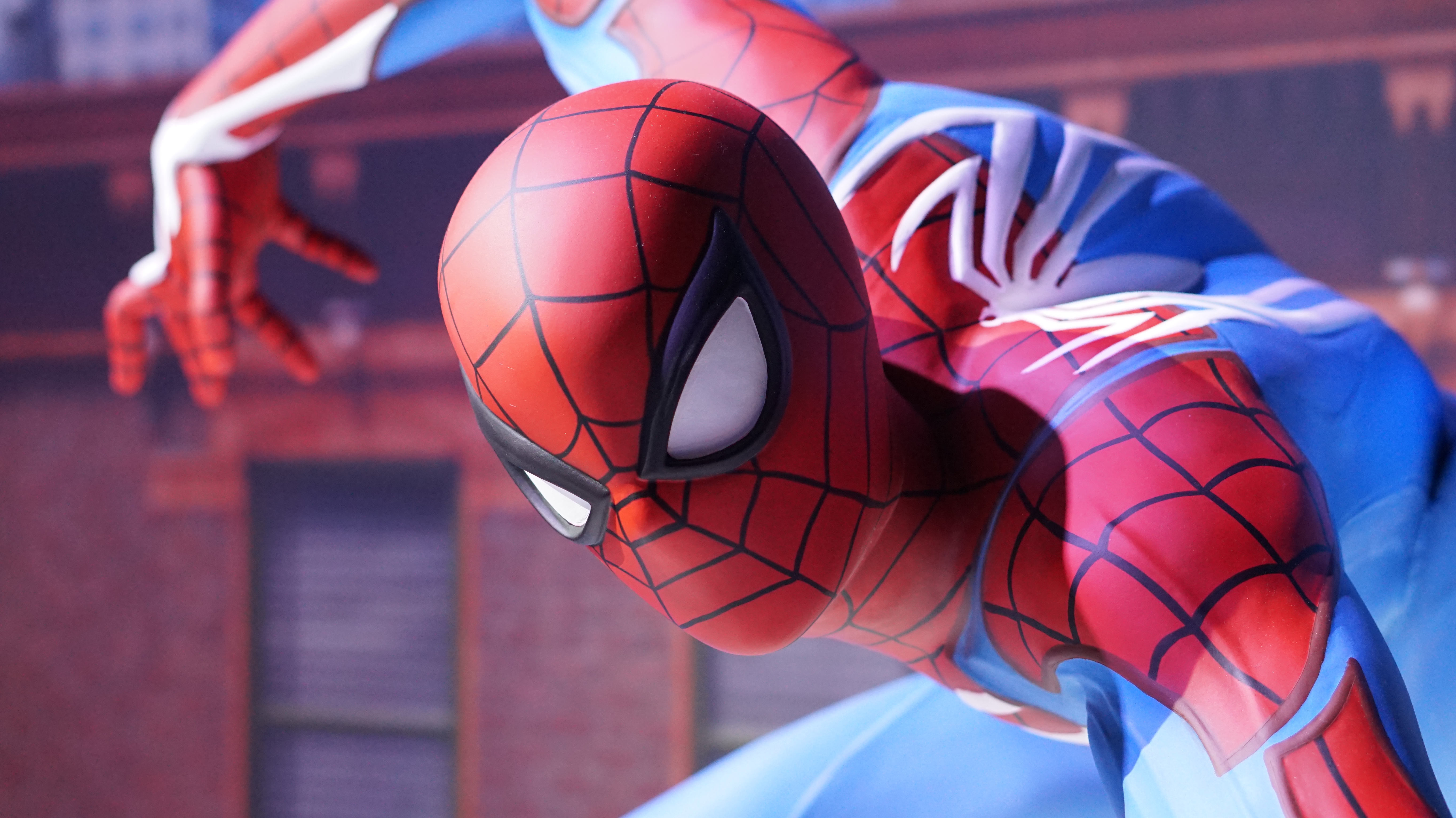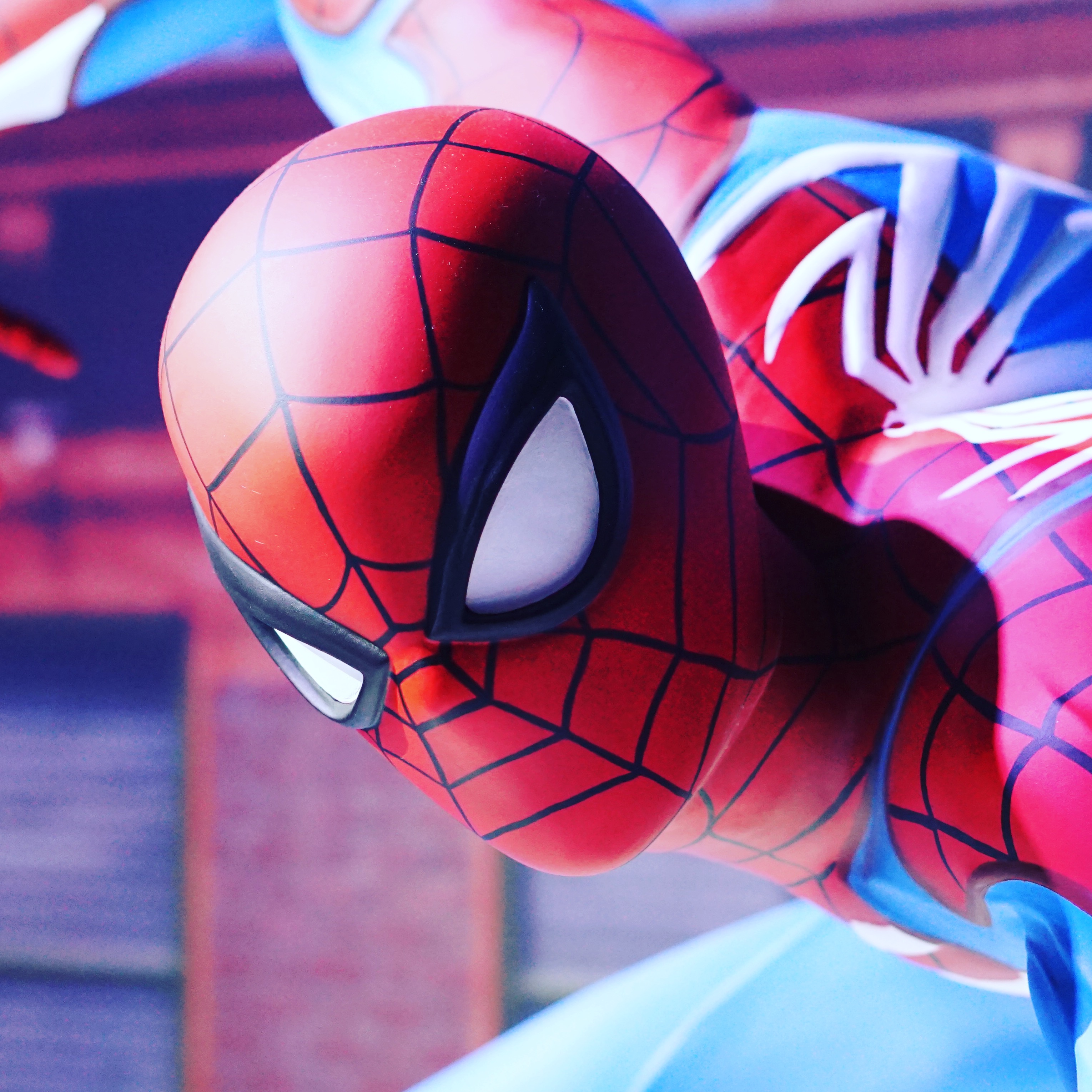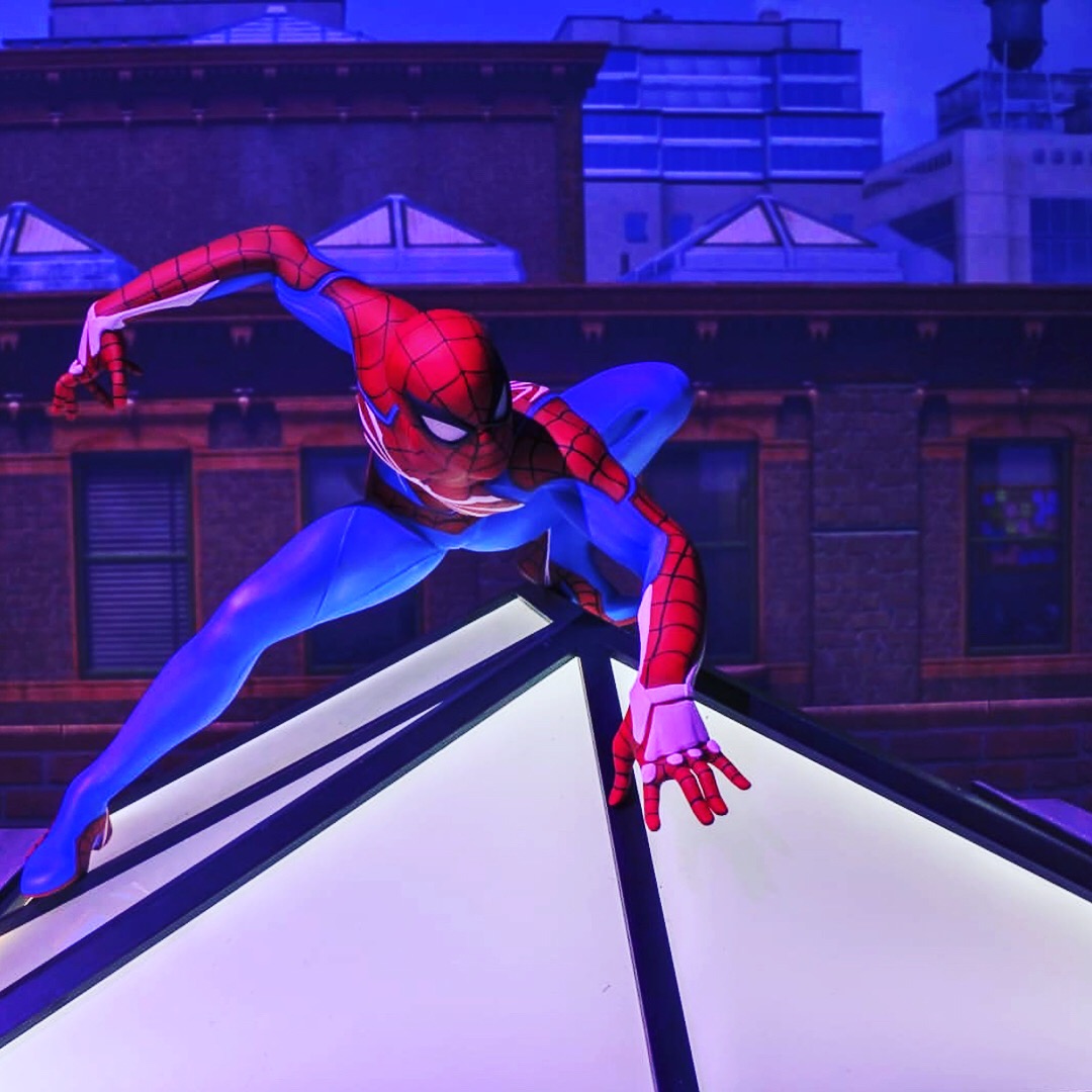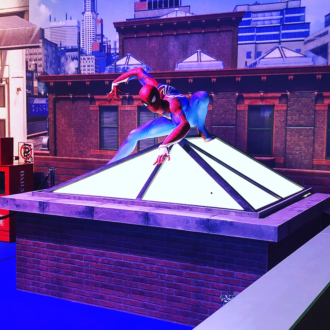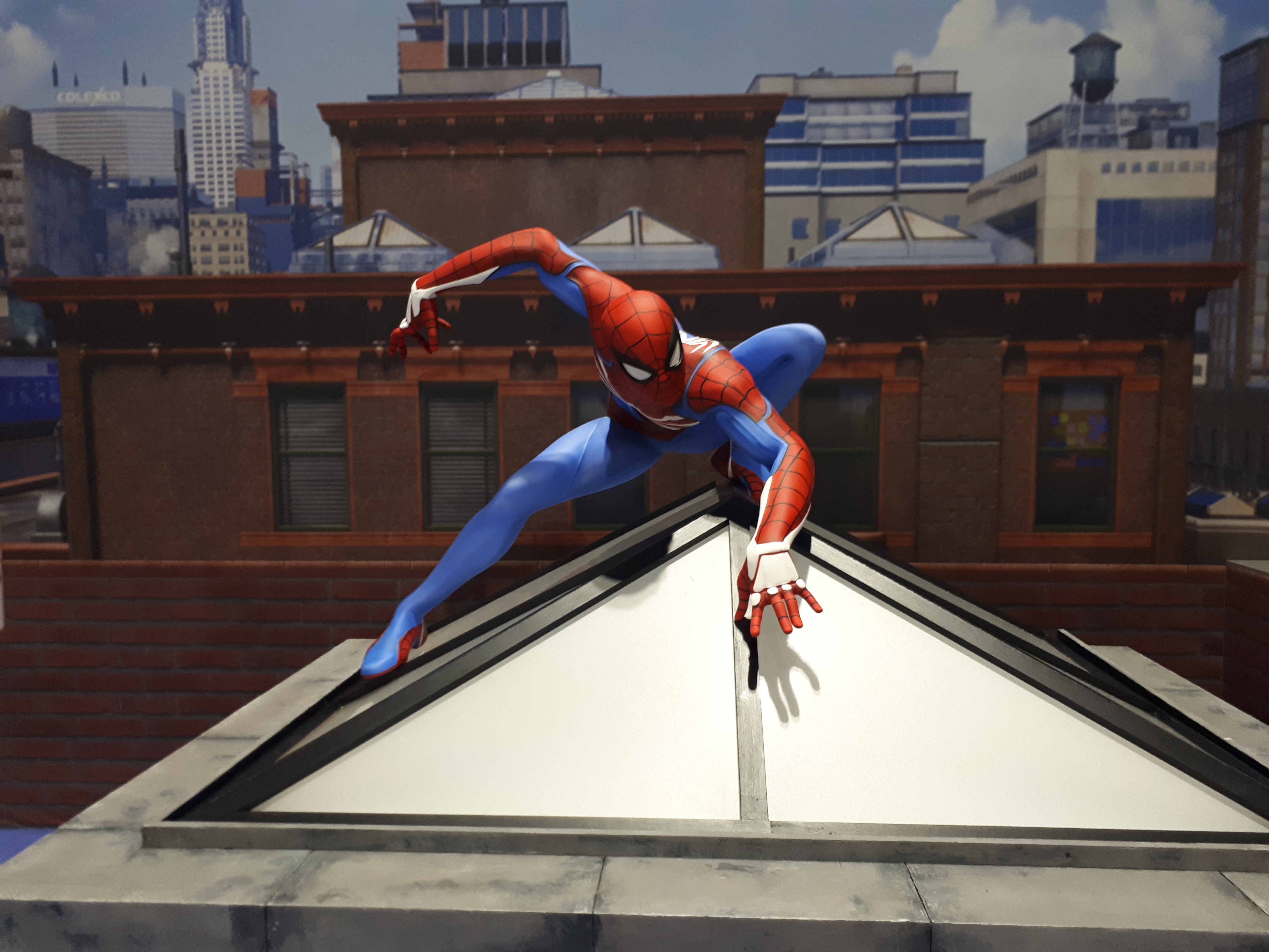 Spider-man was bespoke made, poly carving, 3D printing and hand finished with a hand spray painted finish with all the details of the new suit for the PS4 game, with direction from Marvel and Sony.