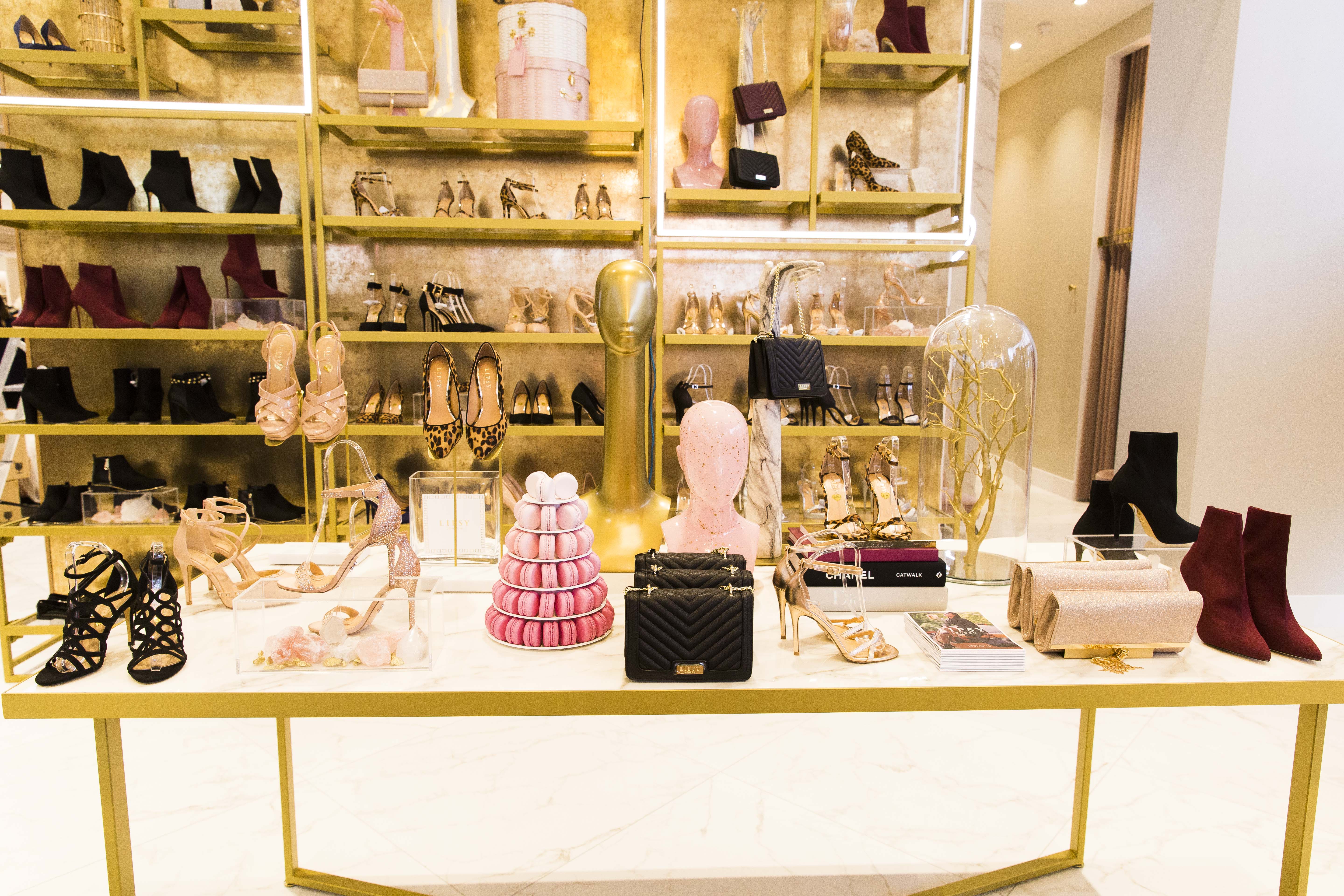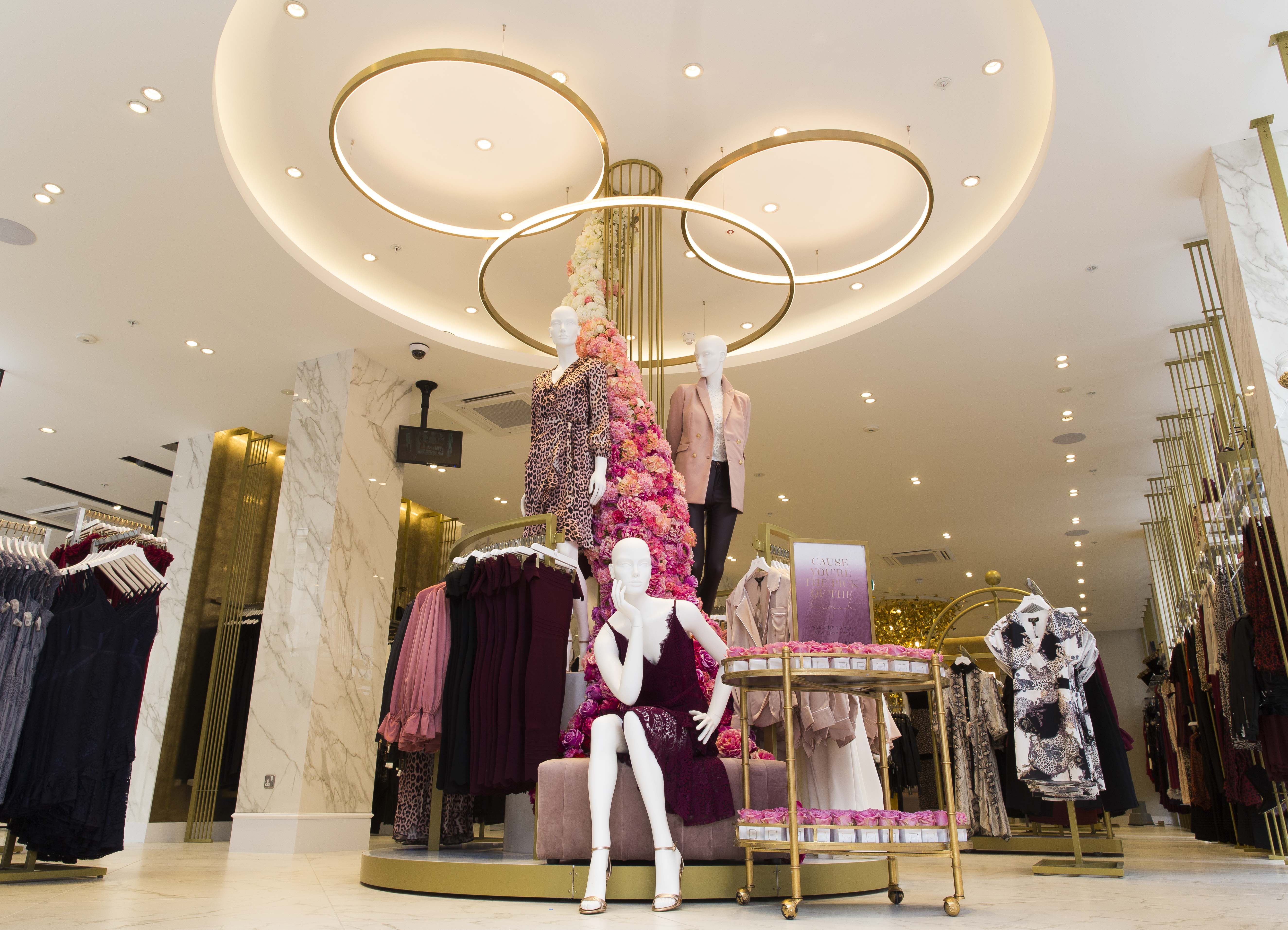 Branded luggage flocked and gilded hat boxes, artefacts in glass cases, macaron towers and champagne sculptures, shoe and accessory risers, and an amazing gold butterfly chandelier feature throughout the store, giving a luxe but fun feel. A huge ombre floral cascade has been created for the entrance to greet shoppers into the new space.