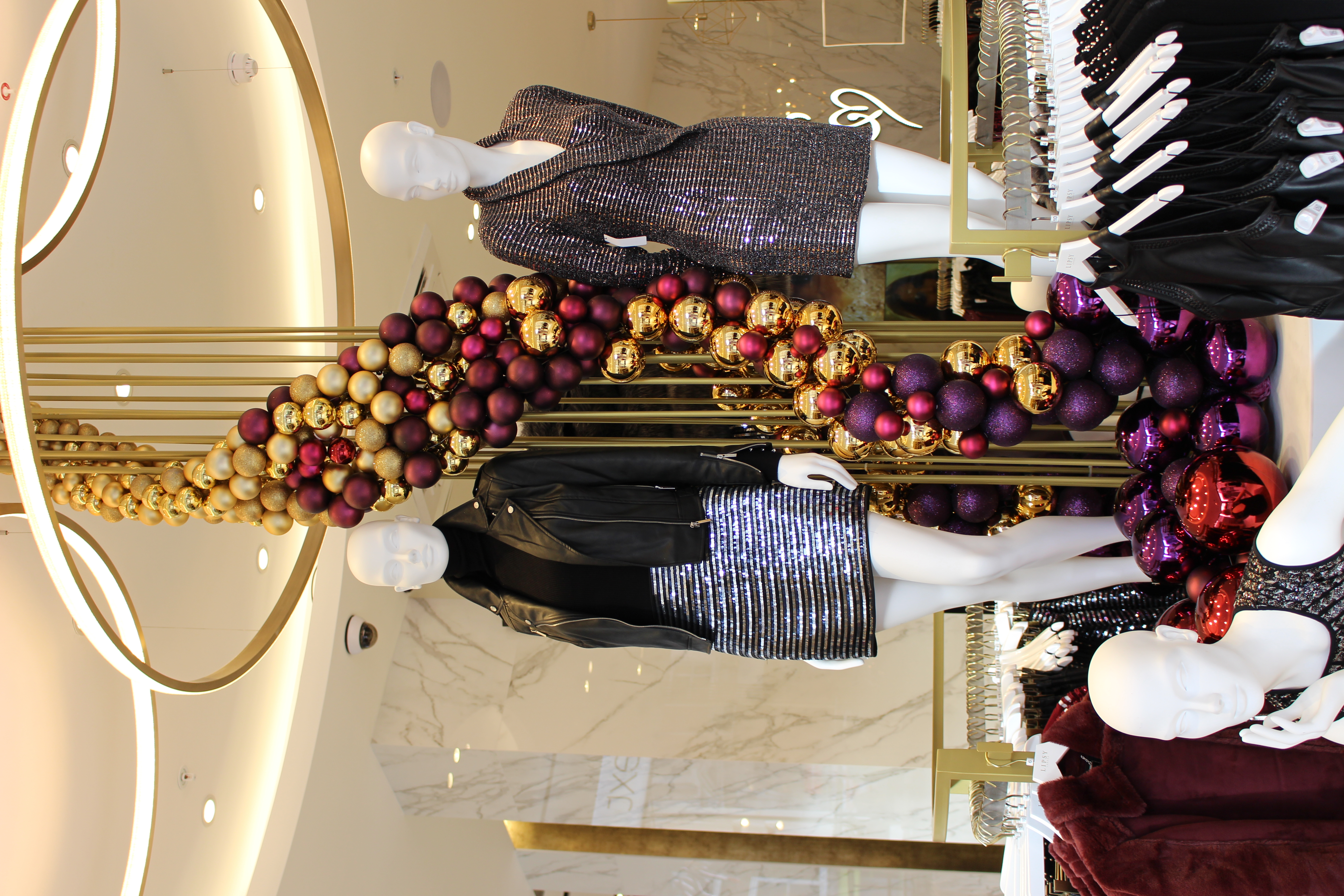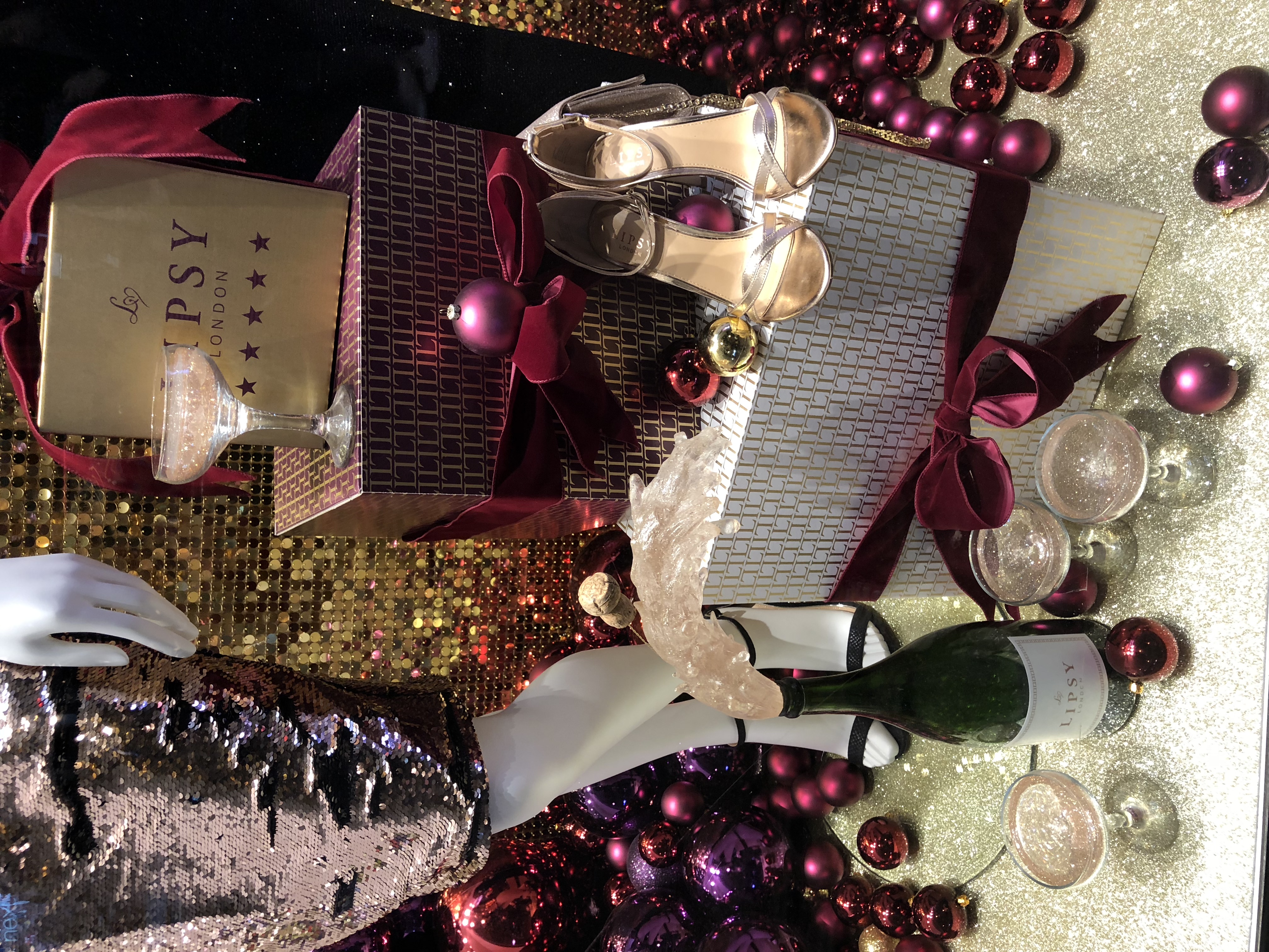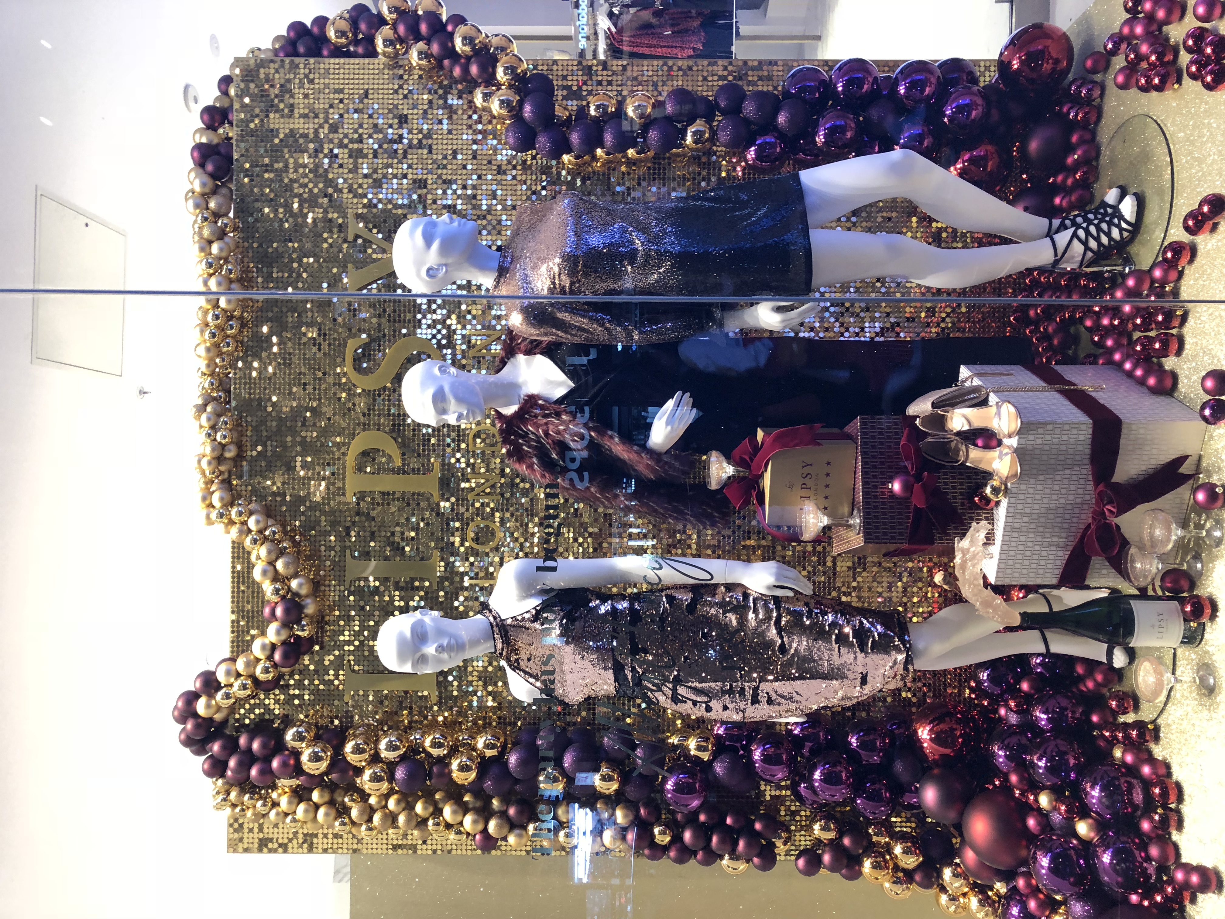 We created a large spiralling display of baubles in gold, berry and deep red around the central column in the entrance to the store. The berry tones and baubles continued through into the windows framing a gold sequin shimmer wall and cascading down onto a gold glitter floor.