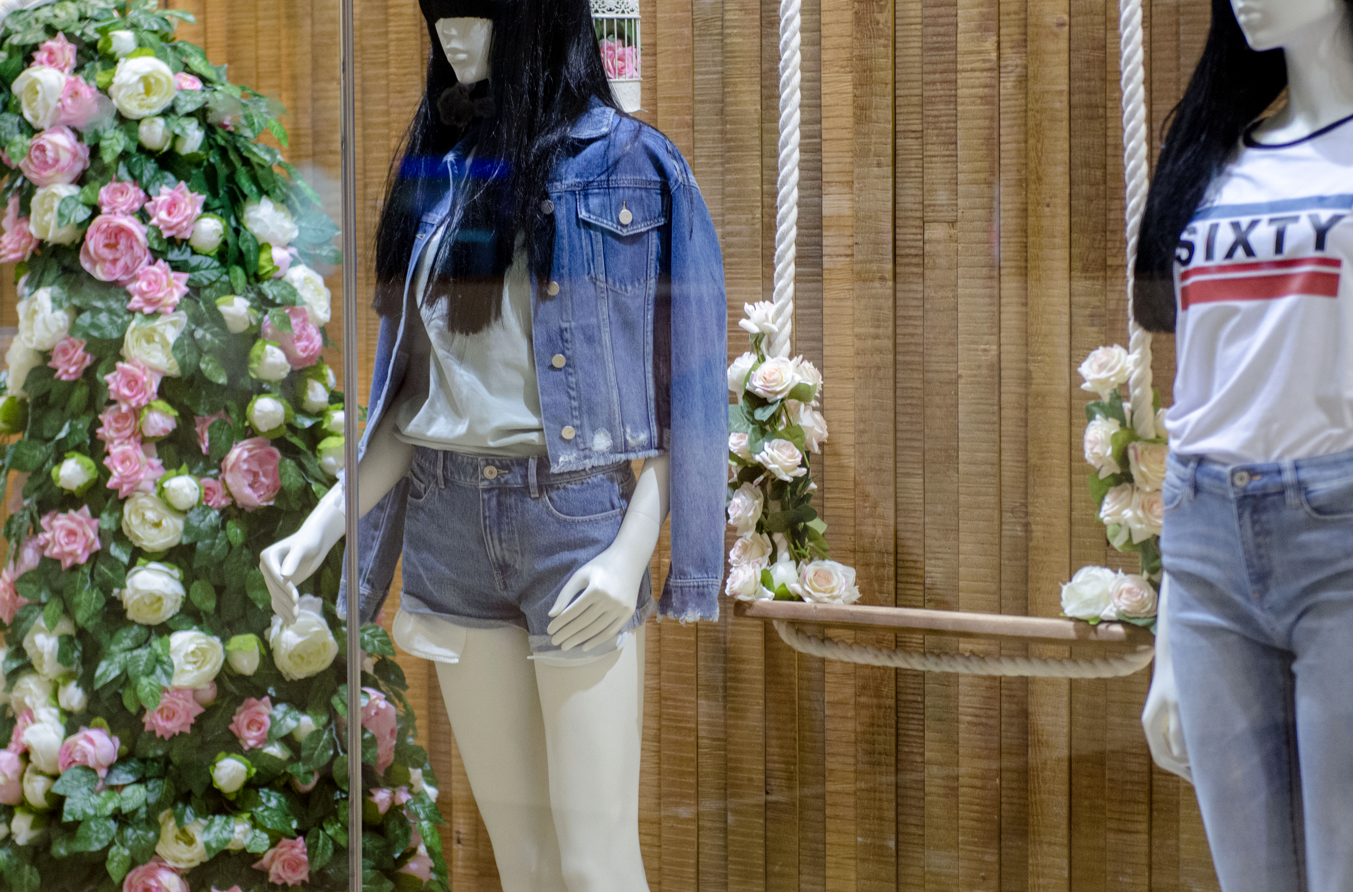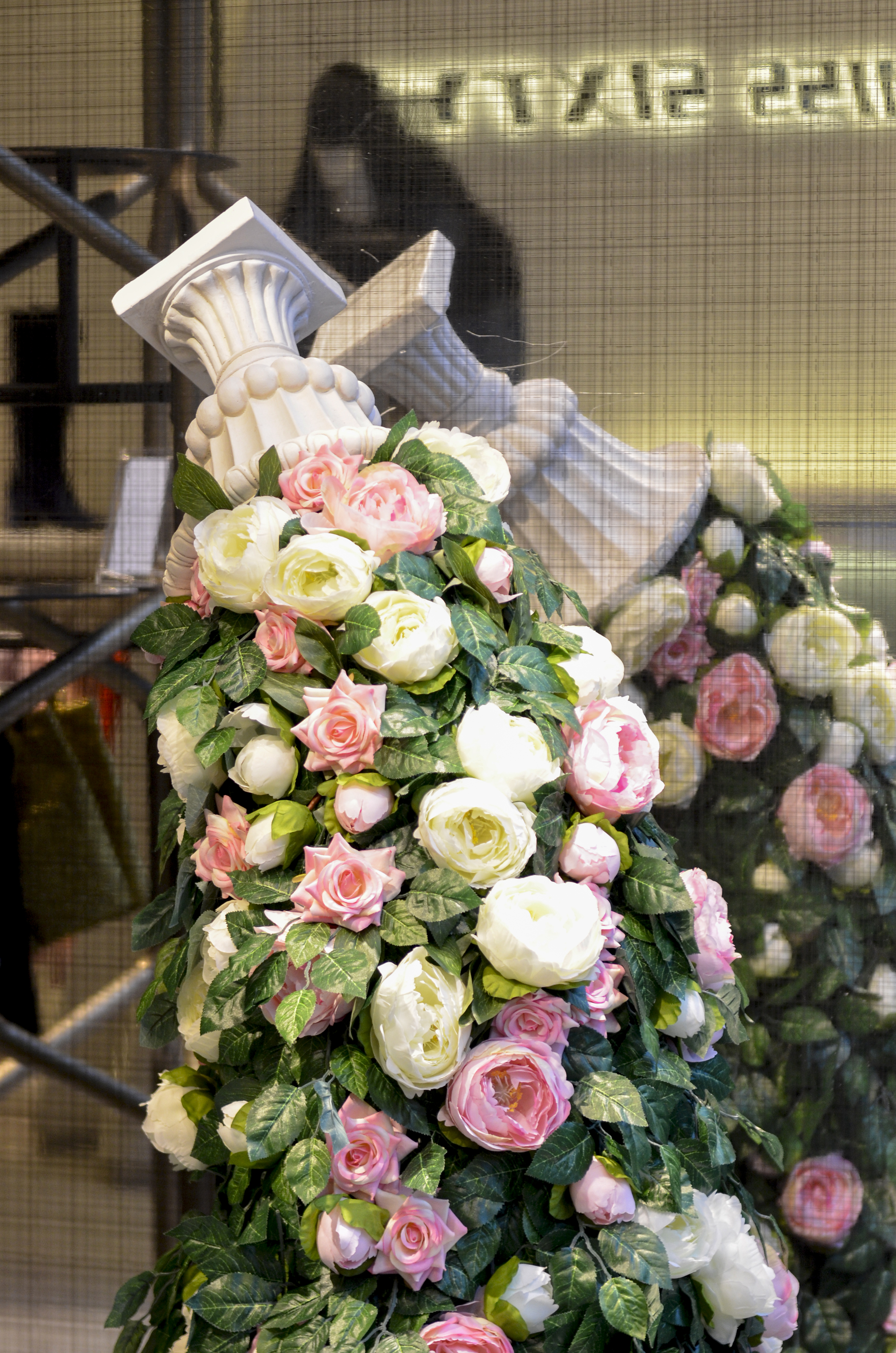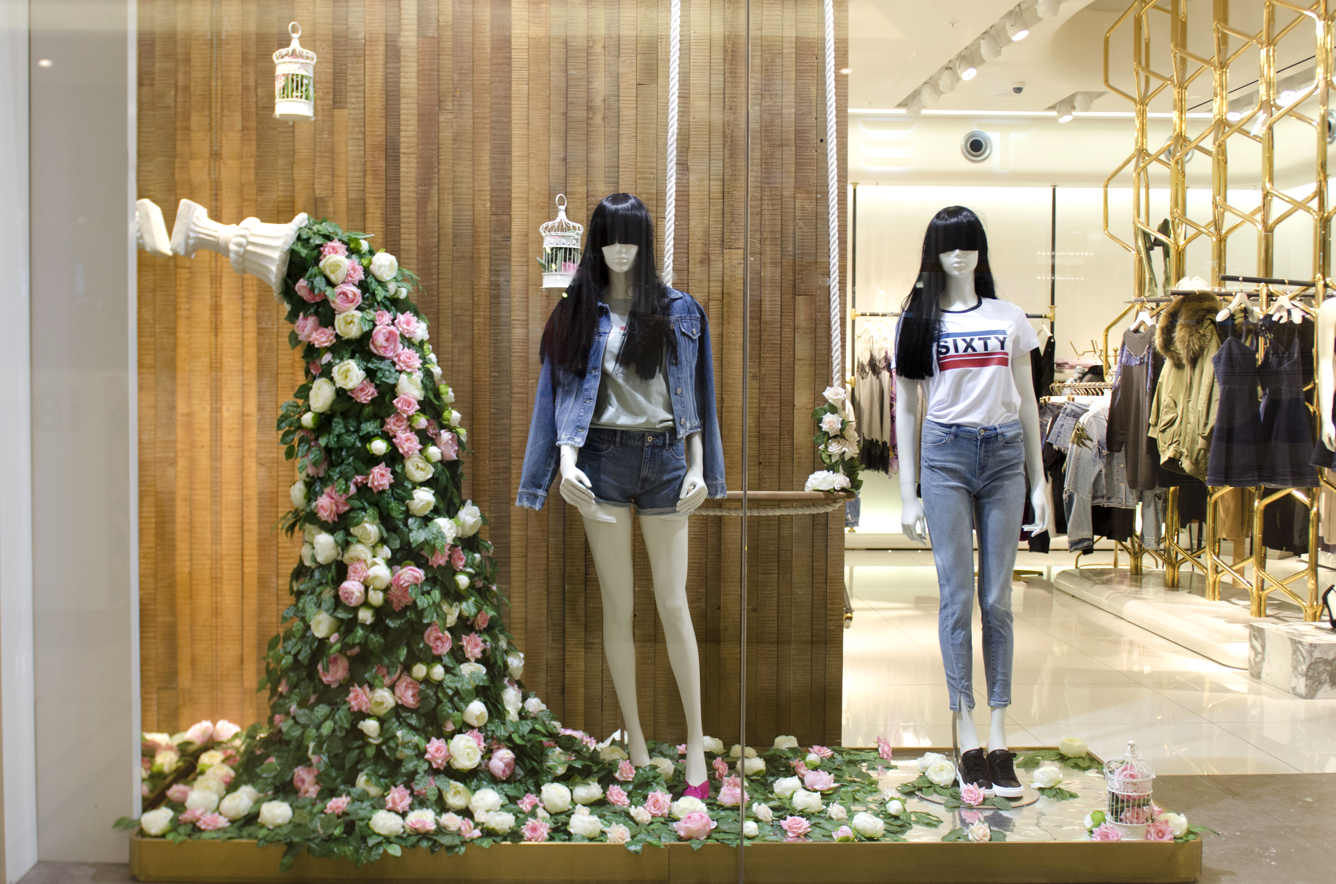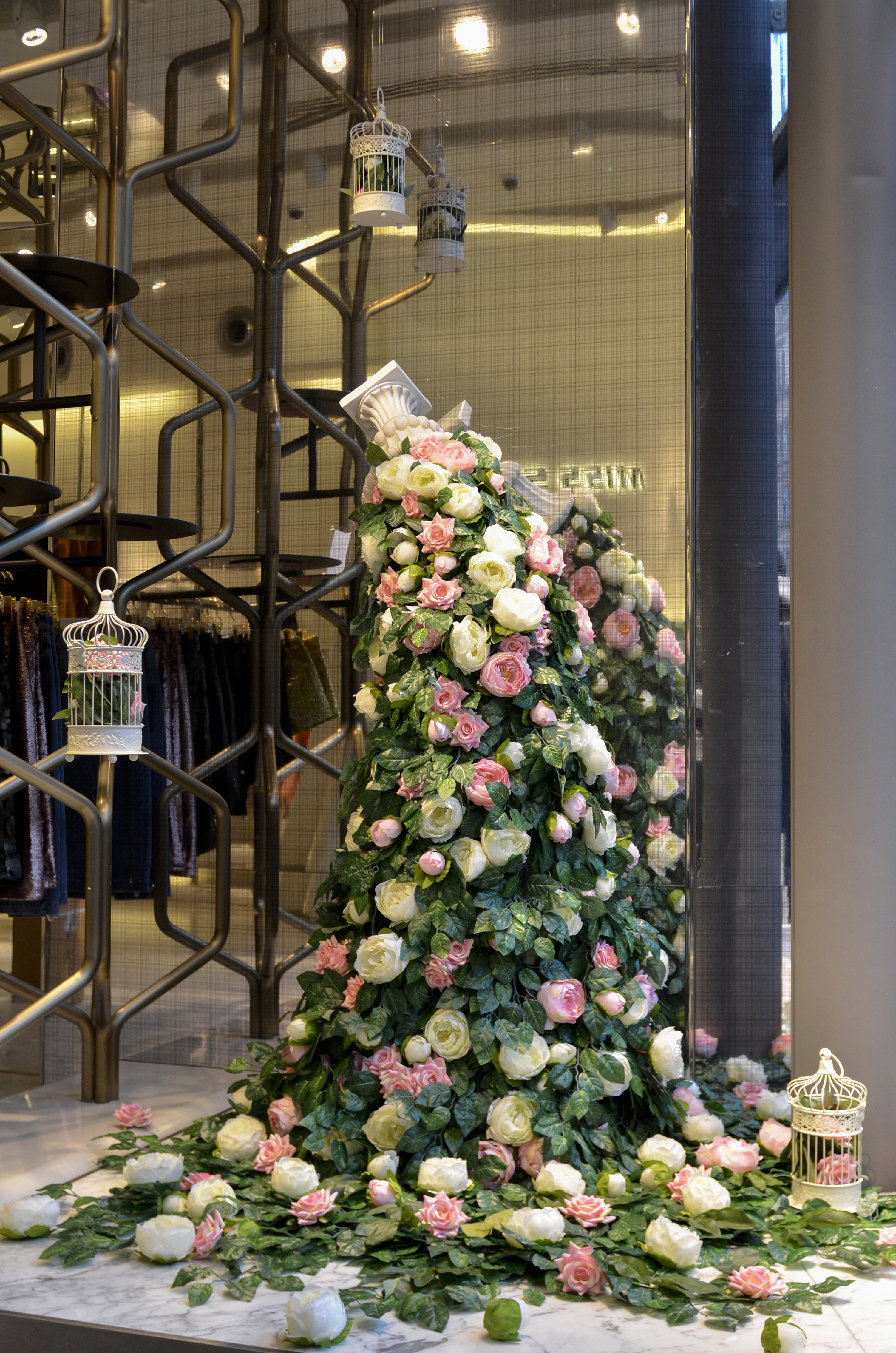 The design concept, which will be seen in Miss Sixty stores internationally, was made up of hundreds of beautiful spring coloured flowers, tumbling from floating urns, floating mini birdcages filled with flowers and a vintage swing with floral arrangements.