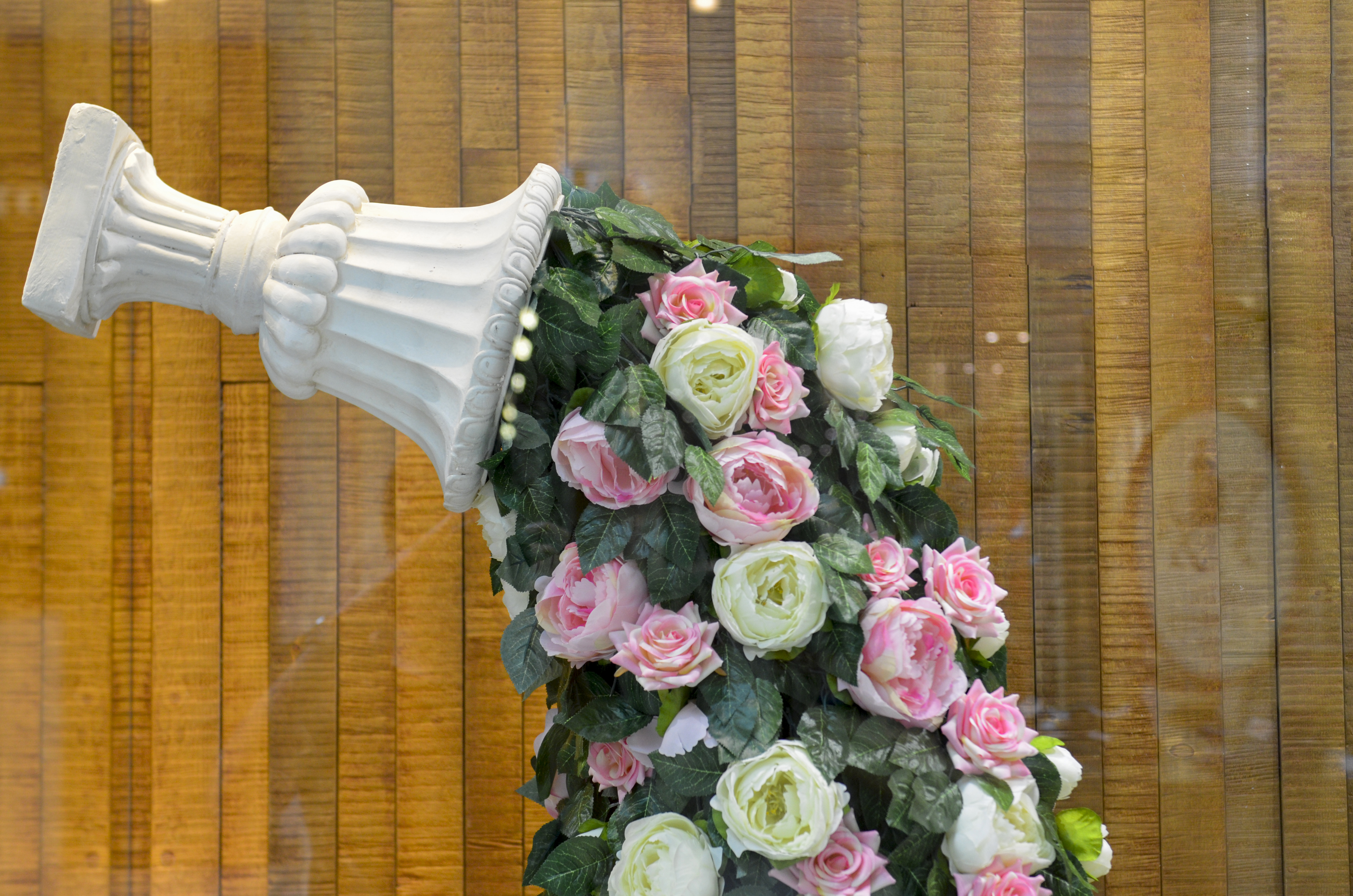 A polystyrene former created the base for the cascade of flowers. Carved by the team, it held its own weight with the urn attached. And the hundreds of flowers were hand applied to give the impression of them spilling out of the urn.