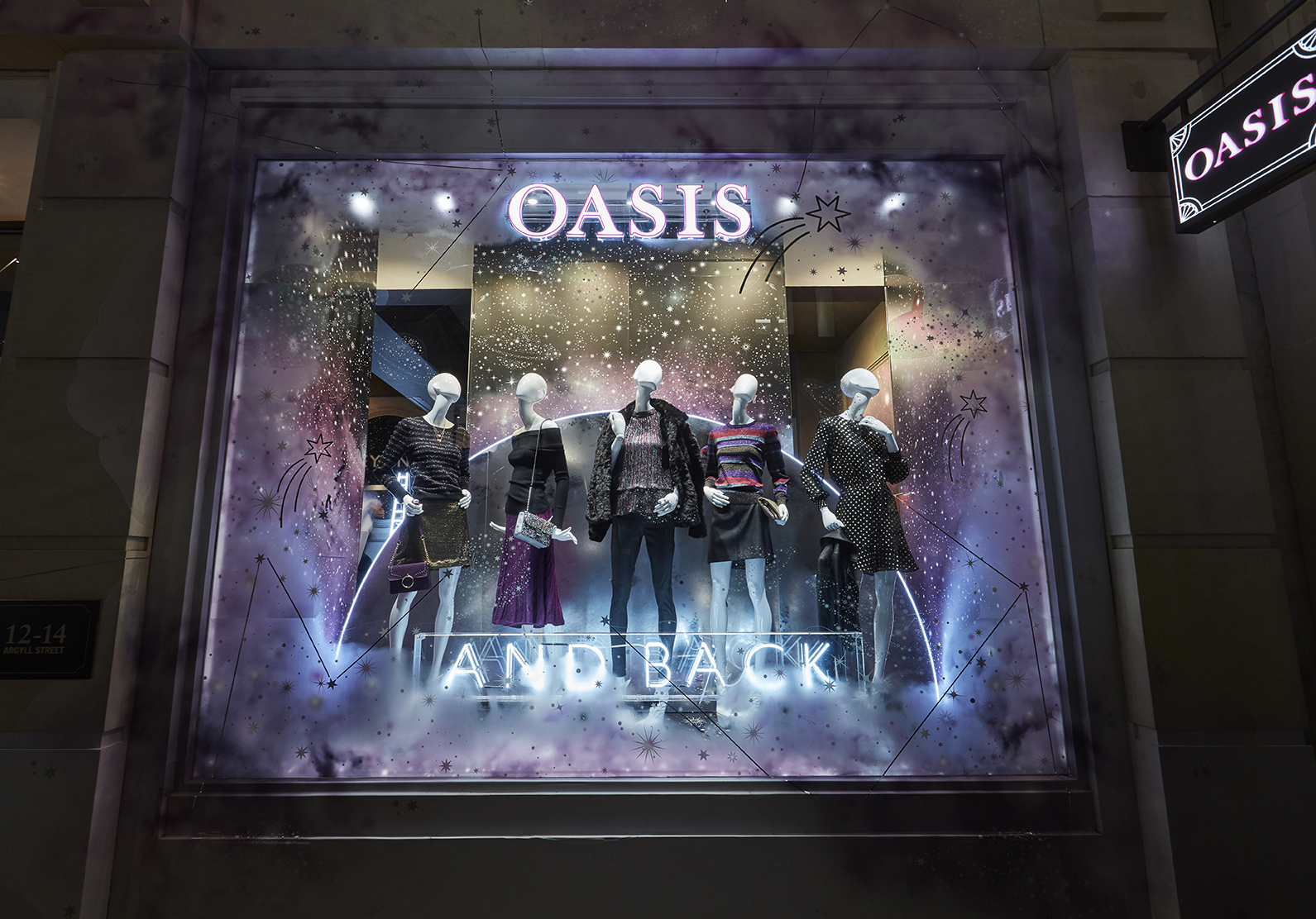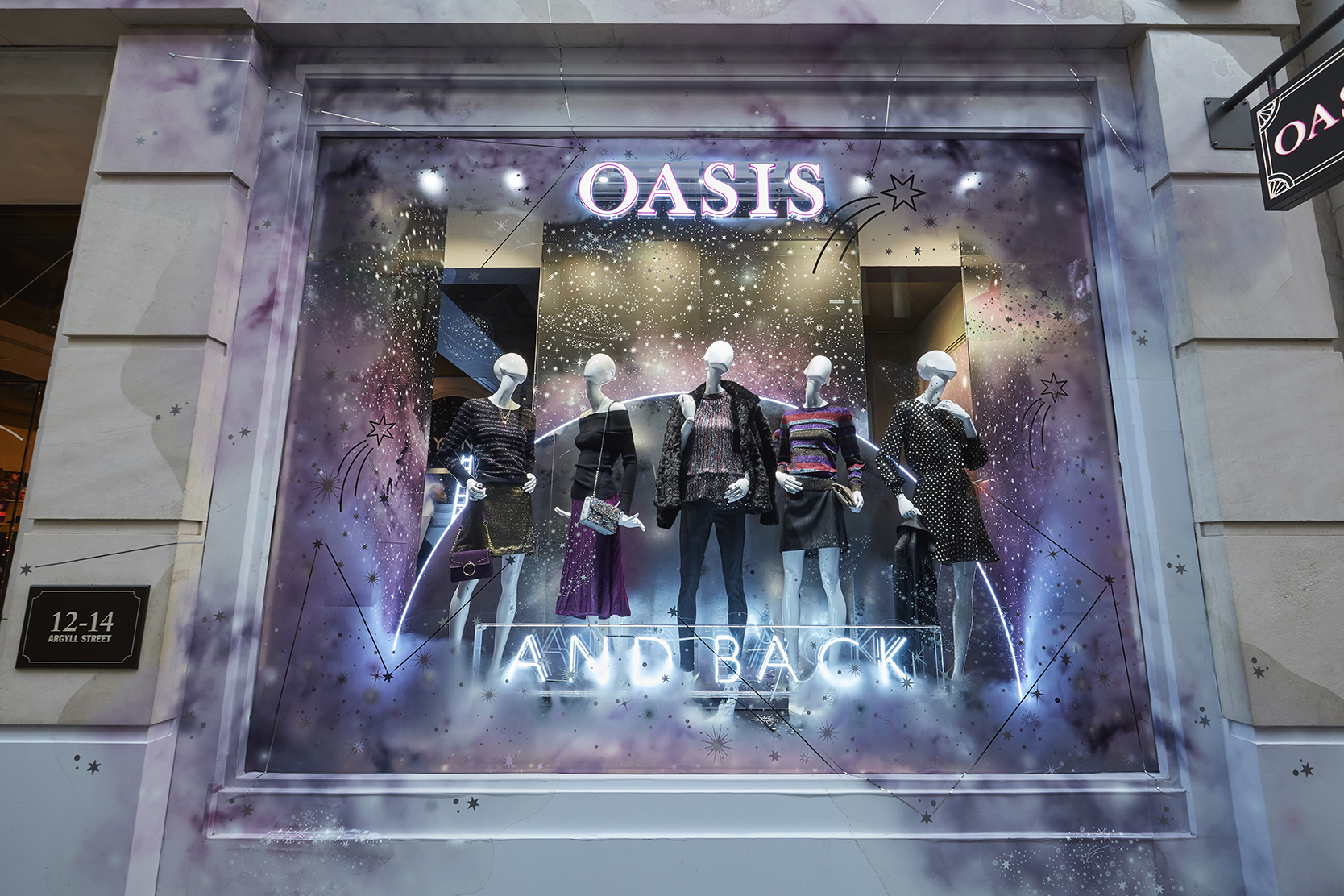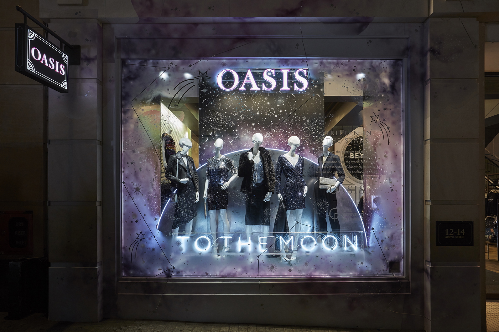 To The Moon And Back, was the theme for Oasis’s Christmas window scheme this year, and Hello Flamingo helped to bring their concept to life. Keeping this years design clean and modern, Hello Flamingo supplied the large oversized moons edged with a cool white neon in the Argyll Street flagship store windows, and were also responsible for supplying an LED lit version to 6 of their ‘superflag’ stores around the UK.