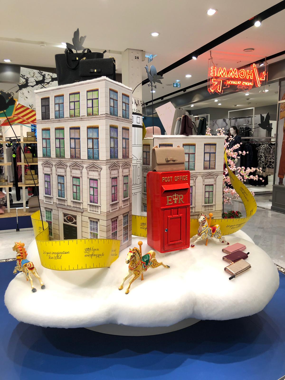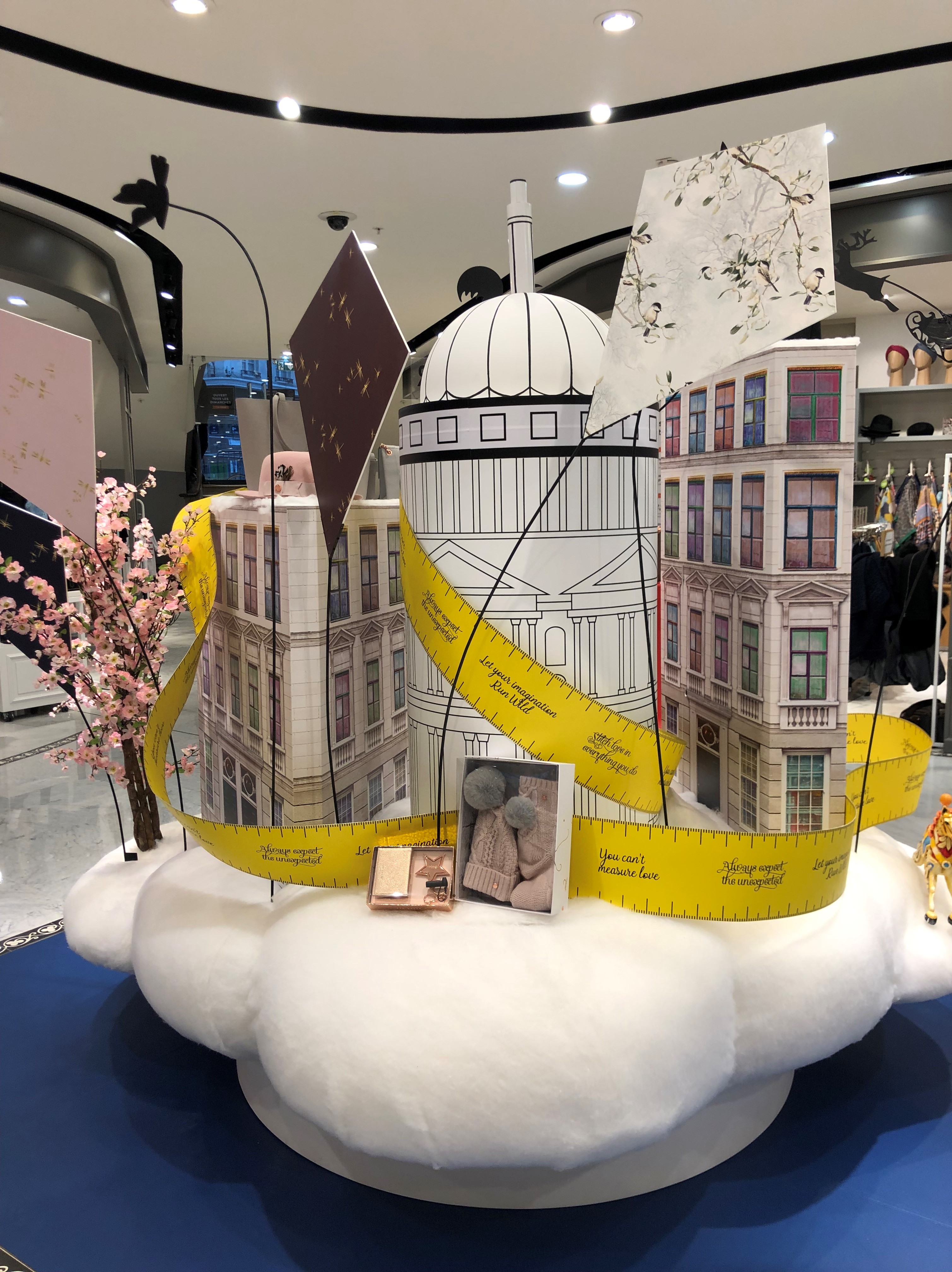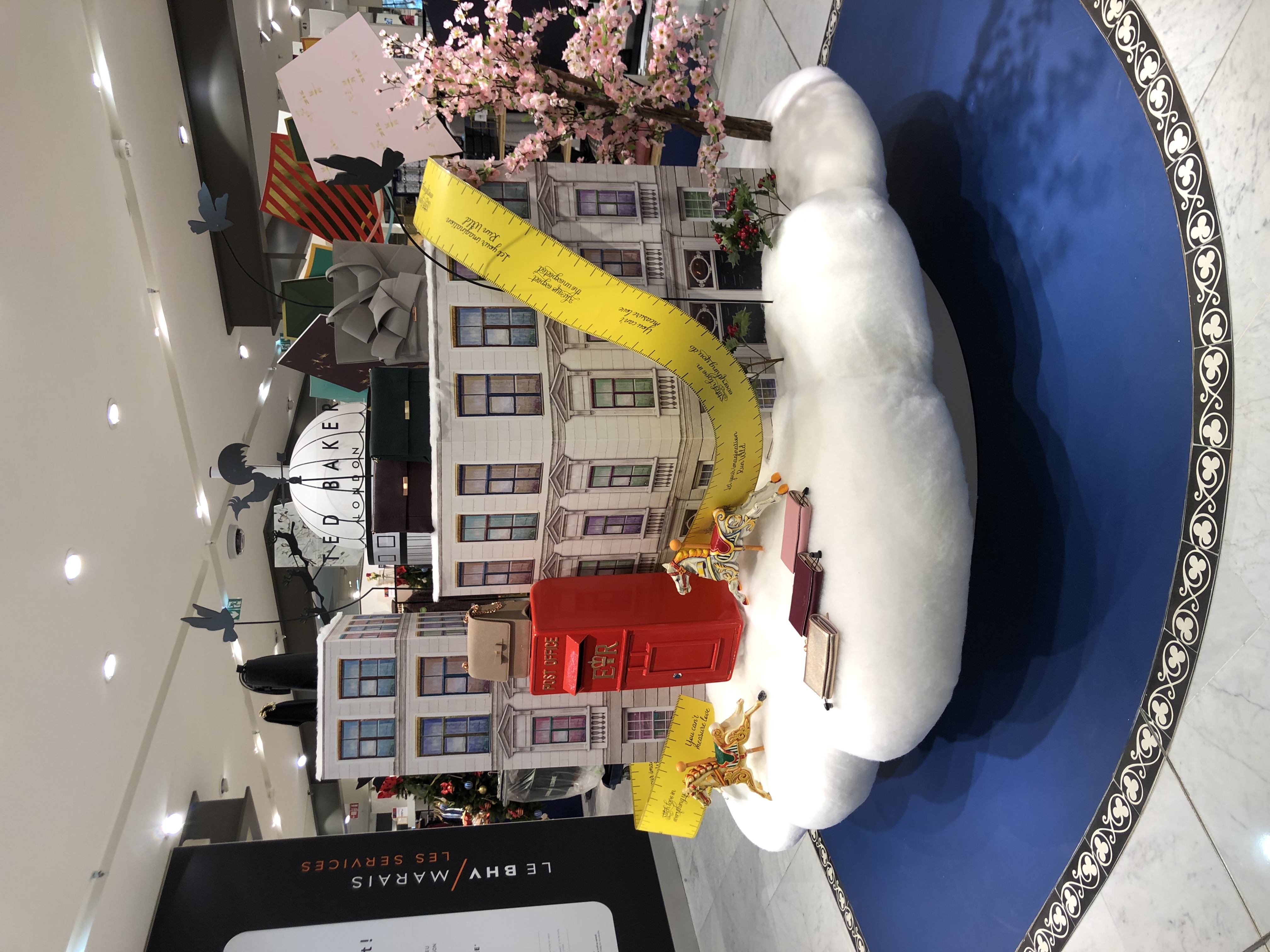 Hello Flamingo was very excited to manufacture and install a Mary Poppins pop up display for Ted Baker at Le BHV Marais department store in Paris this Christmas, to coincide with the release of the ‘Mary Poppins Returns’ movie The pop up took inspiration from various moments in the movie, featuring a giant 2.5 metre diameter, hand carved, cotton candy style cloud as the central feature. The display included various London style terraced buildings, and even a St Pauls Cathedral! Ted Baker gift ideas were highlighted, surrounded by kites, birds, carousel horses, and a 6 metre tape measure featuring classic Ted Baker quotes, which circled the display.