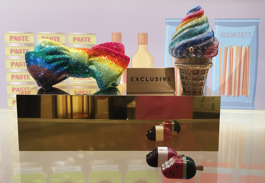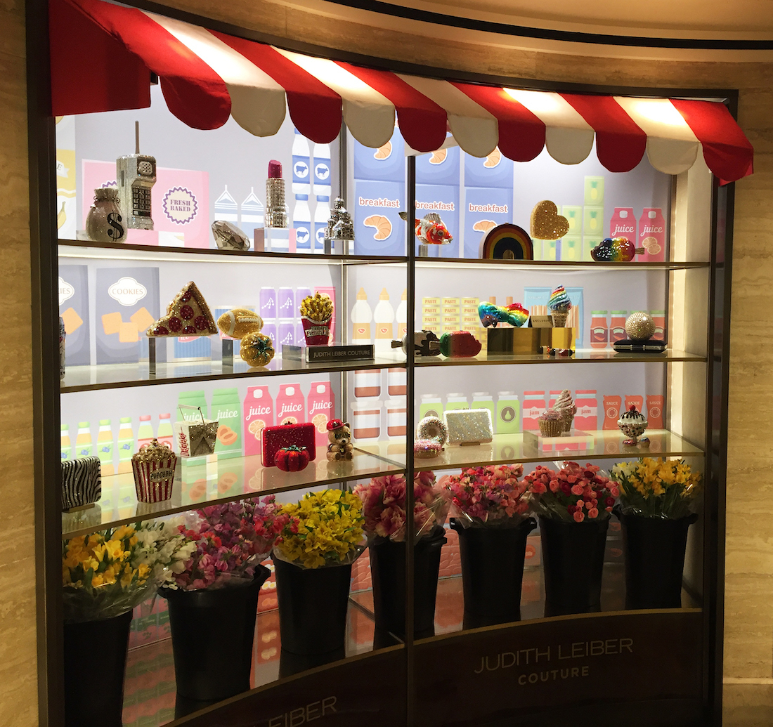Hello Flamingo, was approached by Harrods to produce a ‘Pop Up’ display for the Accessories Designer, Judith Leiber. The brief was to create a fun and vibrant market stall set within an existing shelving fixture, to showcase their embellished bags and purses and Hello flamingo created a red and white striped fabric canopy. We inserted printed shelves with stacked groceries into each of the shelves. To add a pop of colour and bring the stand to life we filled seven floristry buckets with bouquets of bright artificial flowers. The Accessories looked fantastic set within our little market stall, the perfect, fun and colourful backdrop to show them off.