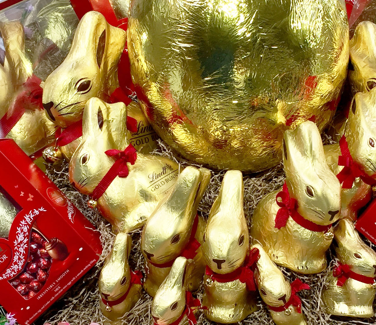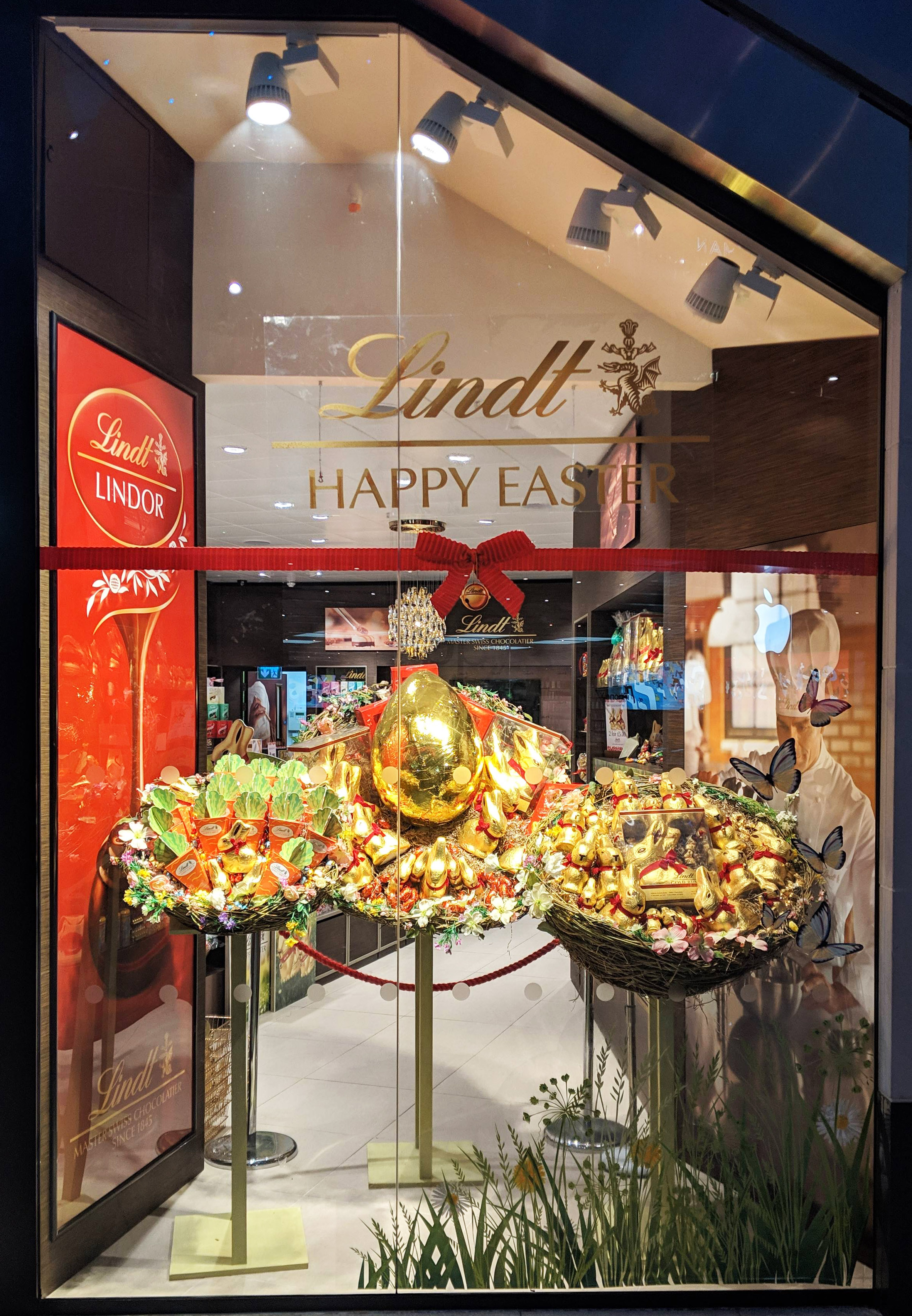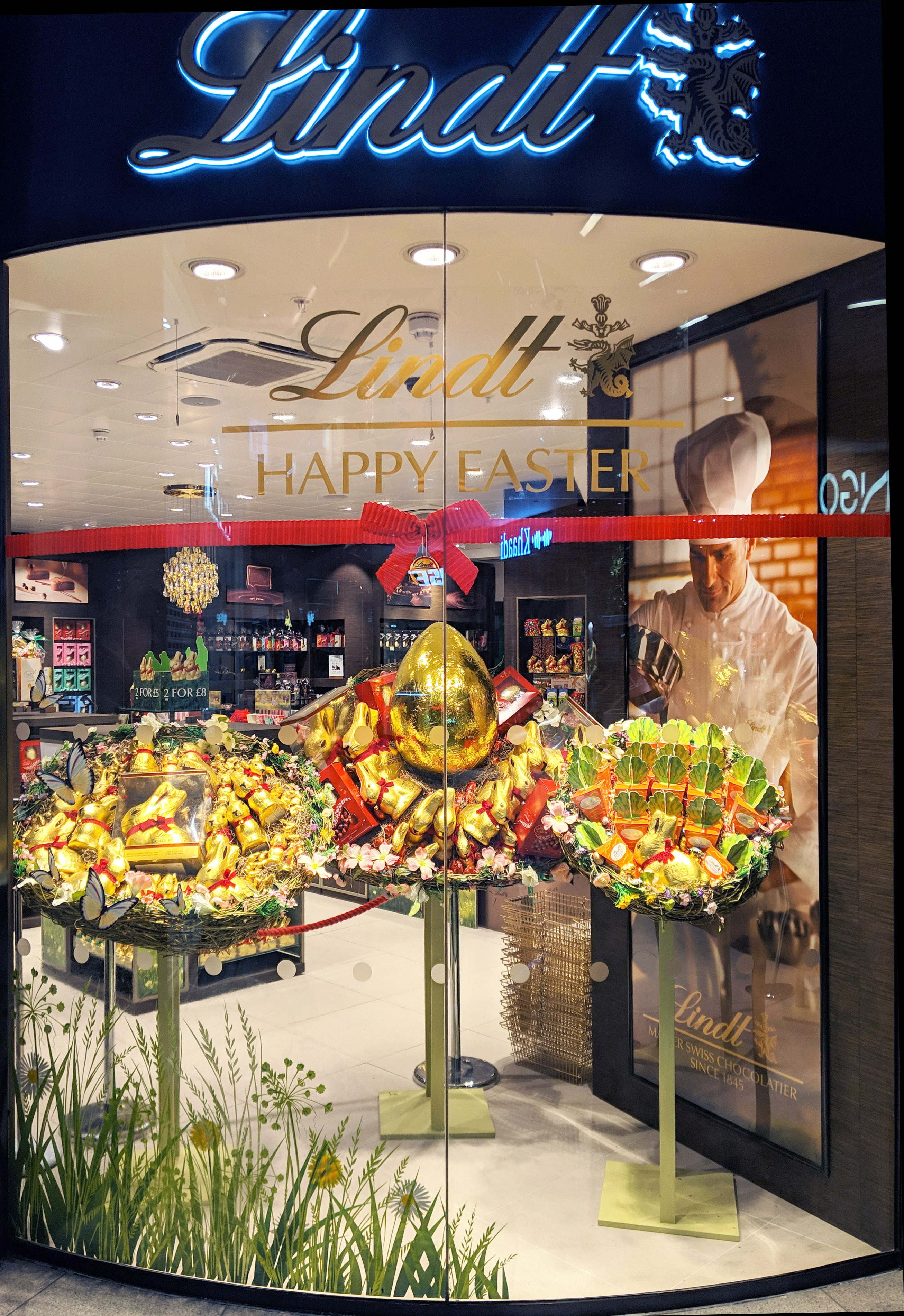The iconic red ribbon bow & bell featured as a window vinyl, with a gold foil ‘Happy Easter’ Lindt logo and a decal of meadow grasses to add to the Spring feeling.