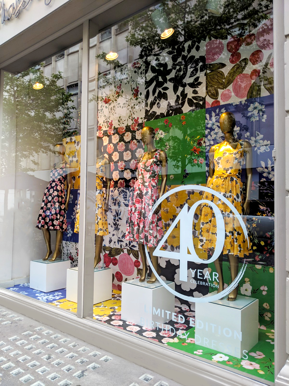 Phase eight fashion window display 40th anniversary window print colour visual merchandising production.