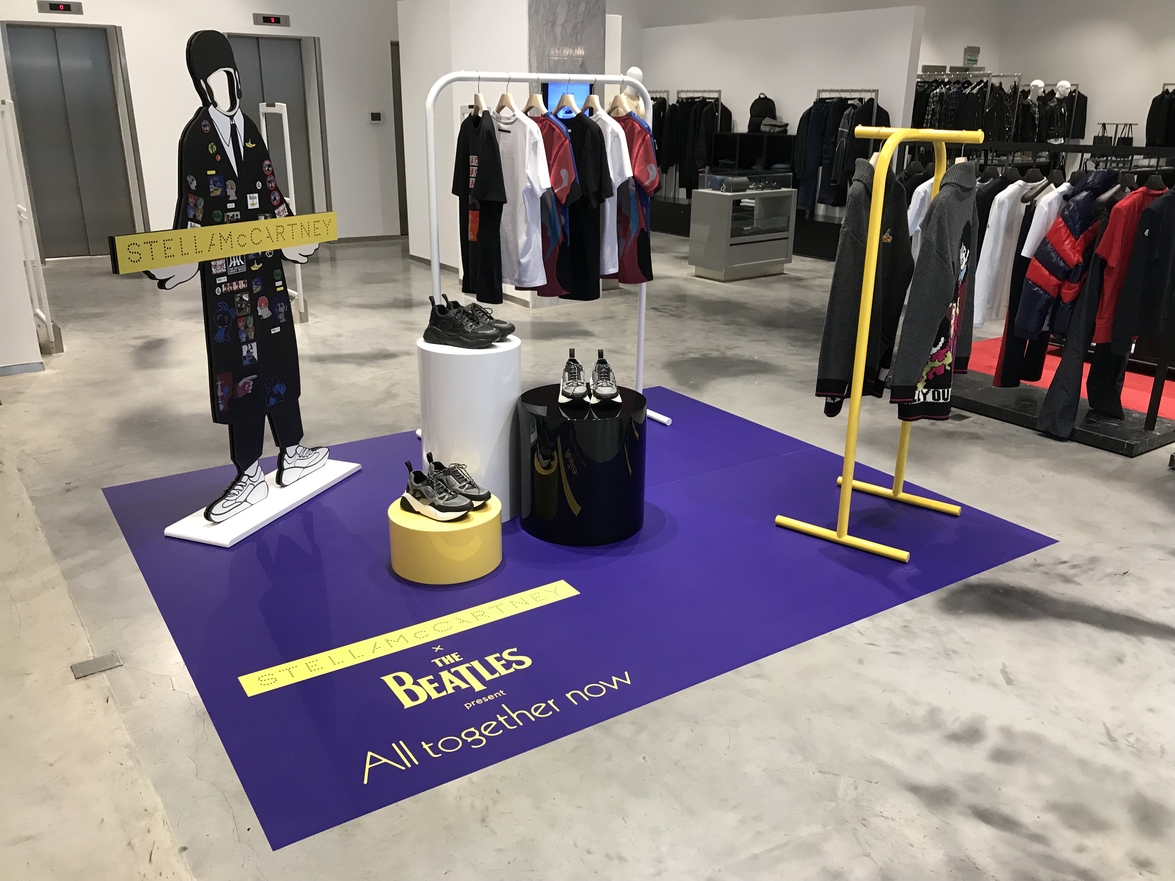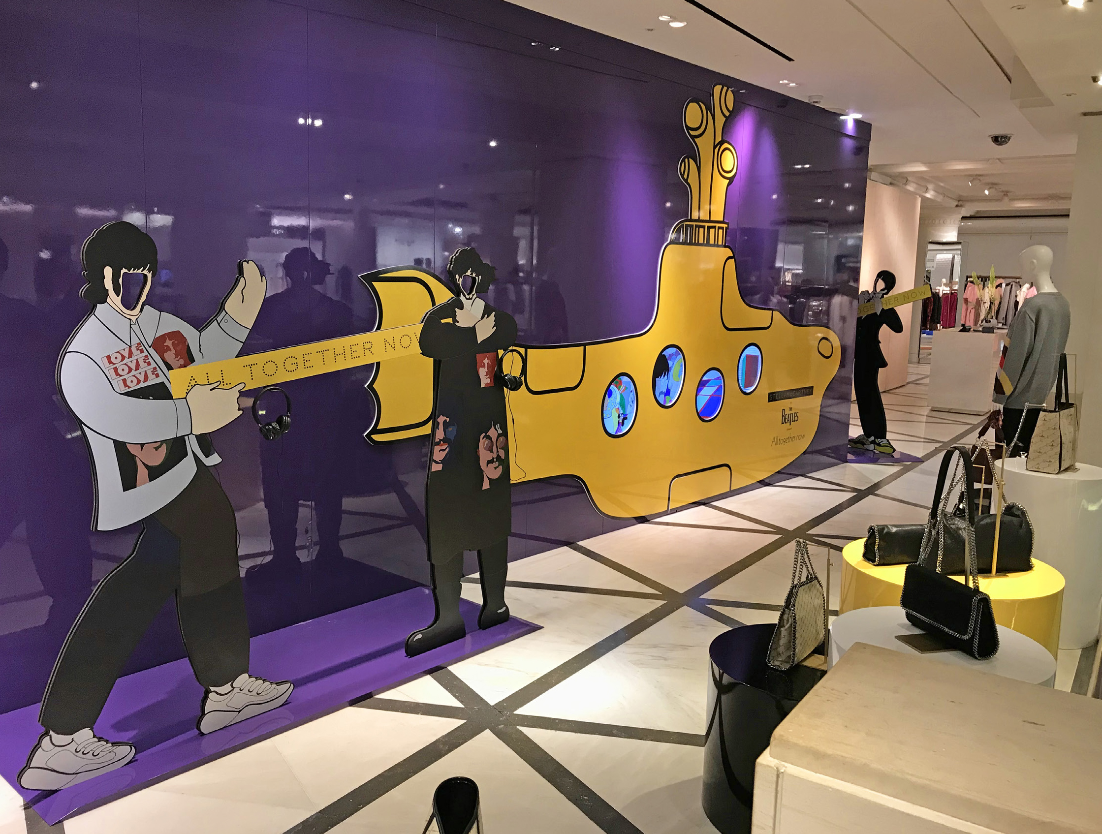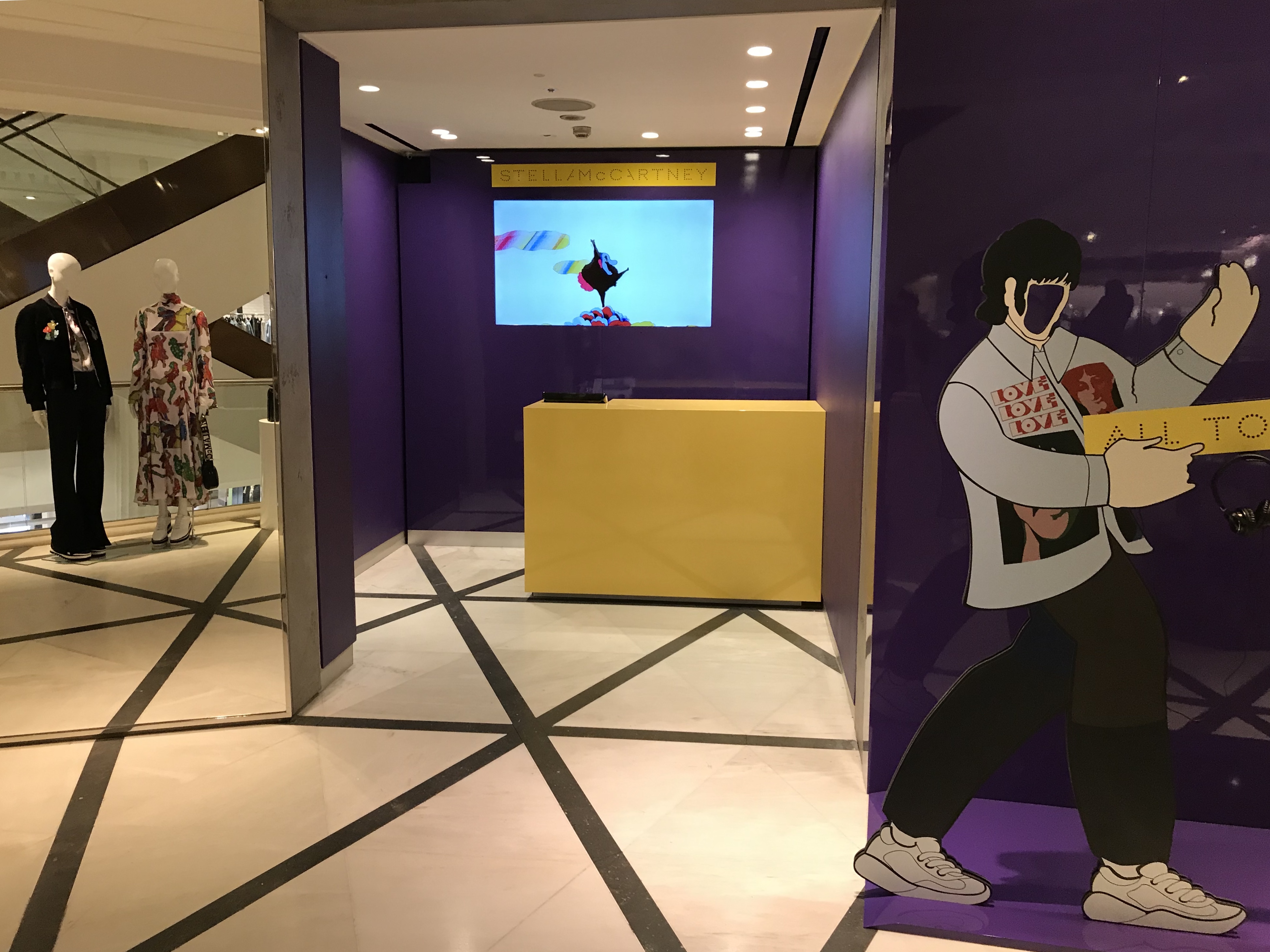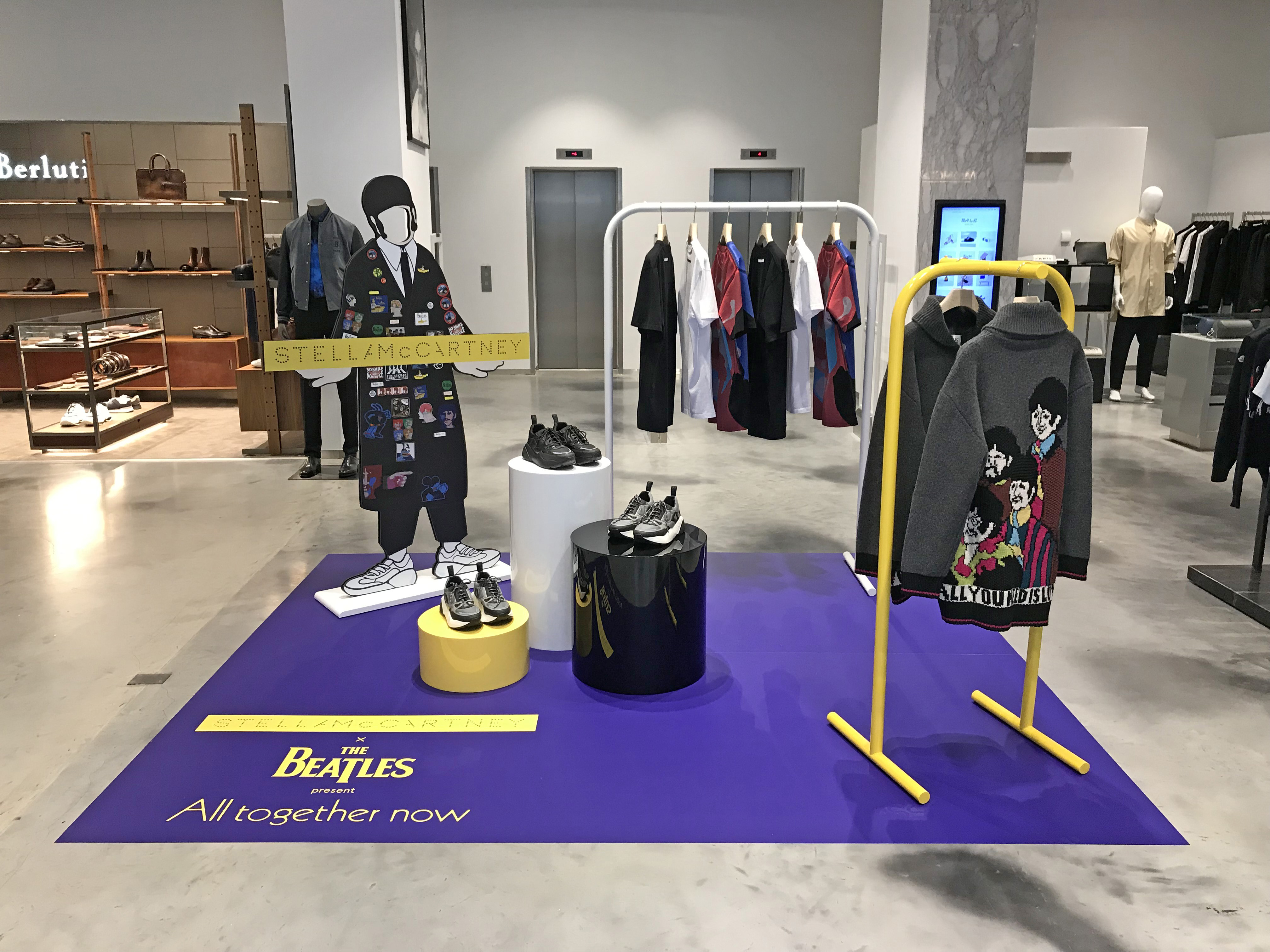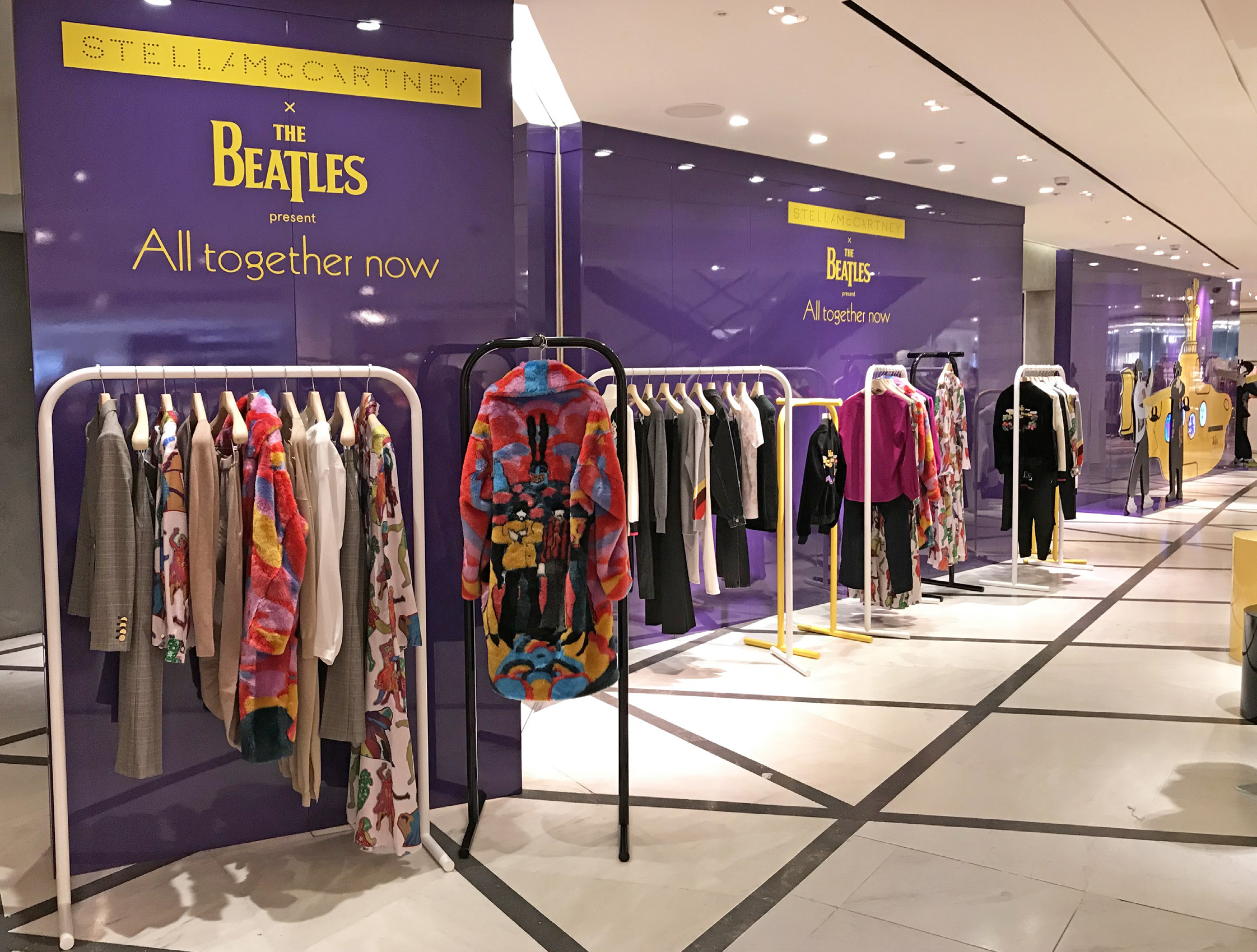 Stella McCartney Selfridges popup fashion shop display store fit Beatles Yellow Submarine 50th anniversary All Together Now print colour pop visual merchandising production bespoke retail design.