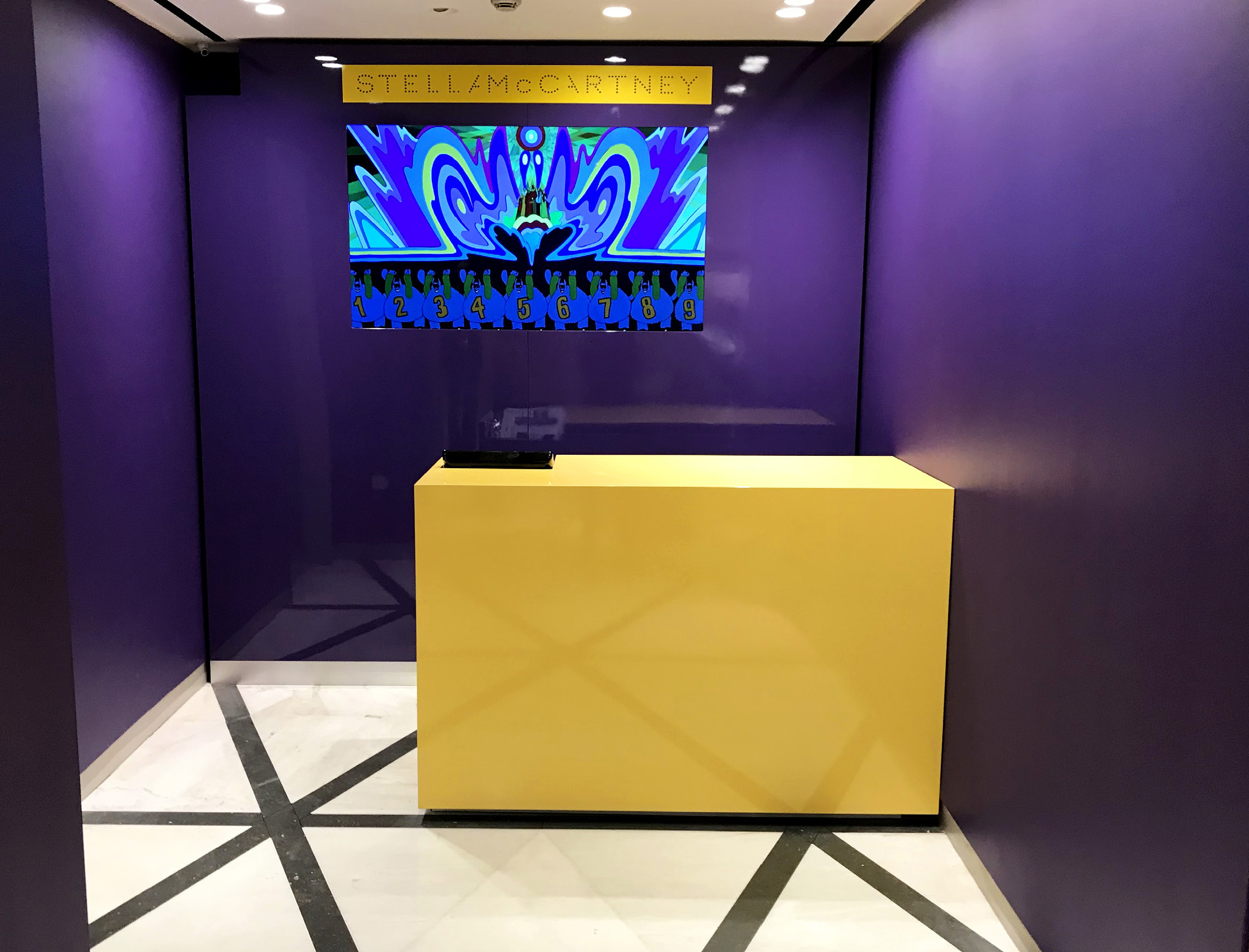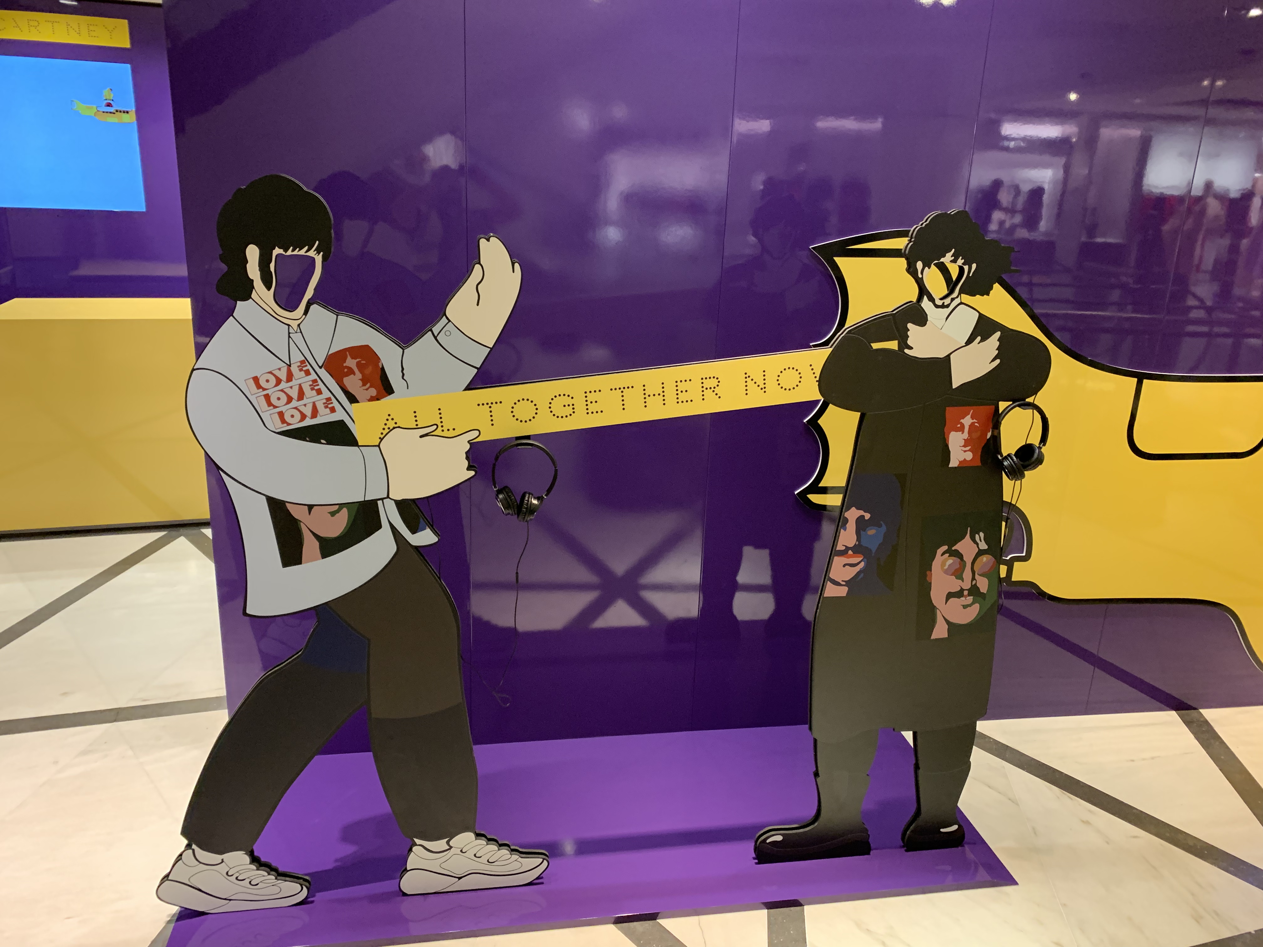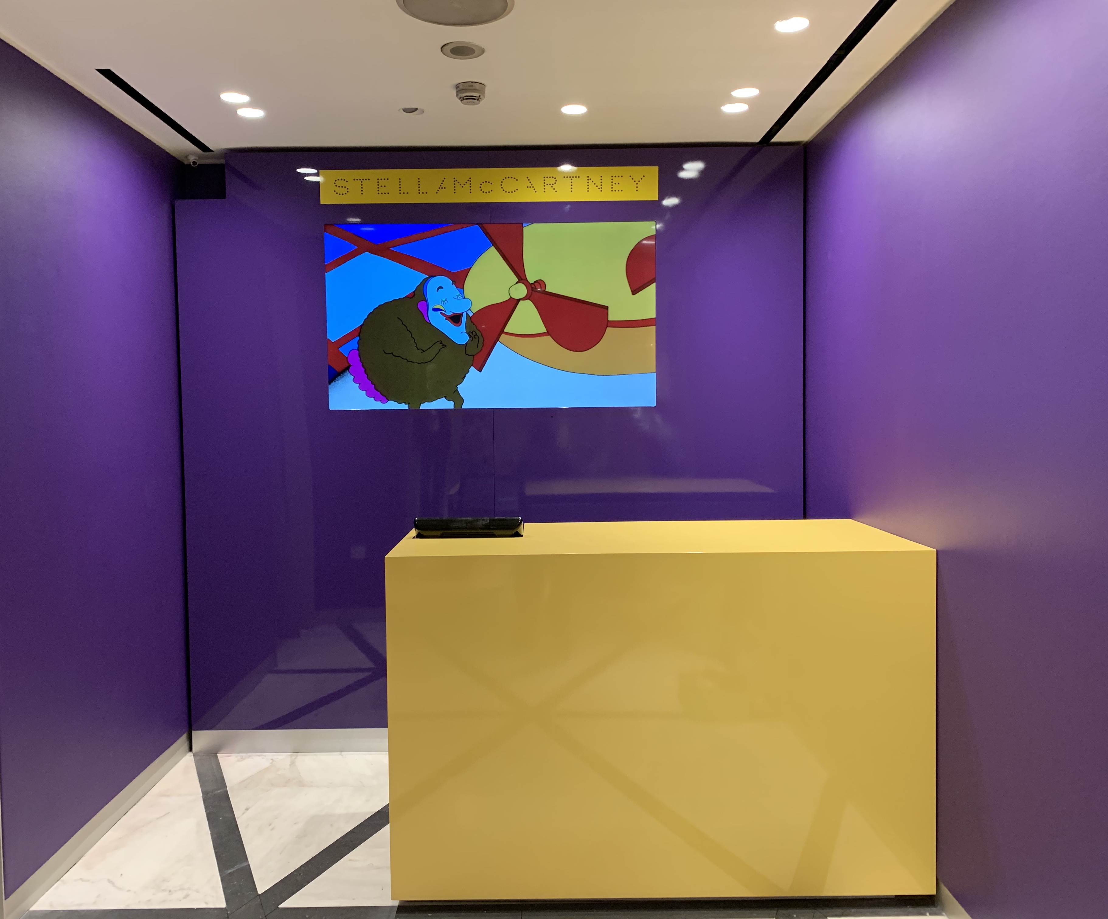 The Selfridges Pop Up has a 20-metre wide, high gloss purple wall showcasing a fabulous Yellow submarine, with the film playing though the portholes. The cash desk adds a pop colour of bright yellow and a giant screen above shows more footage from the film.