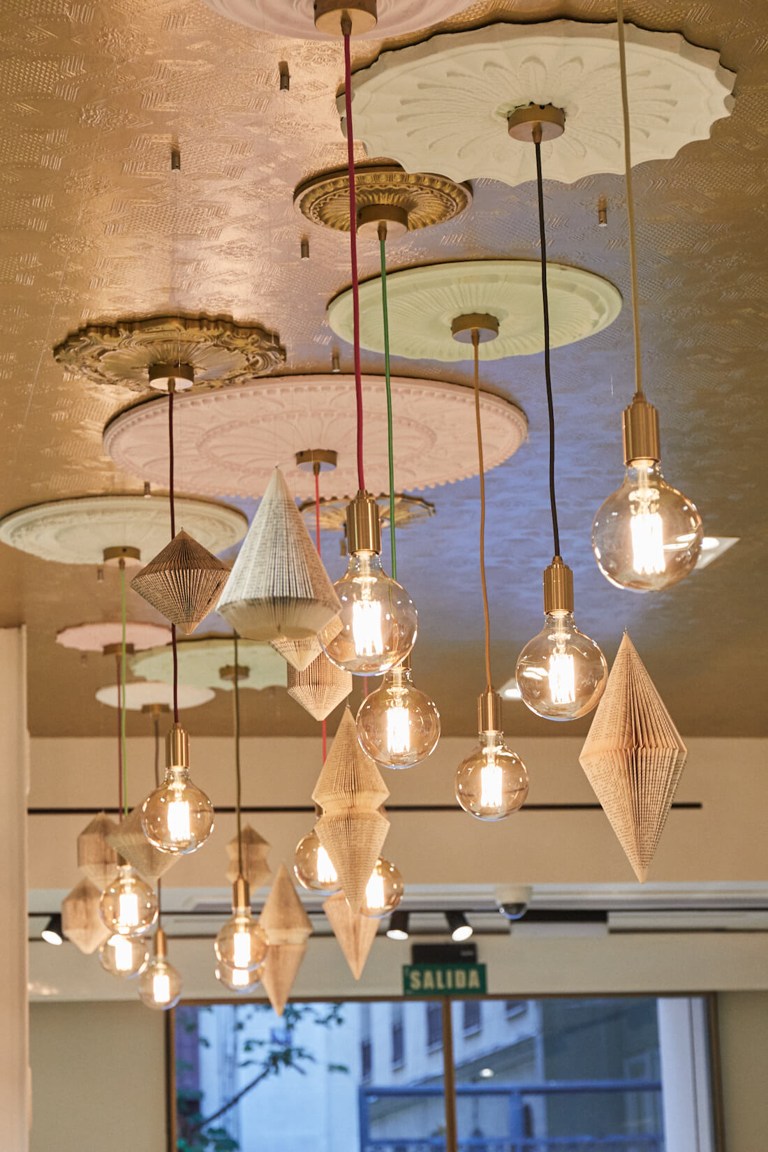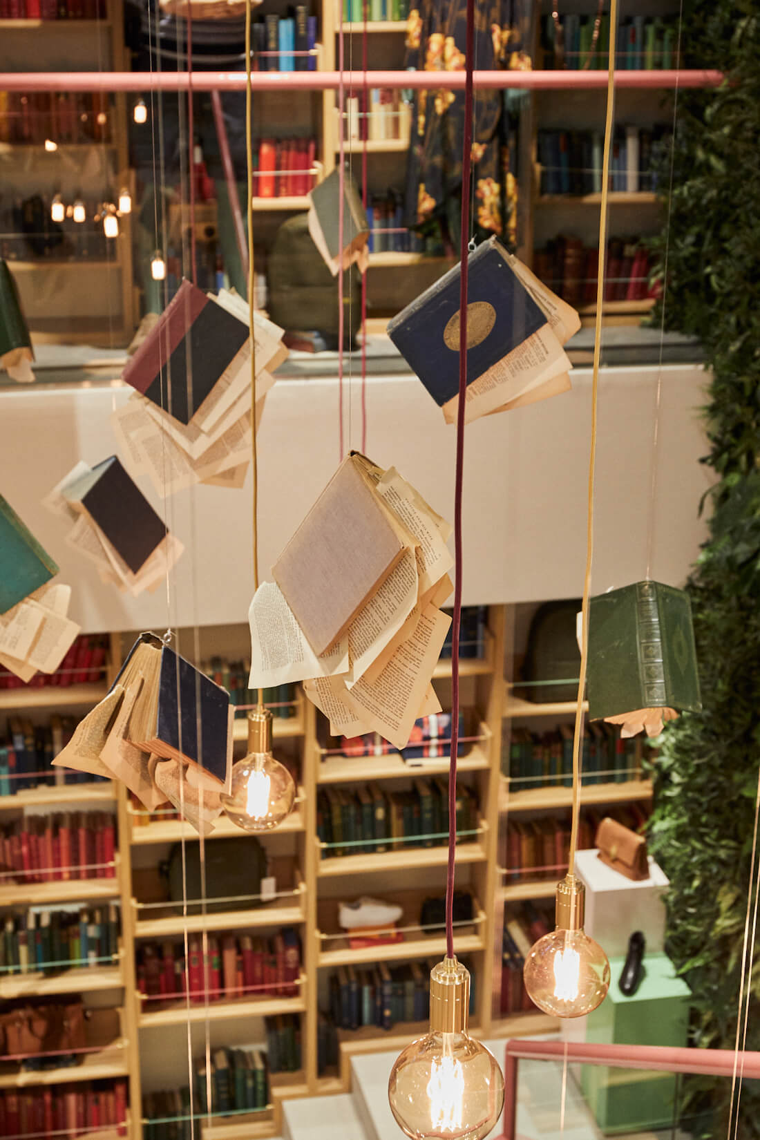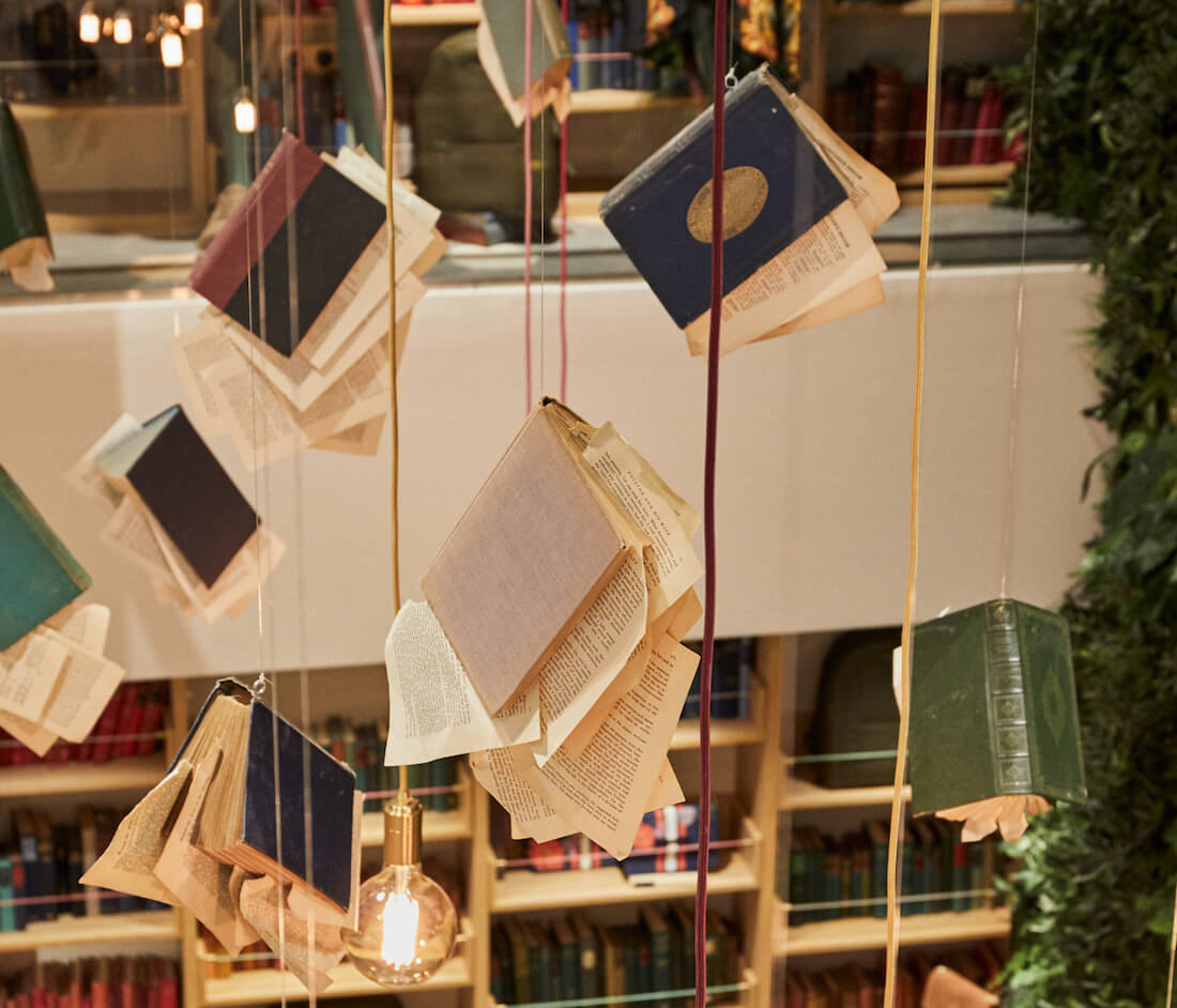 A large-scale book sculpture sits in the entryway- a burst of books, pages flying out into the room. Bell jars filled with quills, letterpress stamps, inkwells and candles bring the theme to life. The store is topped off with hand crafted hanging book sculptures fixed to the ceilings.