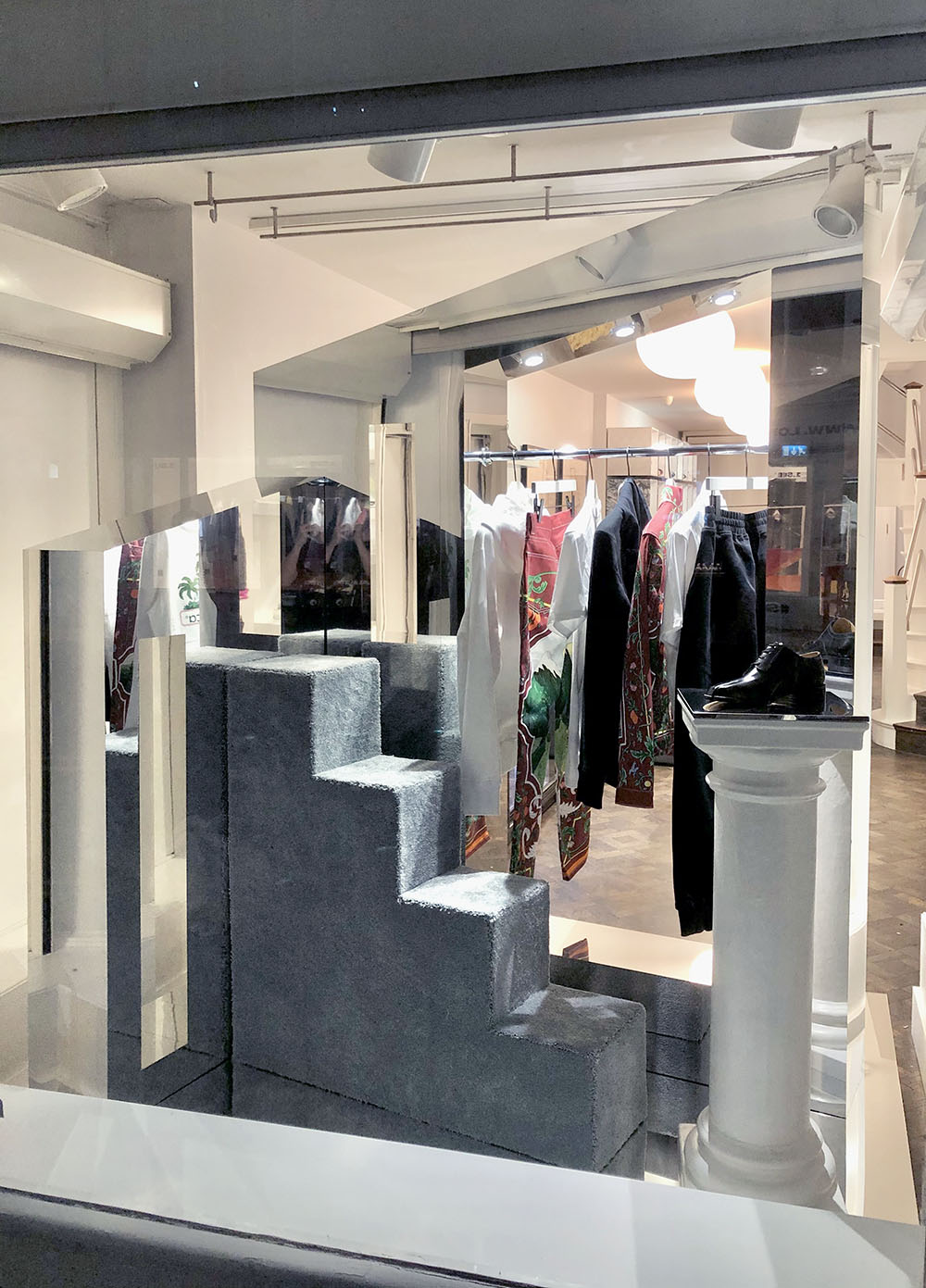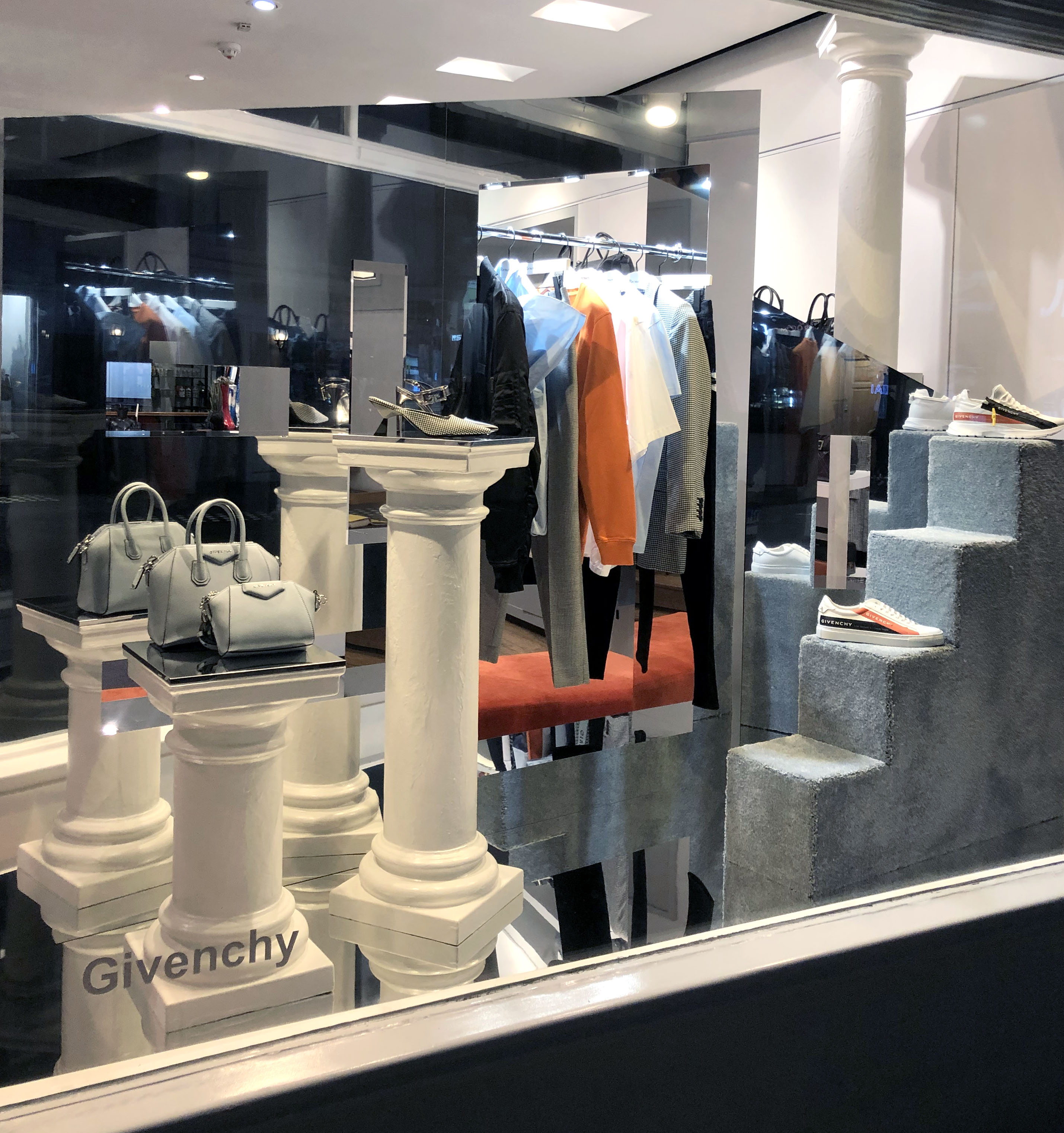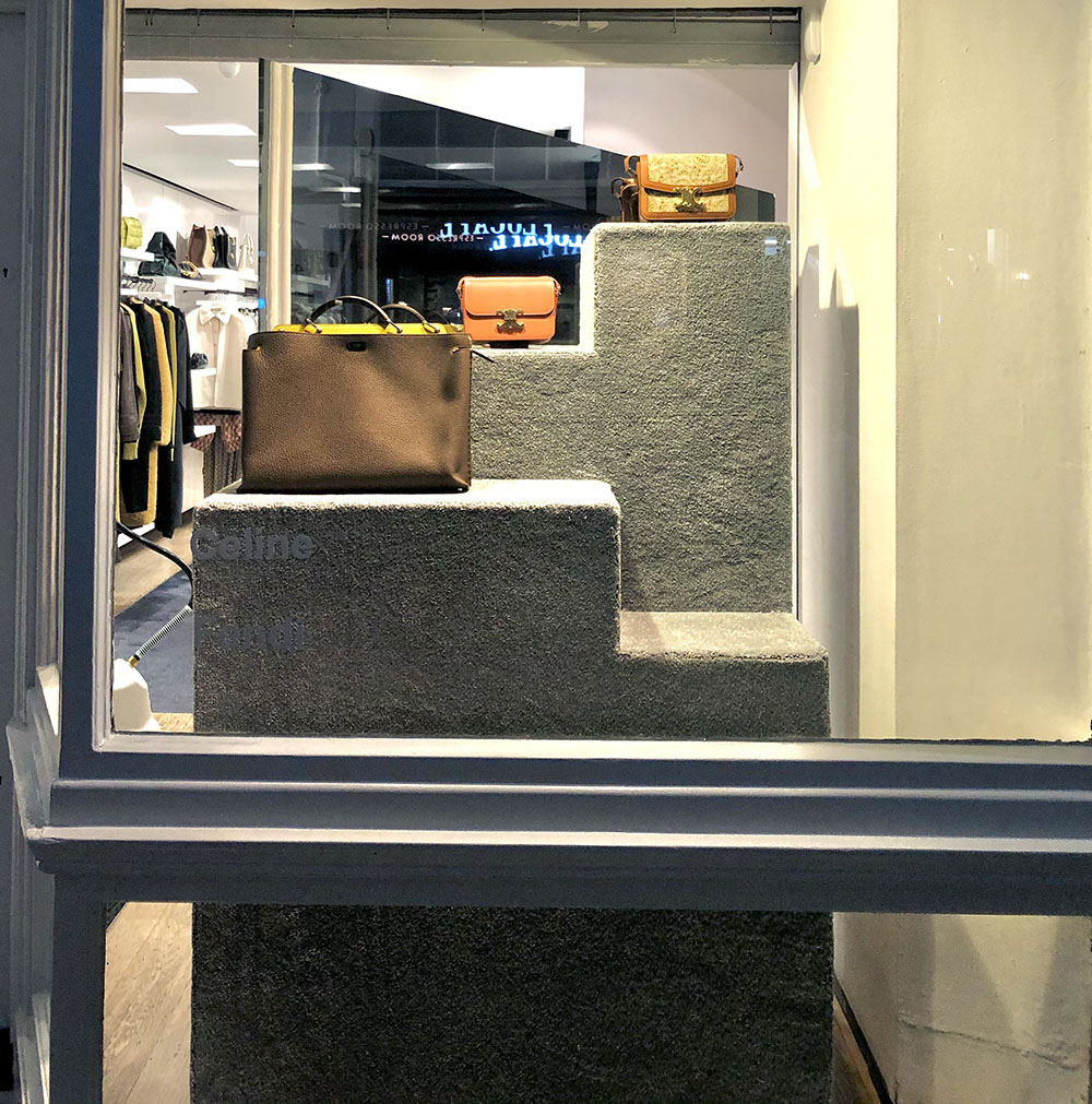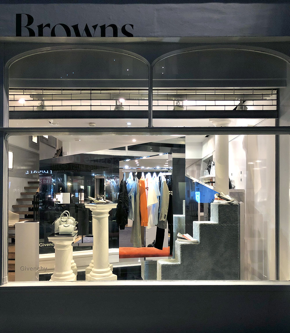 To celebrate the milestone, Browns’ design team provided us a brief to make a mix of venetian plaster and chromed effect columns, mirrored abstract shapes and carpeted steps that were utilised as plinths for designer accessories launch.