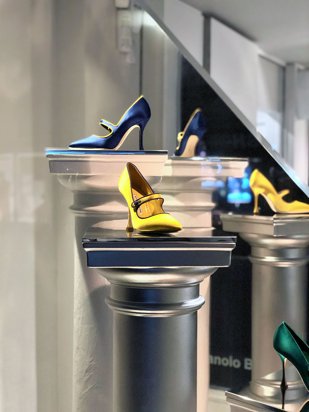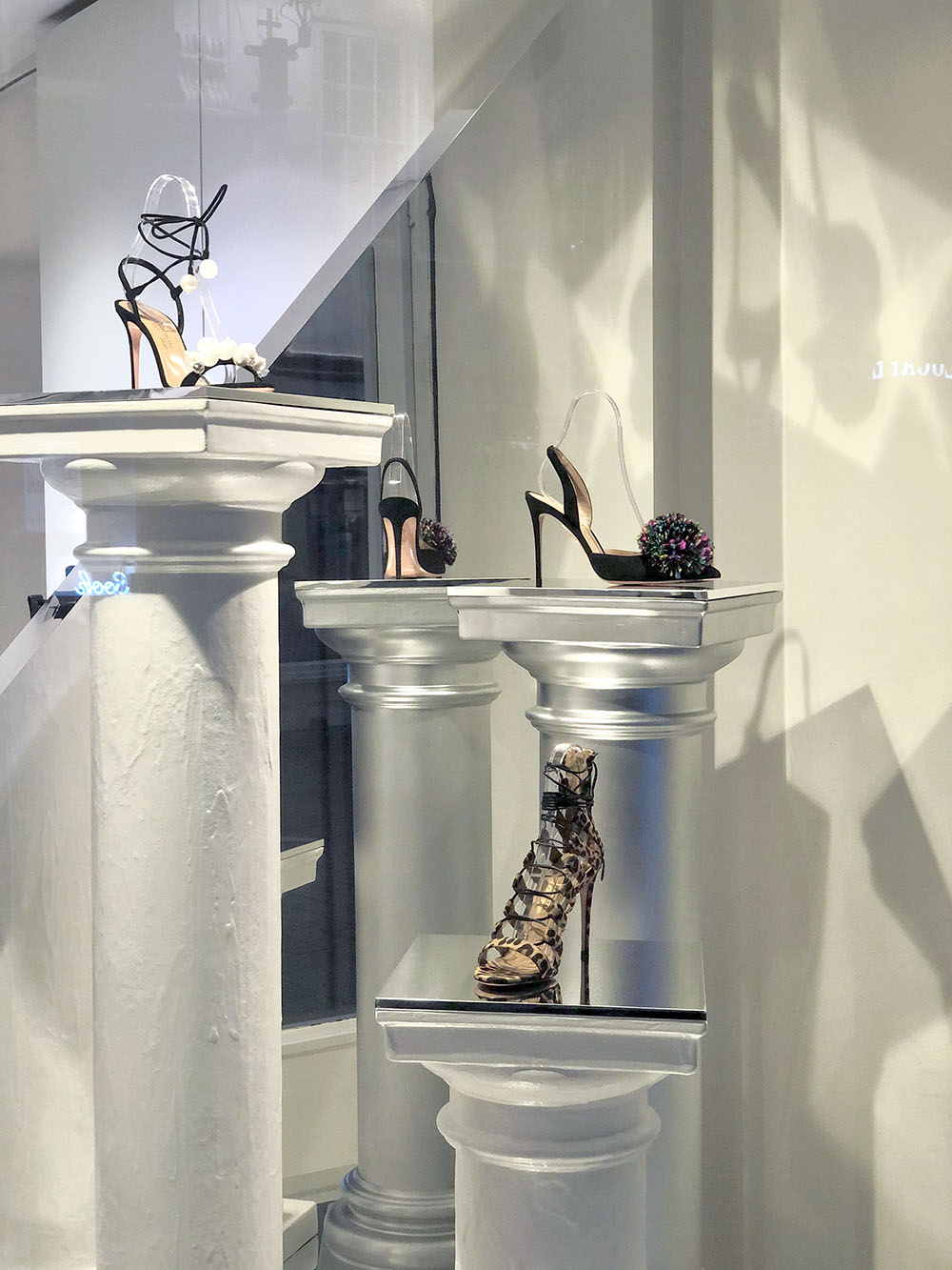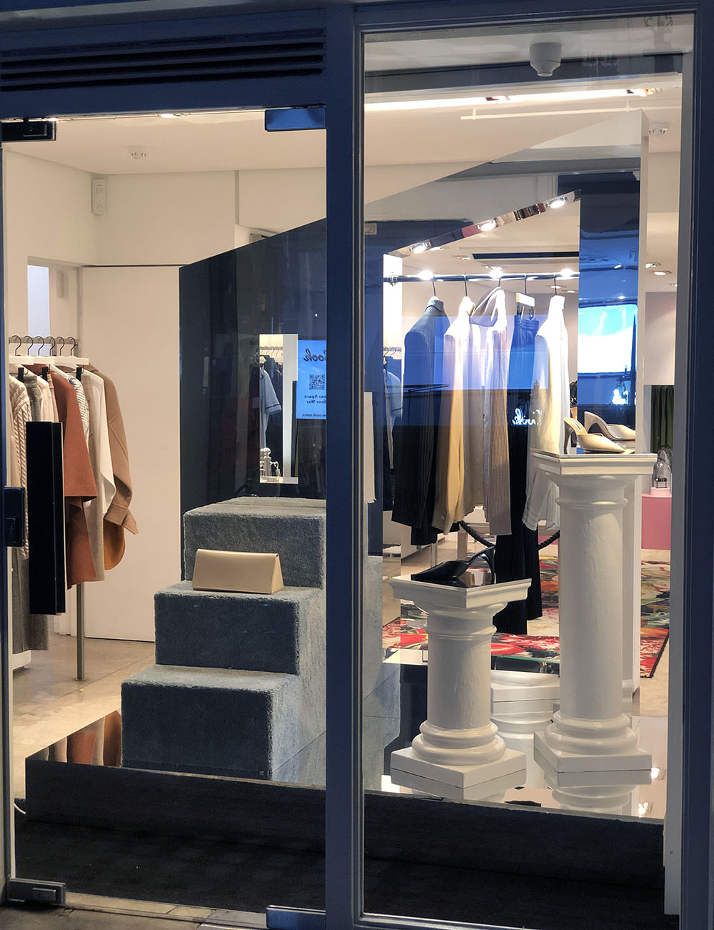 To celebrate the milestone, Browns’ design team provided us a brief to make a mix of venetian plaster and chromed effect columns, mirrored abstract shapes and carpeted steps that were utilised as plinths for designer accessories launch.
