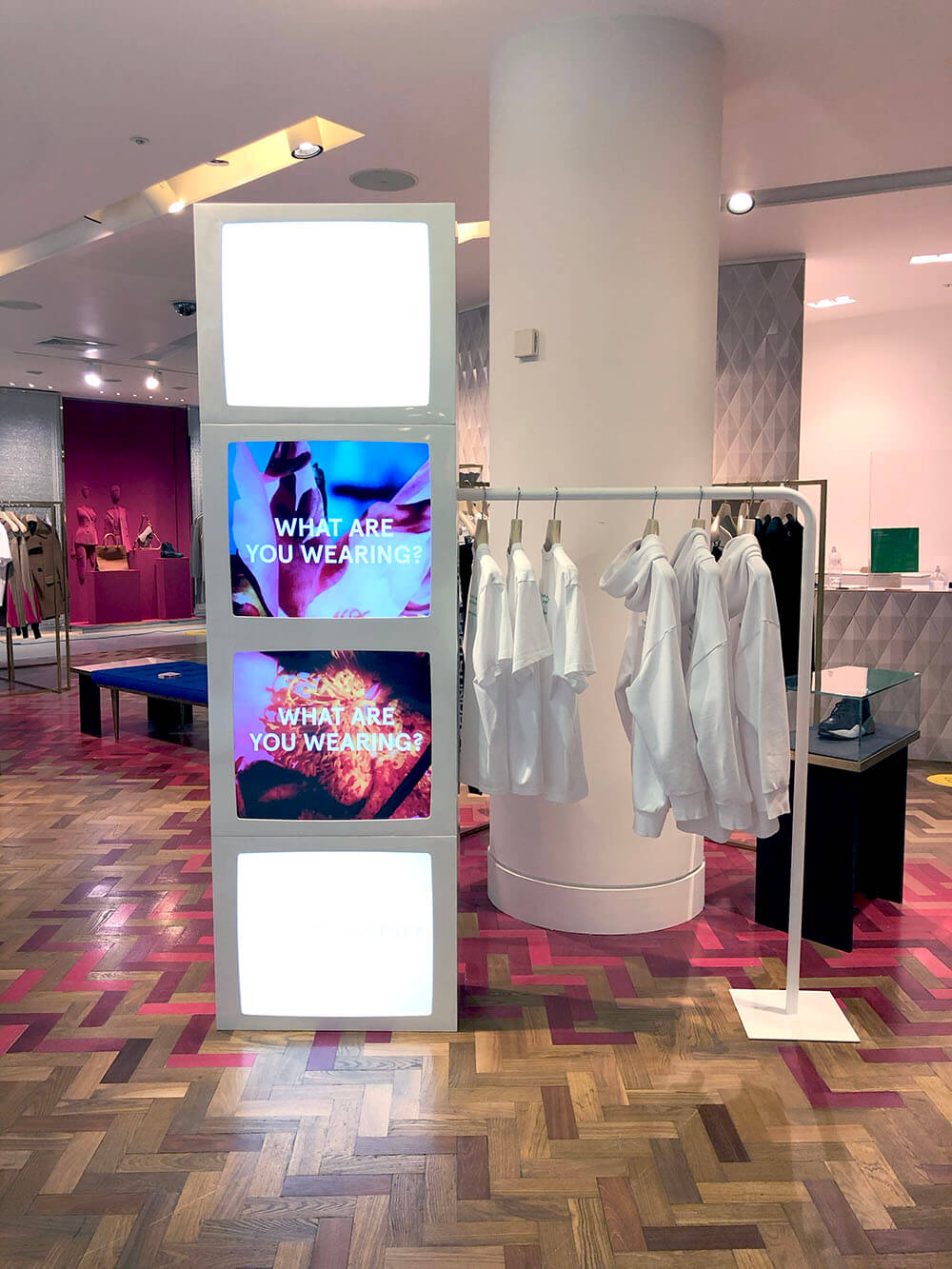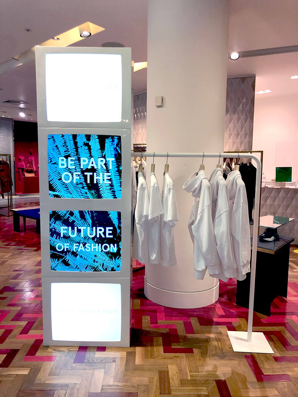 As fashion is pushing towards a sustainable future, this year Stella McCartney focused on sustainable cotton, their showcase focused on a digital display that questions the use of cotton. For this display we re-sprayed and redesigned previous props to house the digital display whilst doubling up as a rail to hang clothes on. Hello Flamingo manufactured this and installed these into Selfridges.