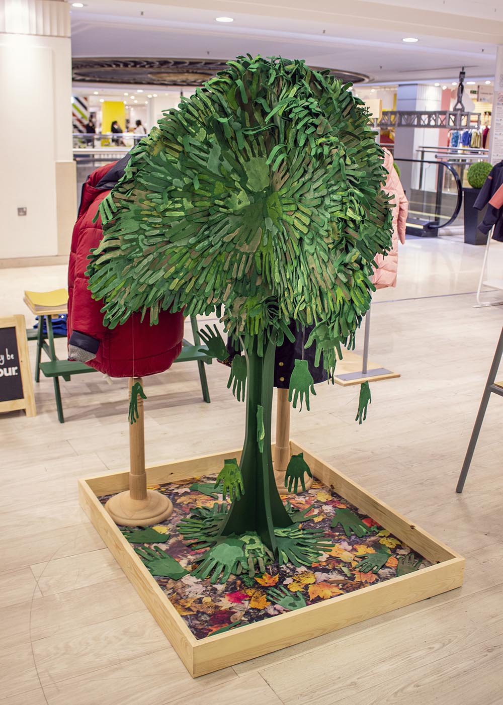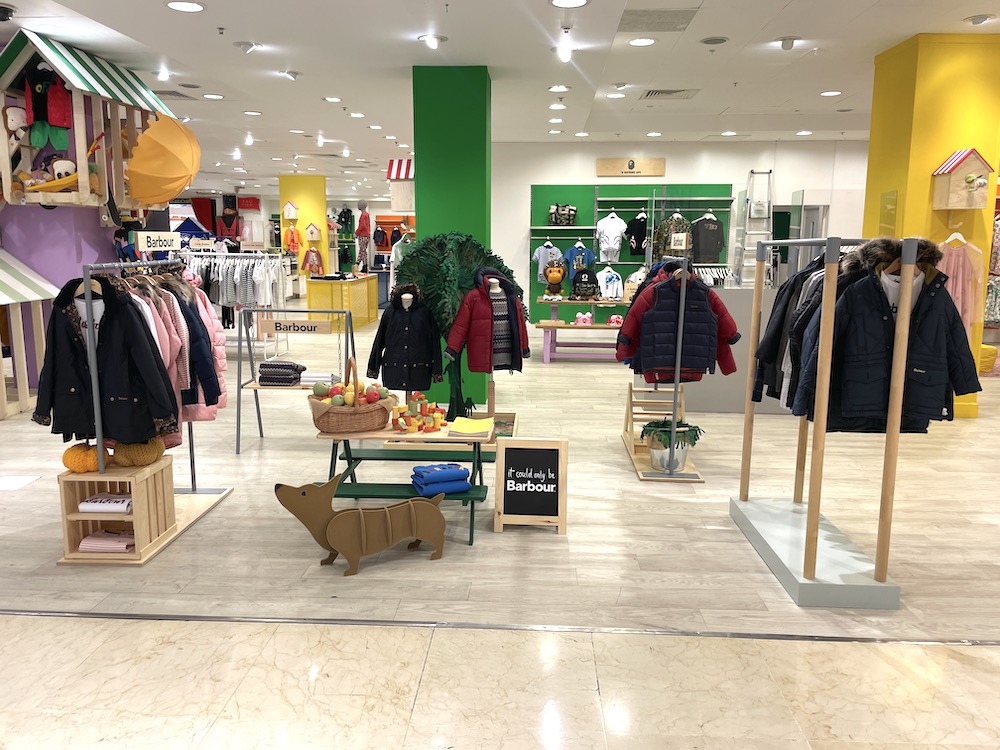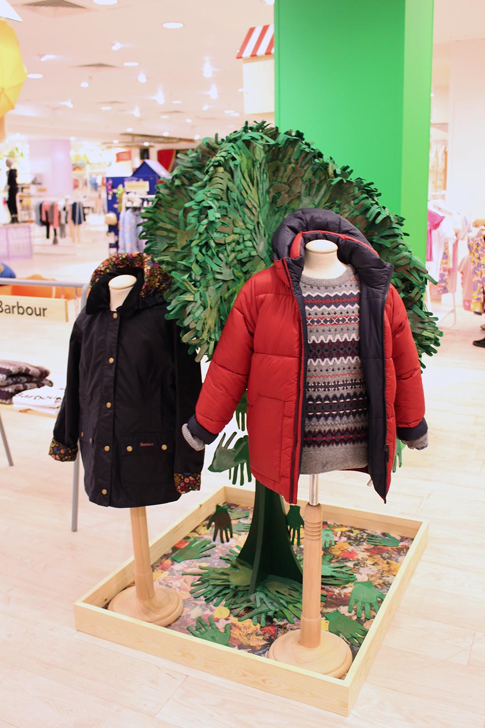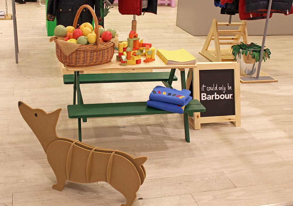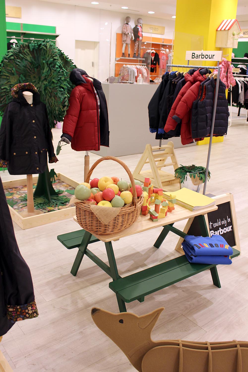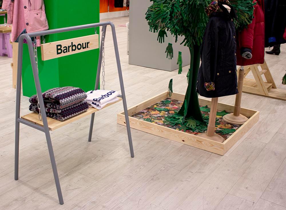 For their Autumn Childrenswear campaign, Barbour brought the fun to Selfridges and we worked with them to build a playground themed space, complete with bespoke rails that resembled climbing frames, swings and monkey-bars! Other playful features we produced included a tree with leafy handprint props accompanied with handmade crochet pumpkins, apple bushels and wooden block toys.
