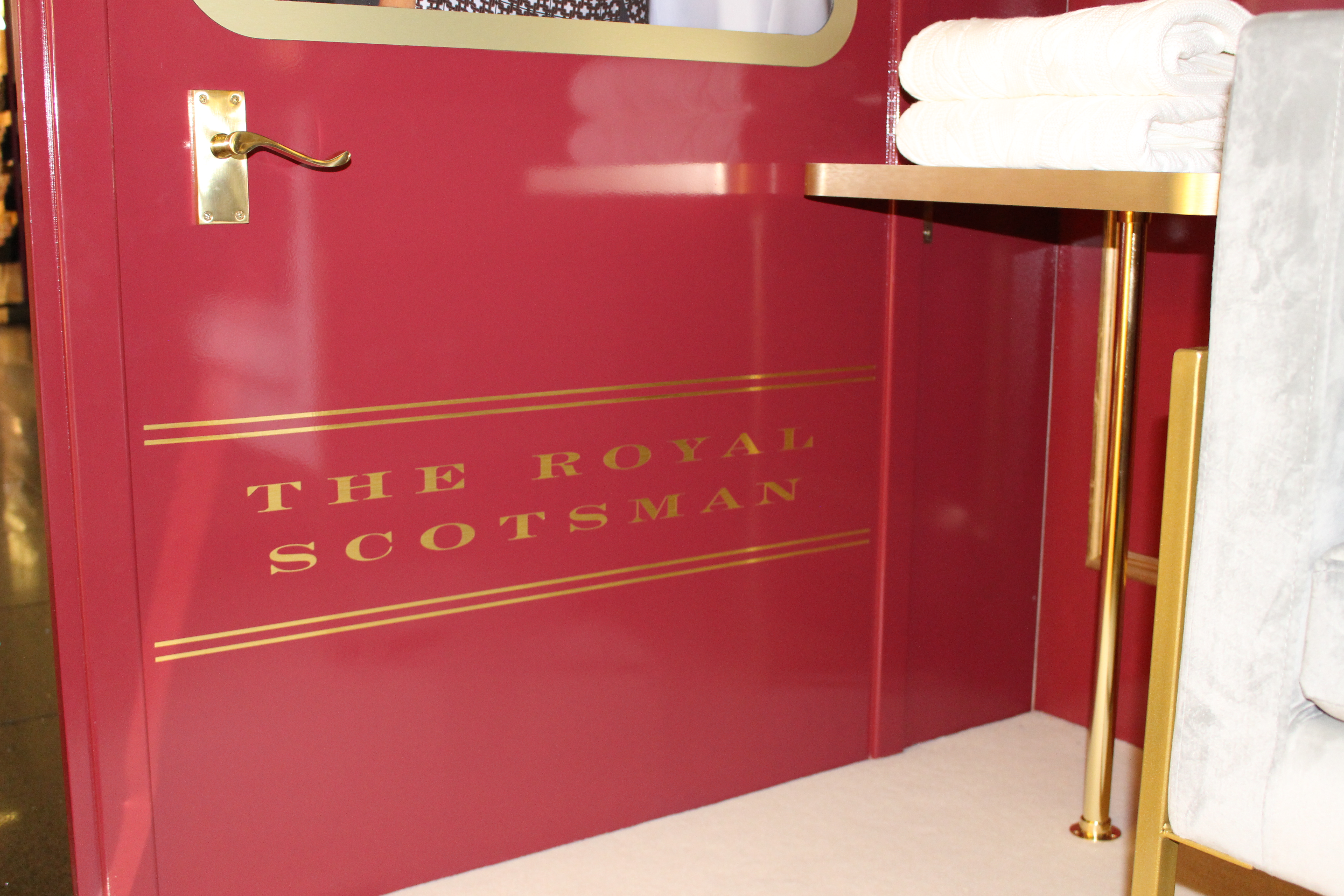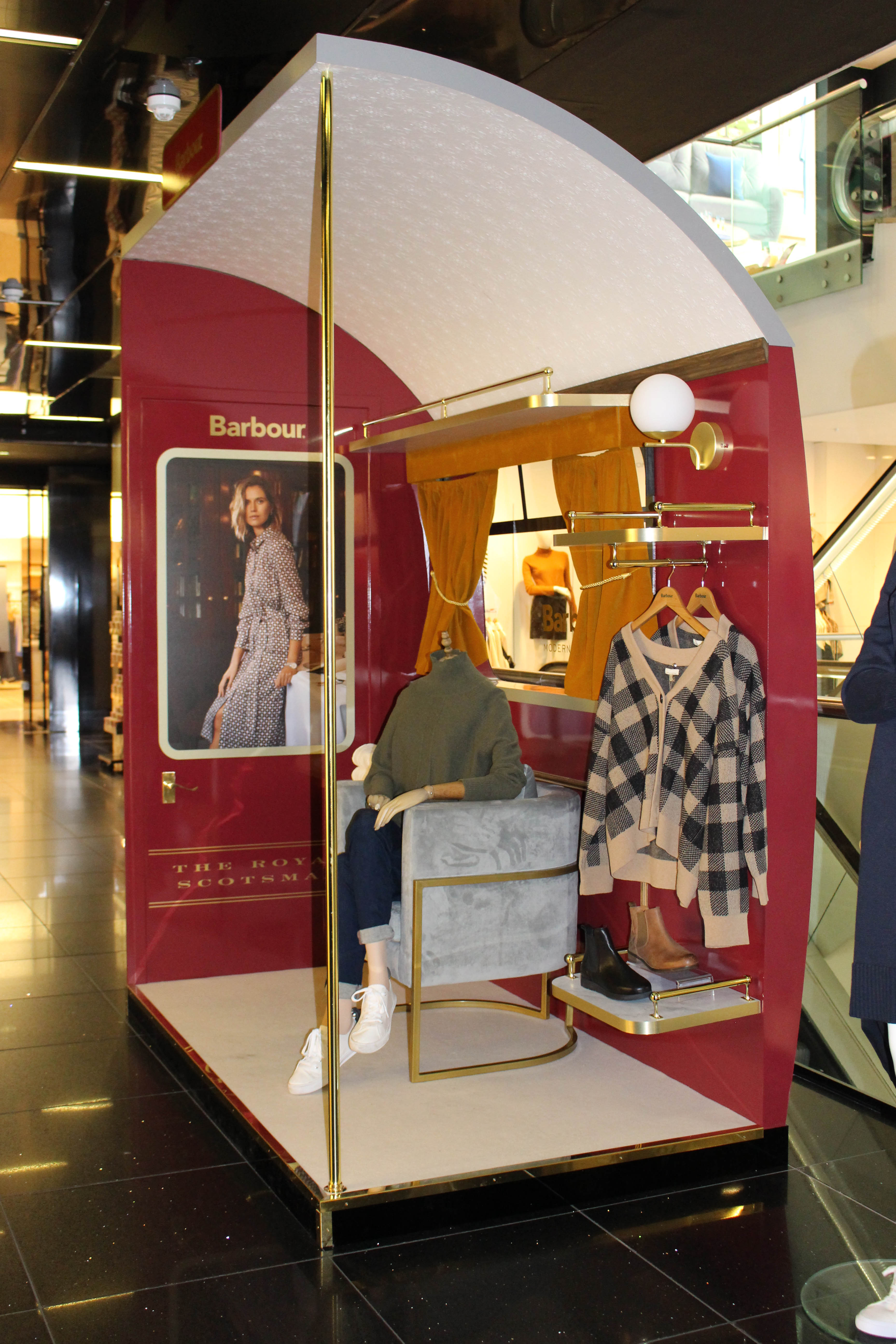 We were lucky enough to produce these Royal Scotsman inspired carriages for the Barbour stores and pop up versions in the House Of Fraser Department stores in Bristol, Glasgow, Manchester, London Oxford Street and Lakeside. The carriages are painted in a deep maroon colour, paying homage to the train’s original paintwork, and is complete with a traditional overhead luggage rack, rounded table and light fixing, alongside brass finishes and edging. We included the plush curtains for the windows and the smooth grey velvet seating to give emphasis to the luxuriousness of the brand, while the window scene graphic of the Scottish countryside perfectly encapsulates the legacy of the high end brand.
